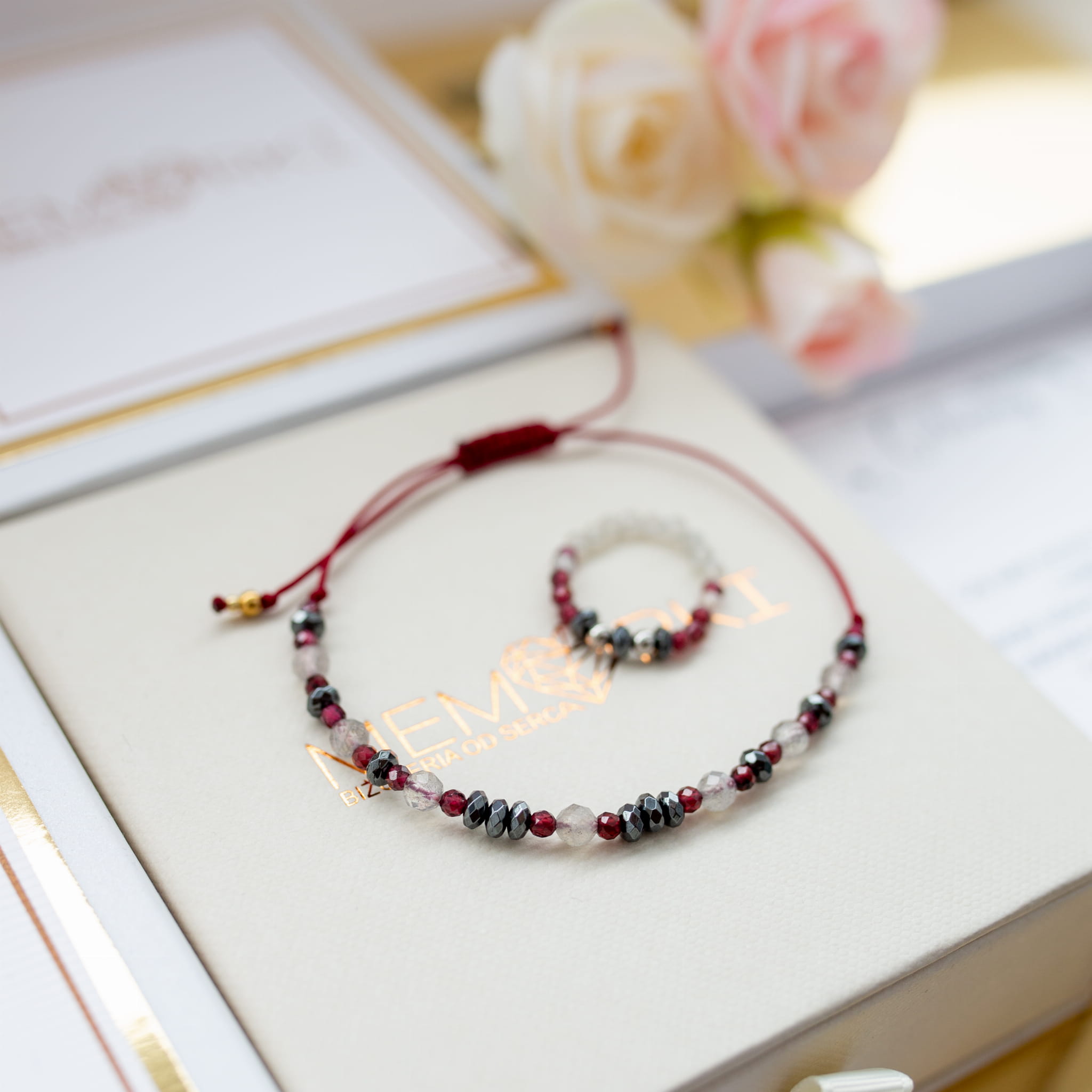 - Materiał 1: sznurek jubilerski w kolorze bordowym