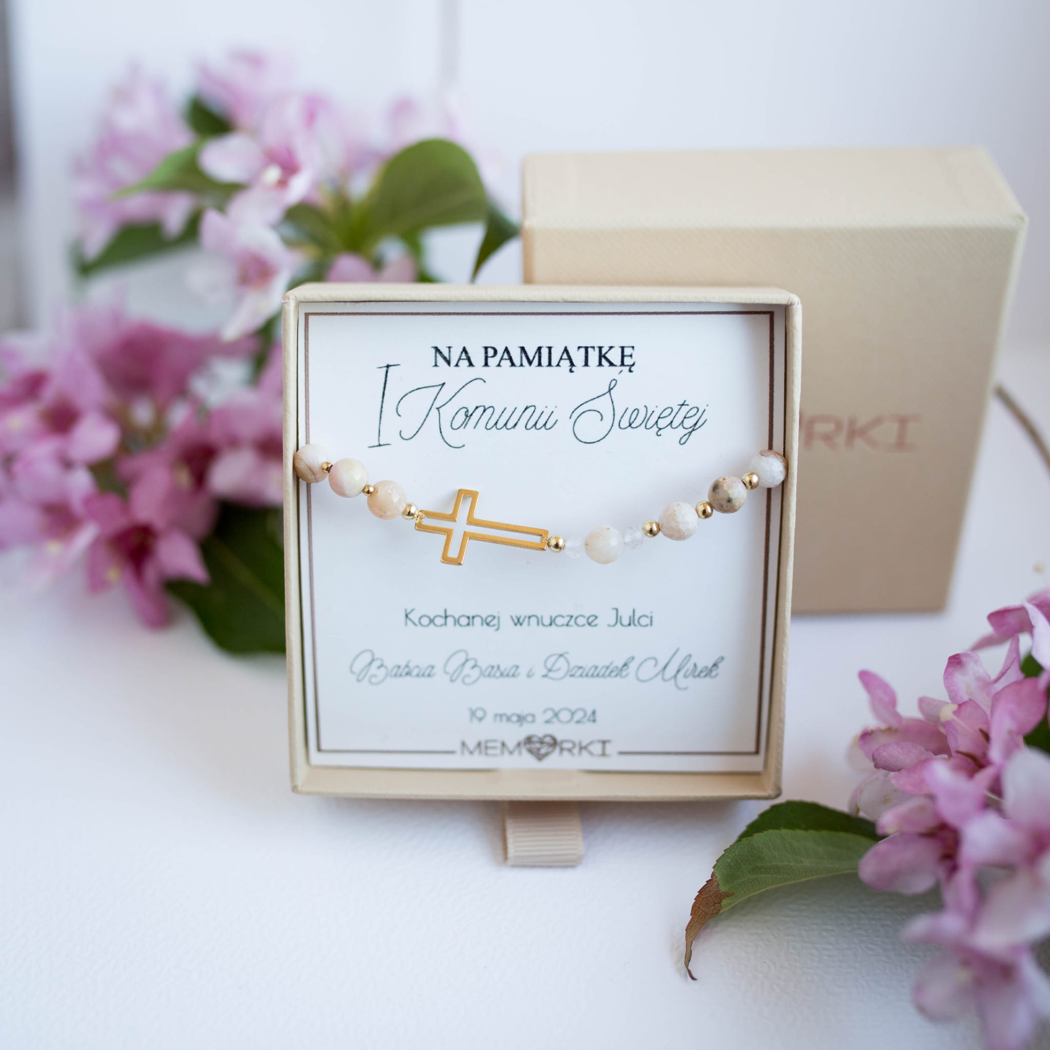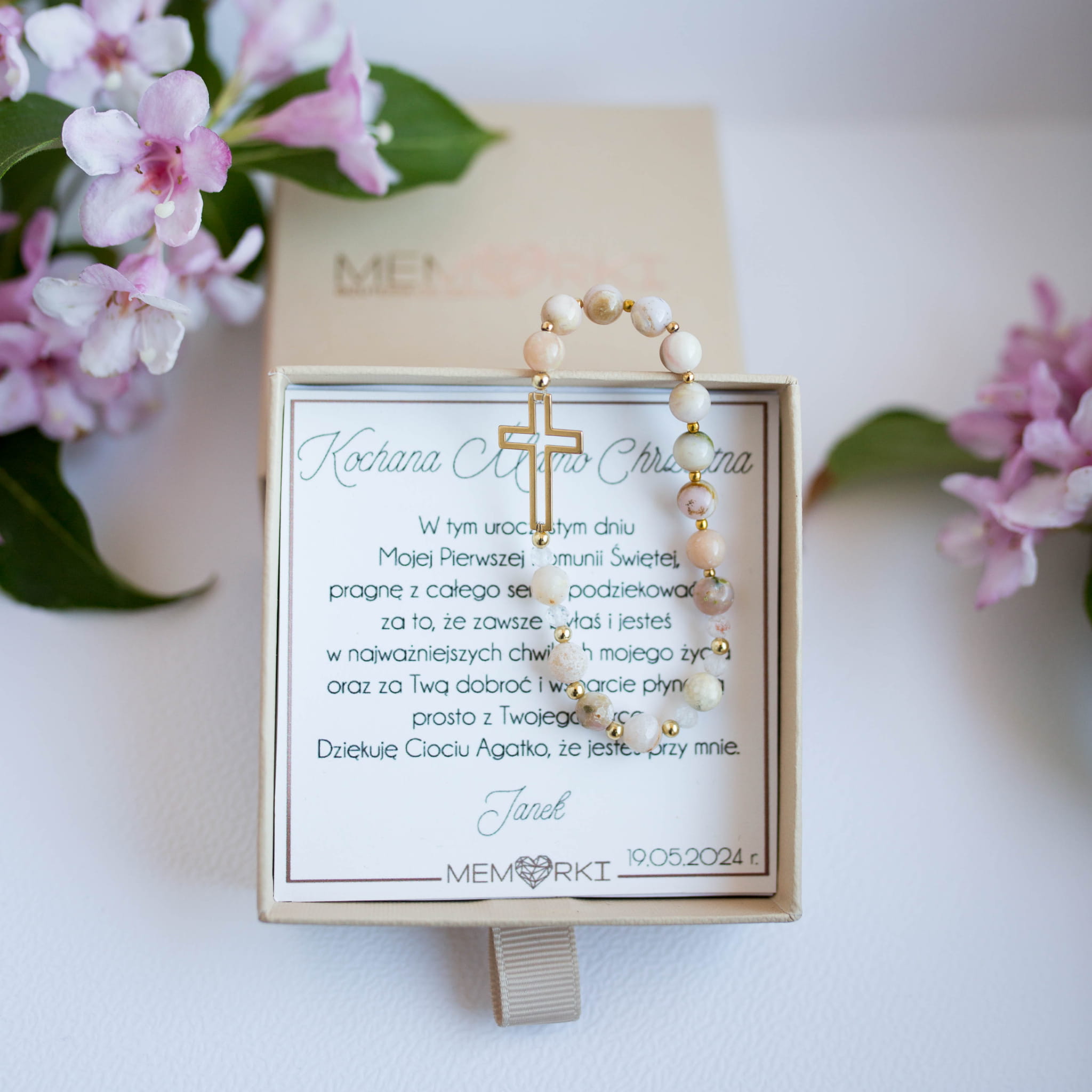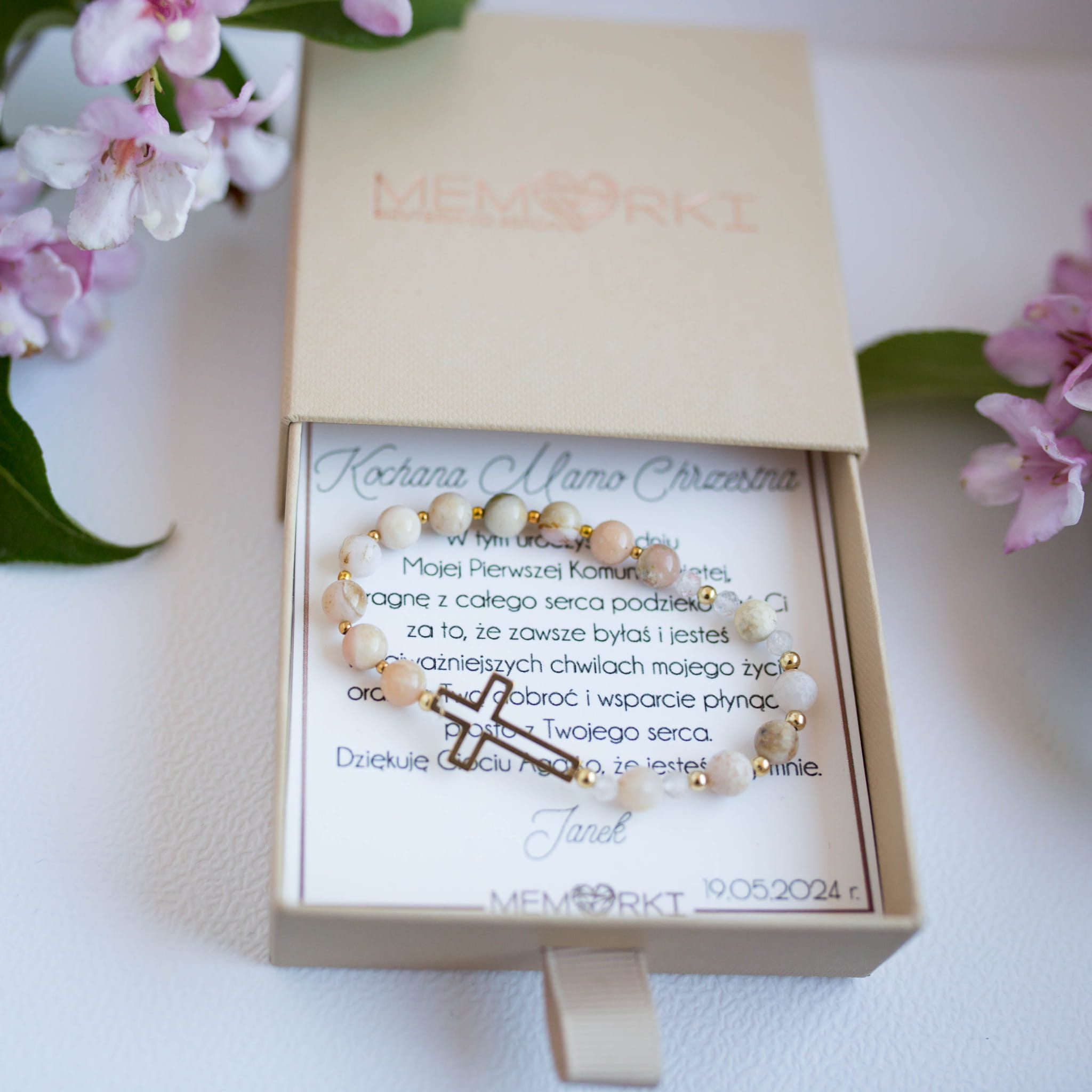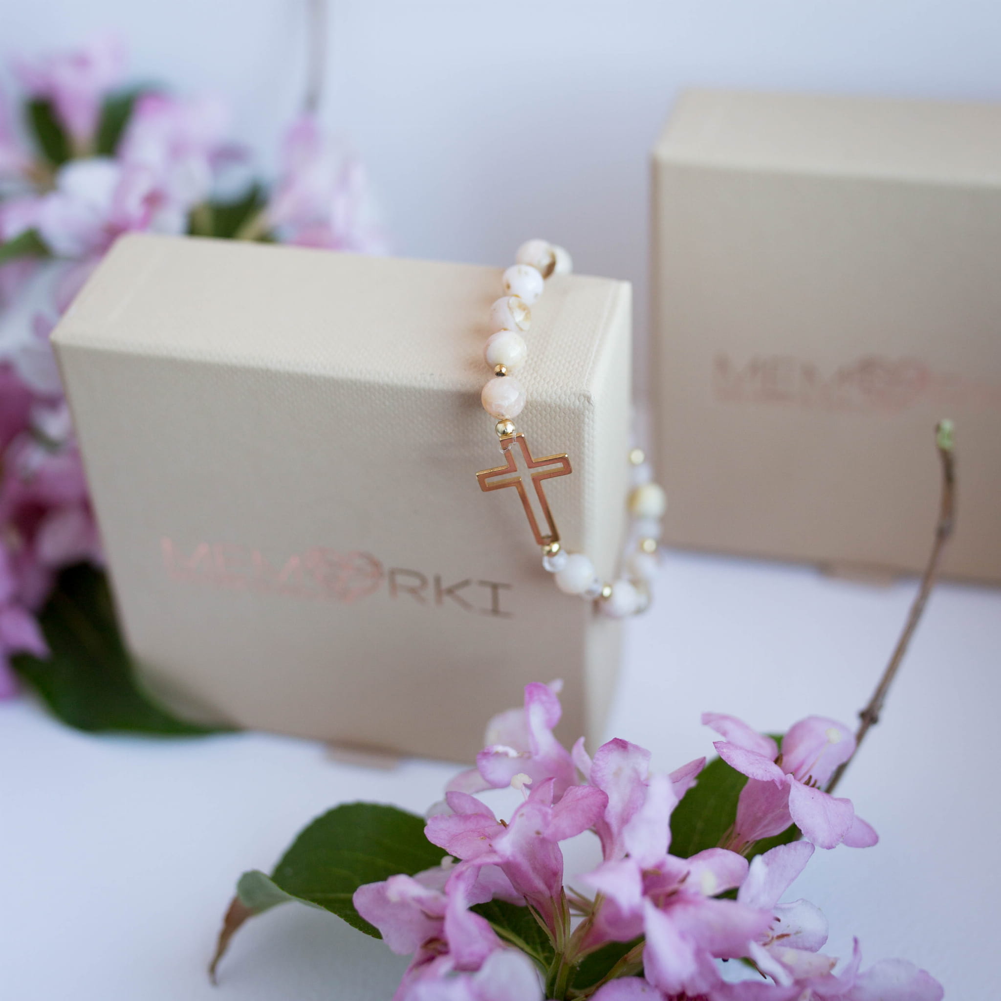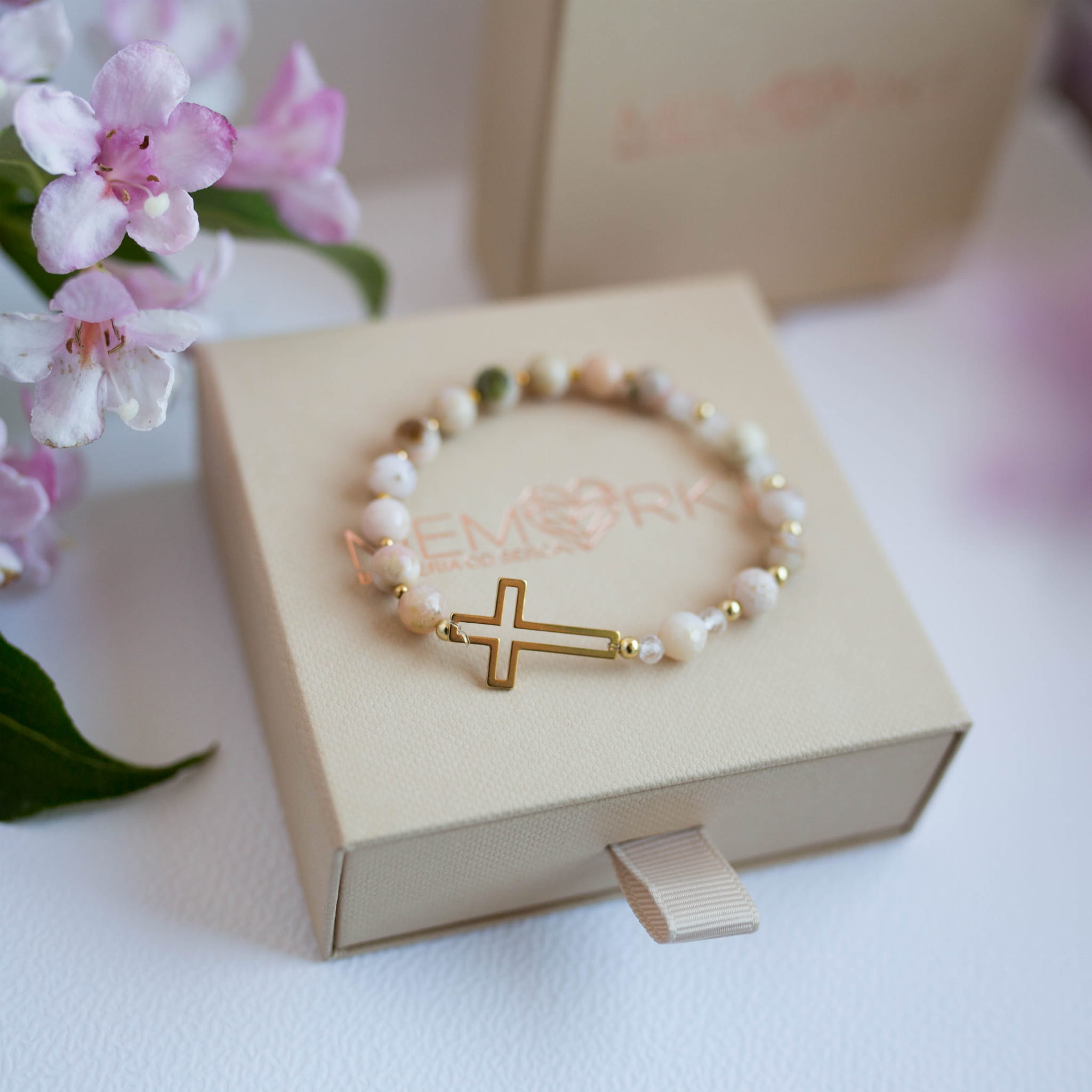 Misternie nanizane na bardzo wytrzymałą i elastyczną gumkę jubilerską kamienie naturalne w połączeniu z delikatnym krzyżykiem i stalą chirurgiczną sprawdzą się doskonale jako drobiazgowa pamiątka z okazji Chrztu, I Komunii Świętej czy Bierzmowania.