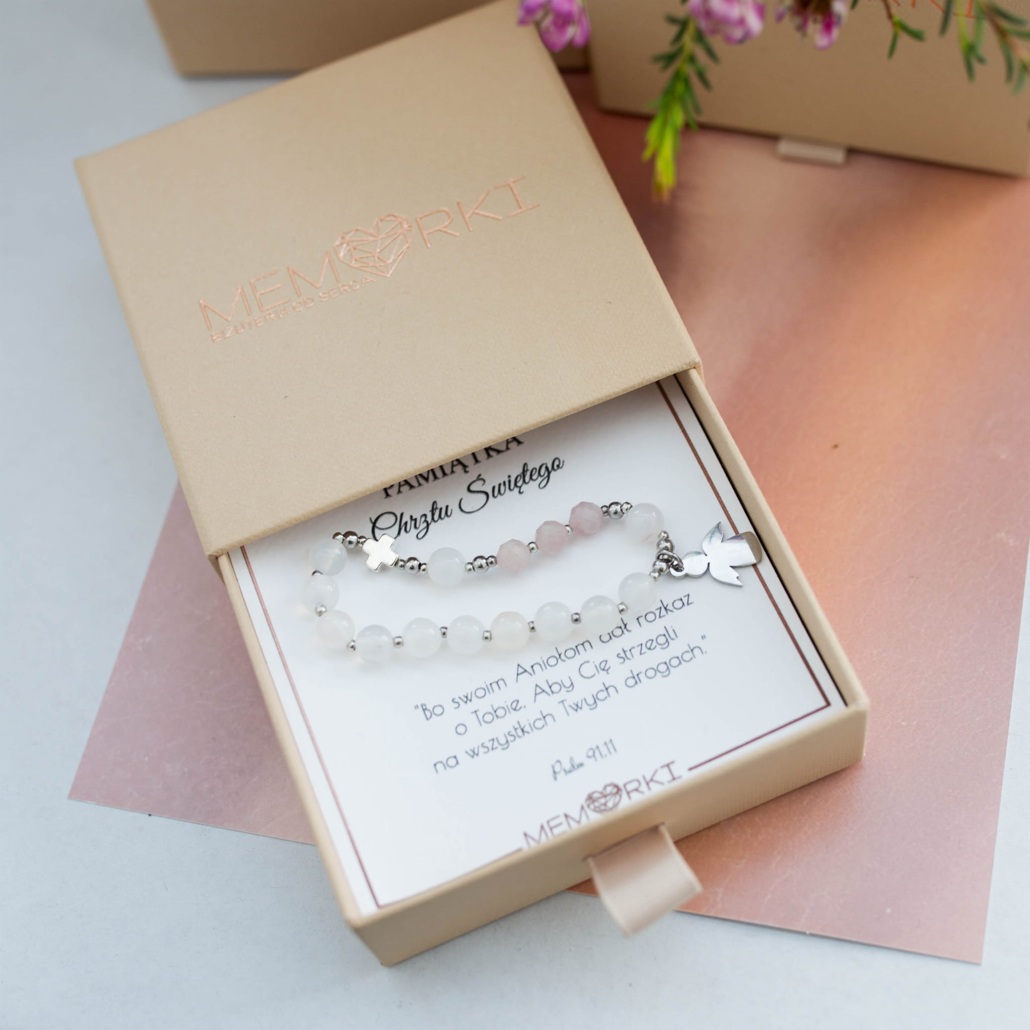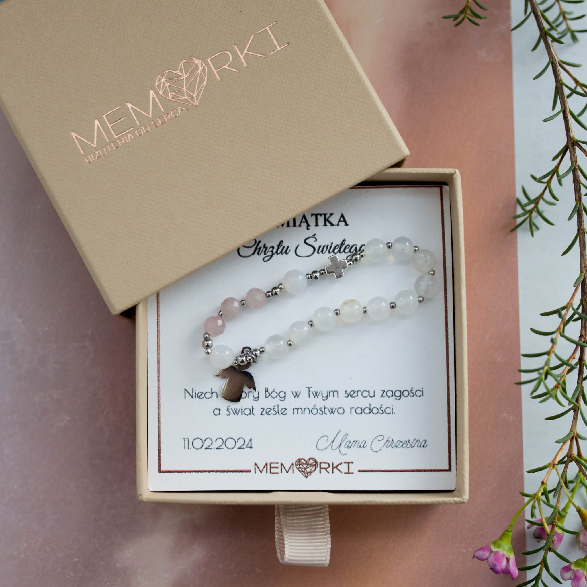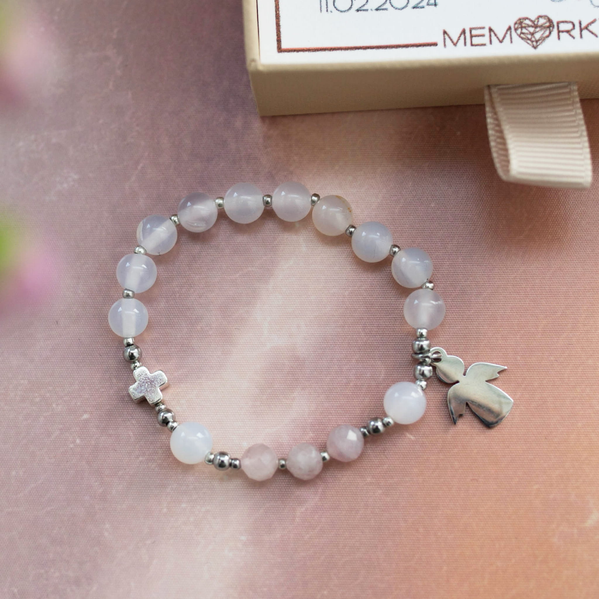 Misternie nanizane na bardzo trwałą gumkę jubilerską kamienie naturalne (ok.6mm) w połączeniu z hematytowym krzyżykiem i aniołkiem ze stali chirurgicznej sprawdzą się doskonale jako drobiazgowa pamiątka z okazji Chrztu Świętego.