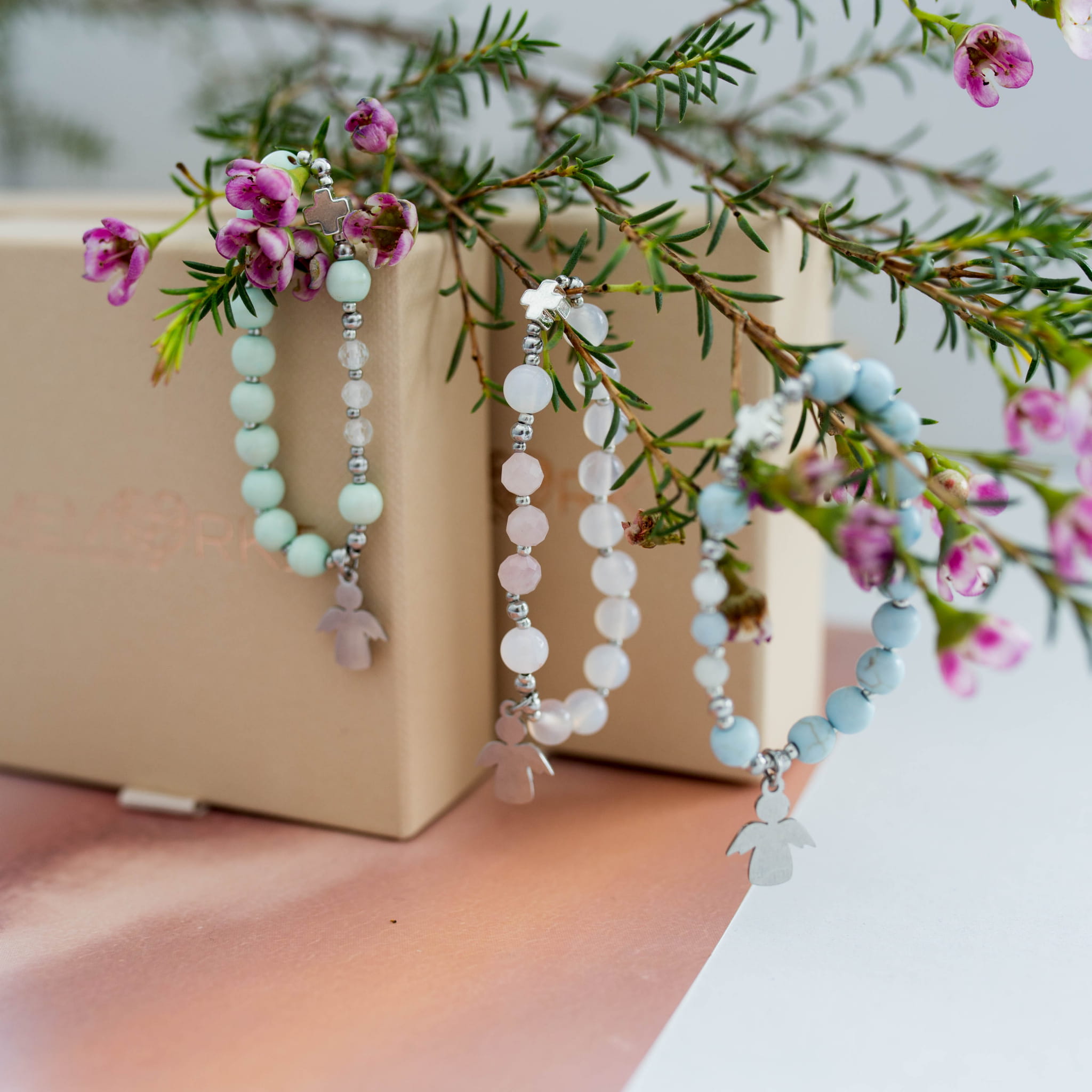 Bransoletka RÓŻANIEC z kolekcji Pełni Wiary, to delikatny rękodzielniczy wyrób dostępny w 3 wariantach kolorystycznych.