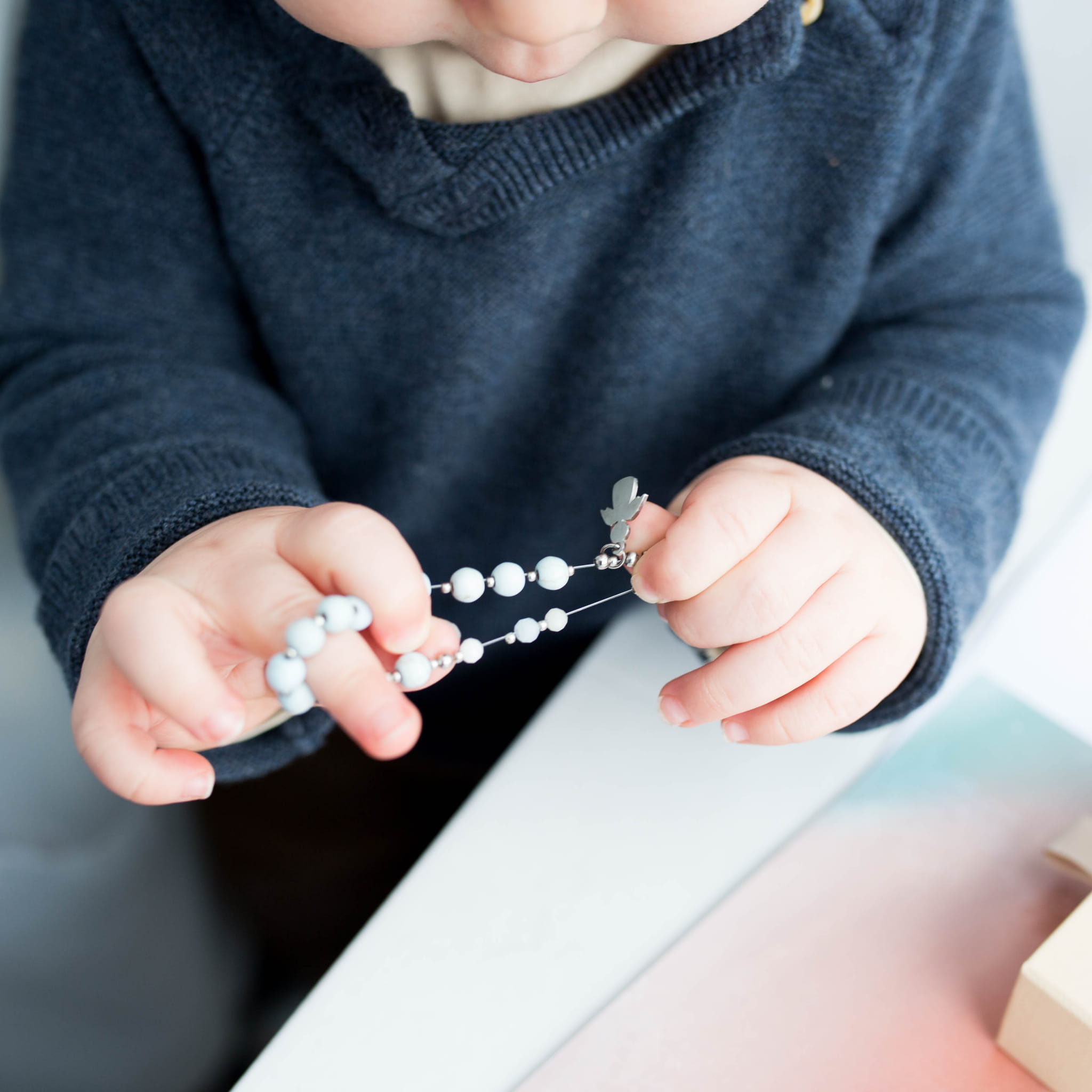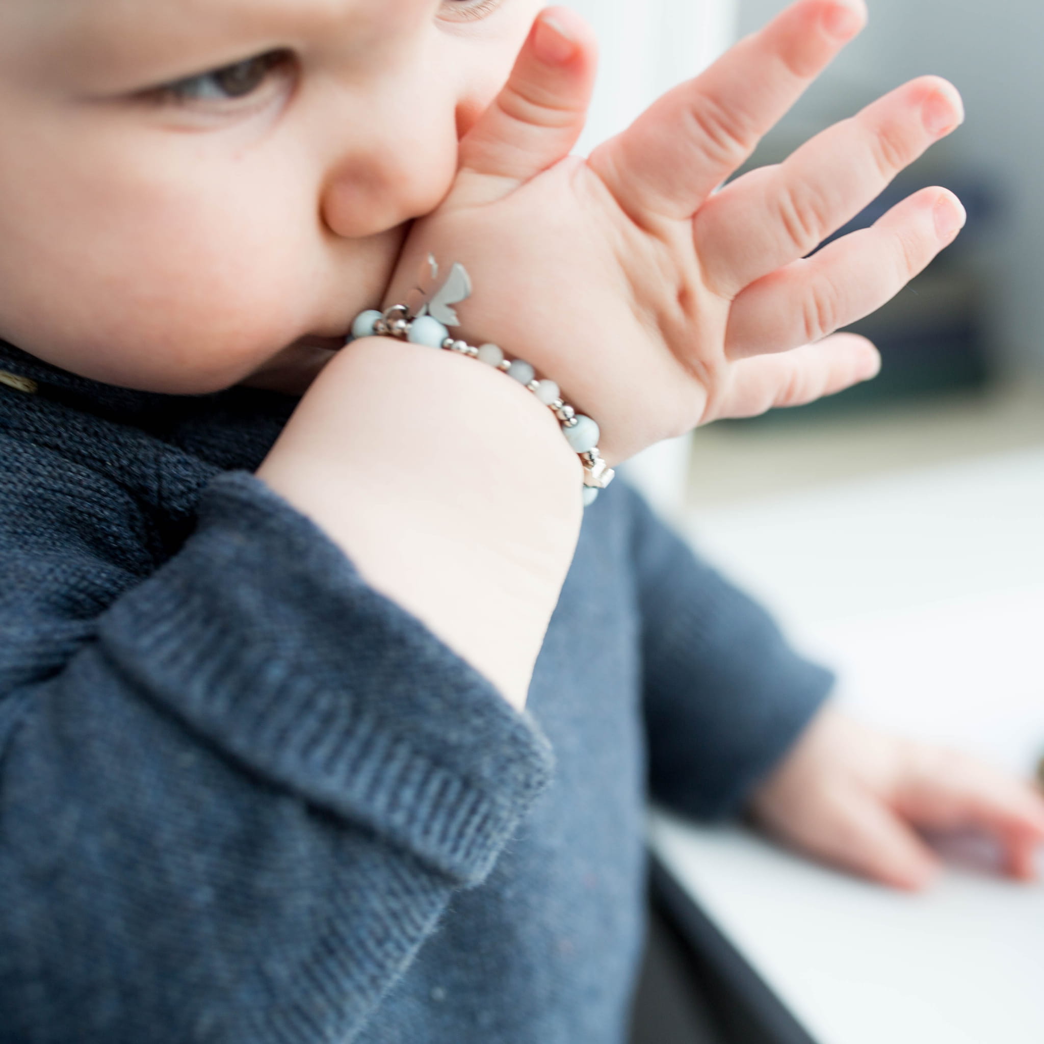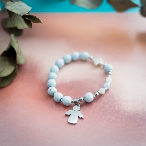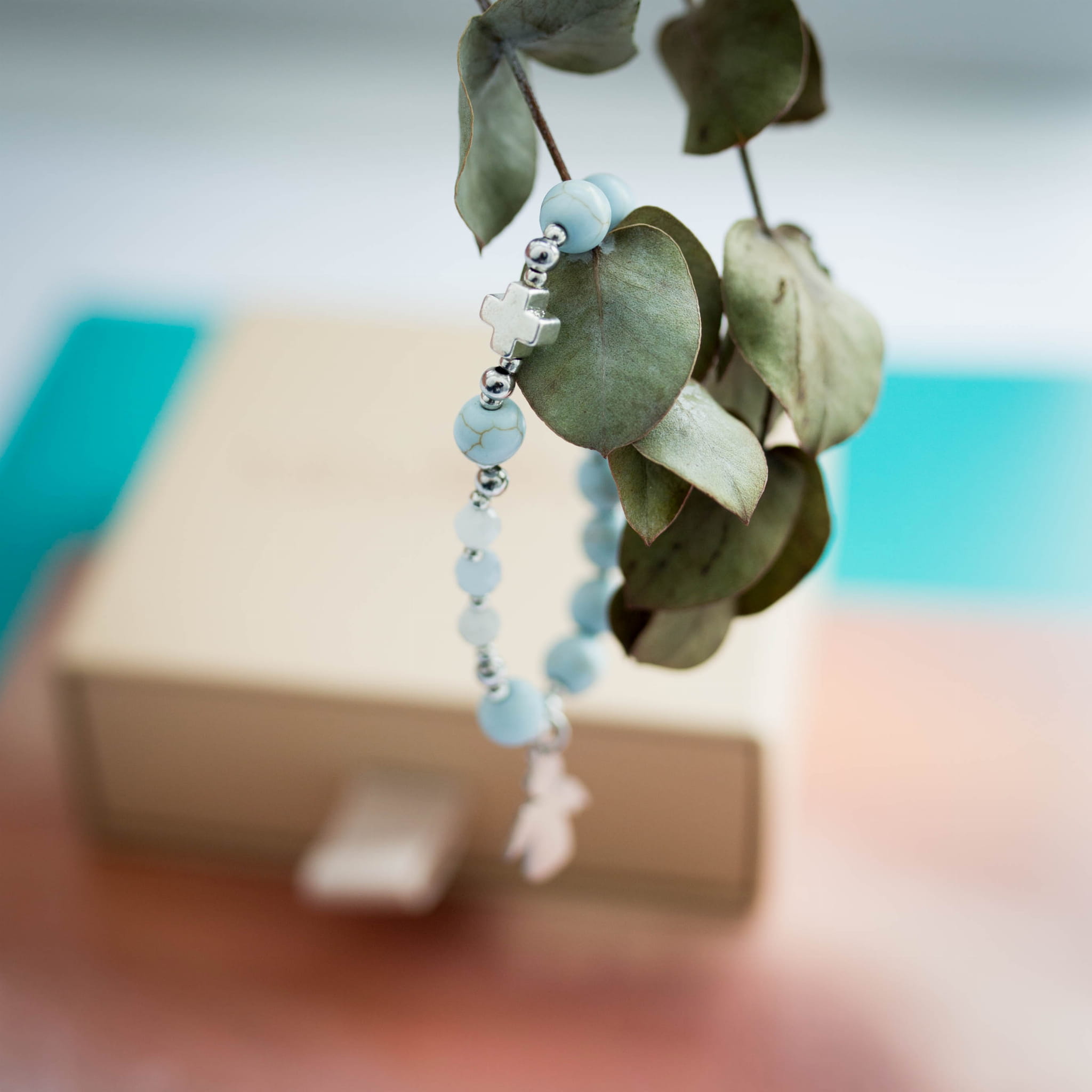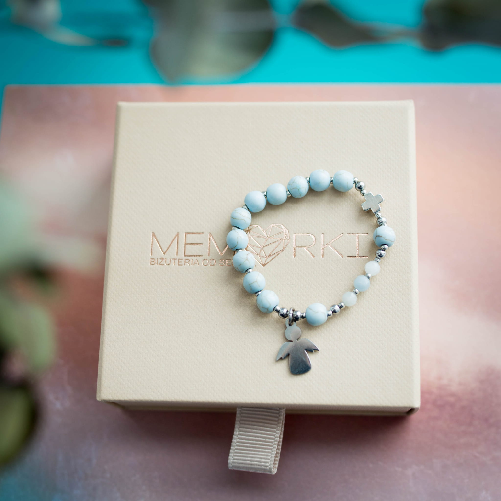 Misternie nanizane na bardzo trwałą gumkę jubilerską kamienie naturalne (ok.6mm) w połączeniu z hematytowym krzyżykiem i aniołkiem ze stali chirurgicznej sprawdzą się doskonale jako drobiazgowa pamiątka z okazji Chrztu Świętego.