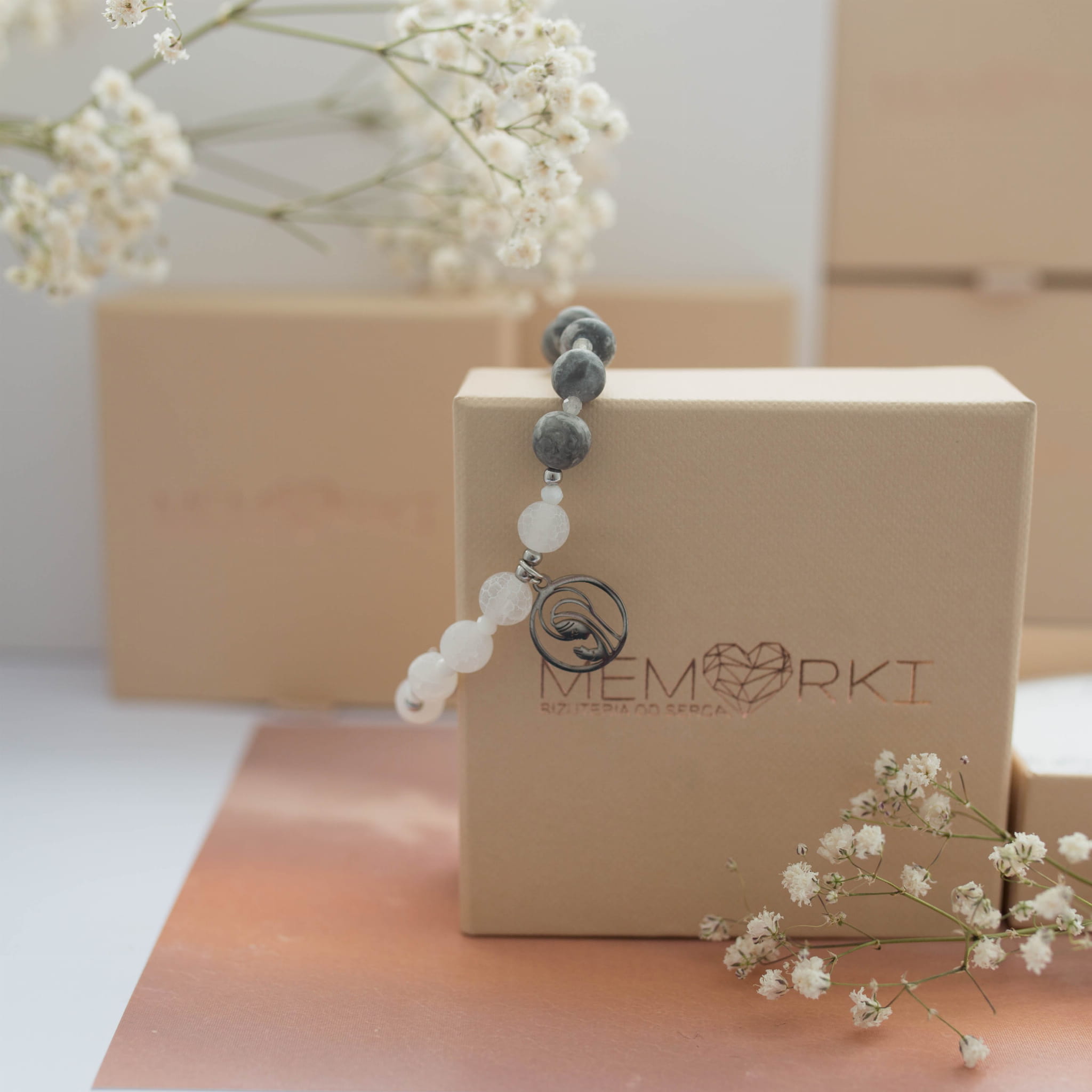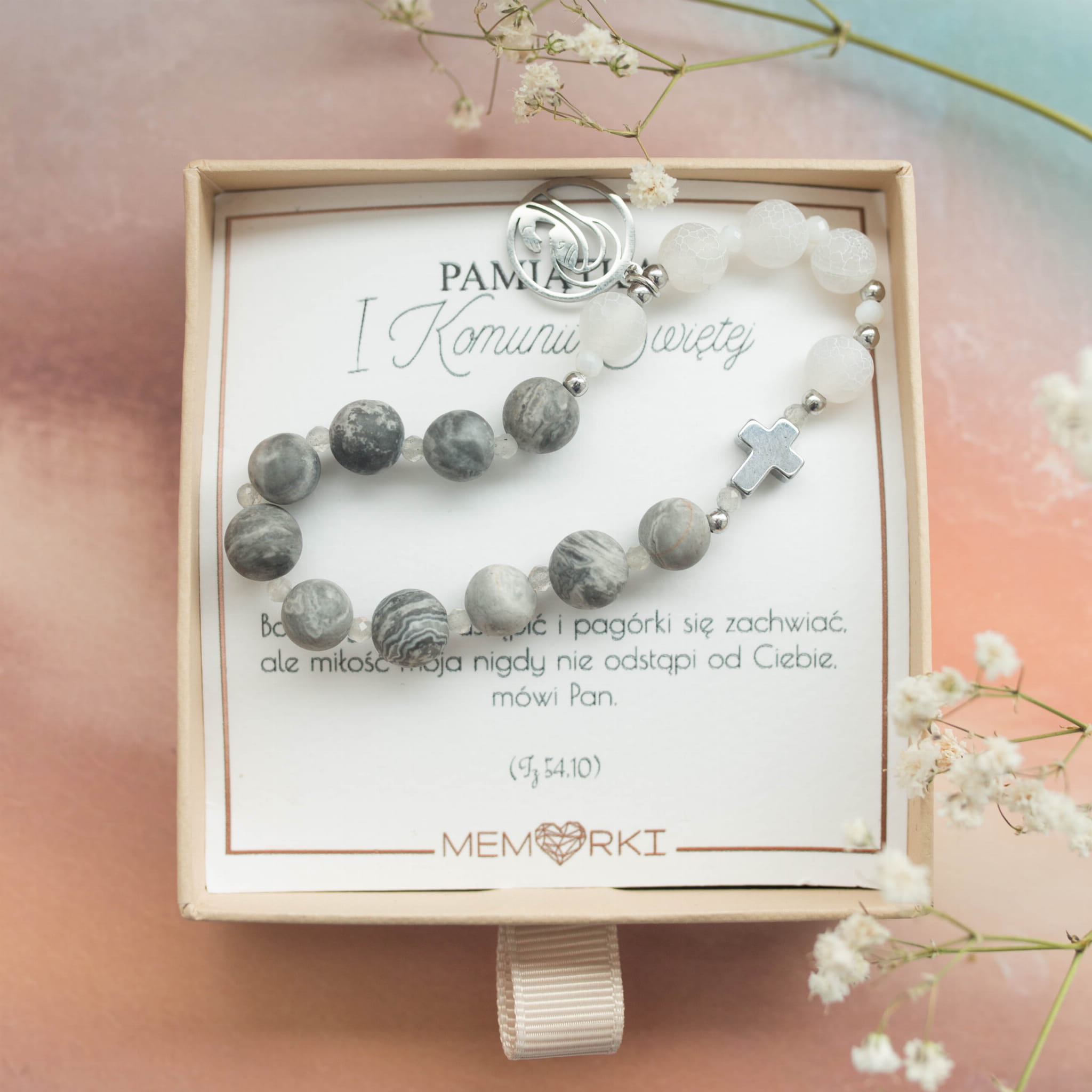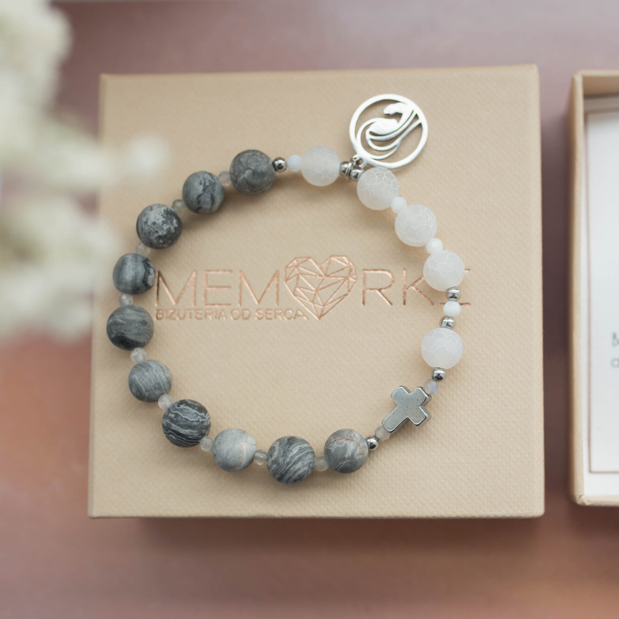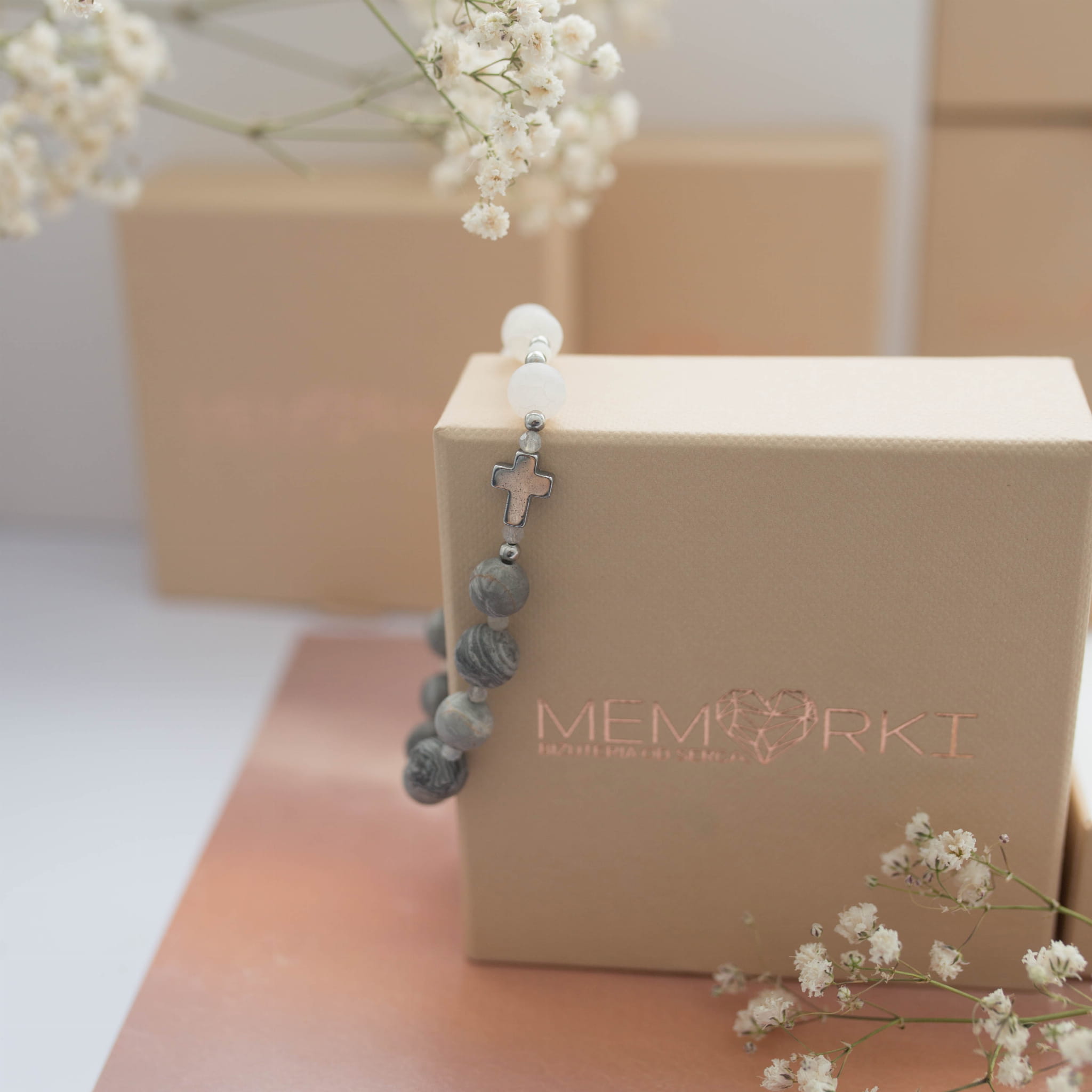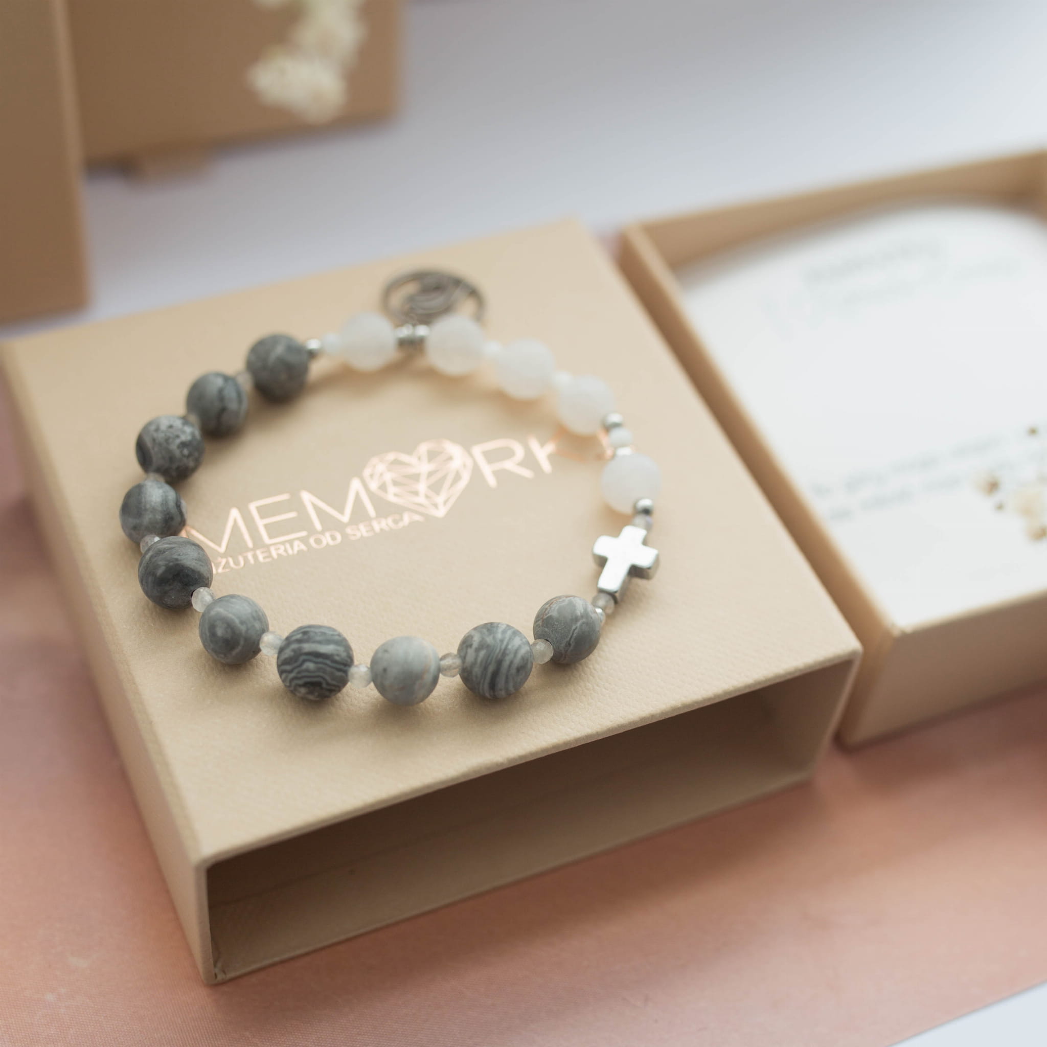 Misternie nanizane na bardzo wytrzymałą i elastyczną gumkę jubilerską kamienie naturalne w połączeniu z delikatnym krzyżykiem i stalą chirurgiczną sprawdzą się doskonale jako drobiazgowa pamiątka z okazji Chrztu, I Komunii Świętej czy Bierzmowania.