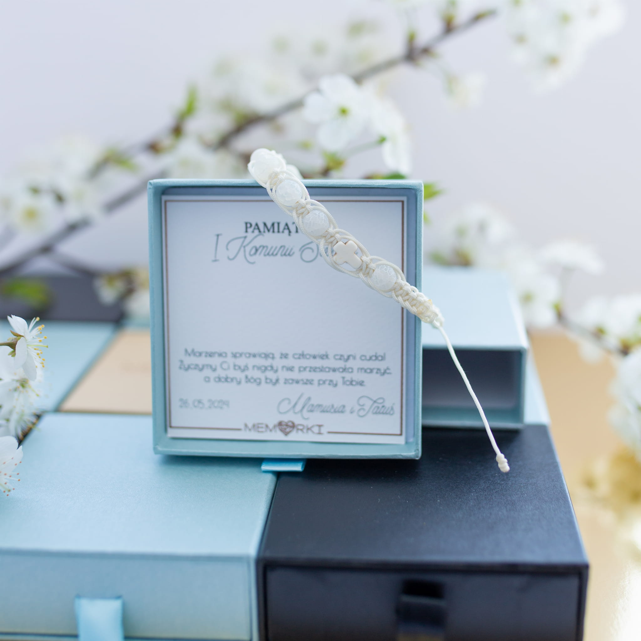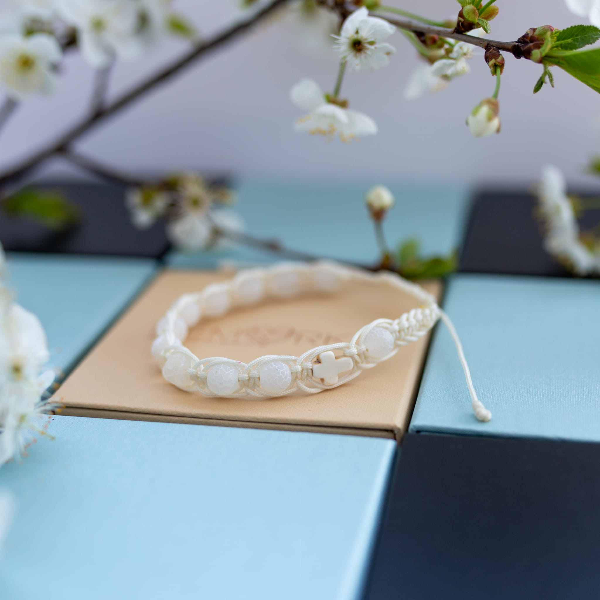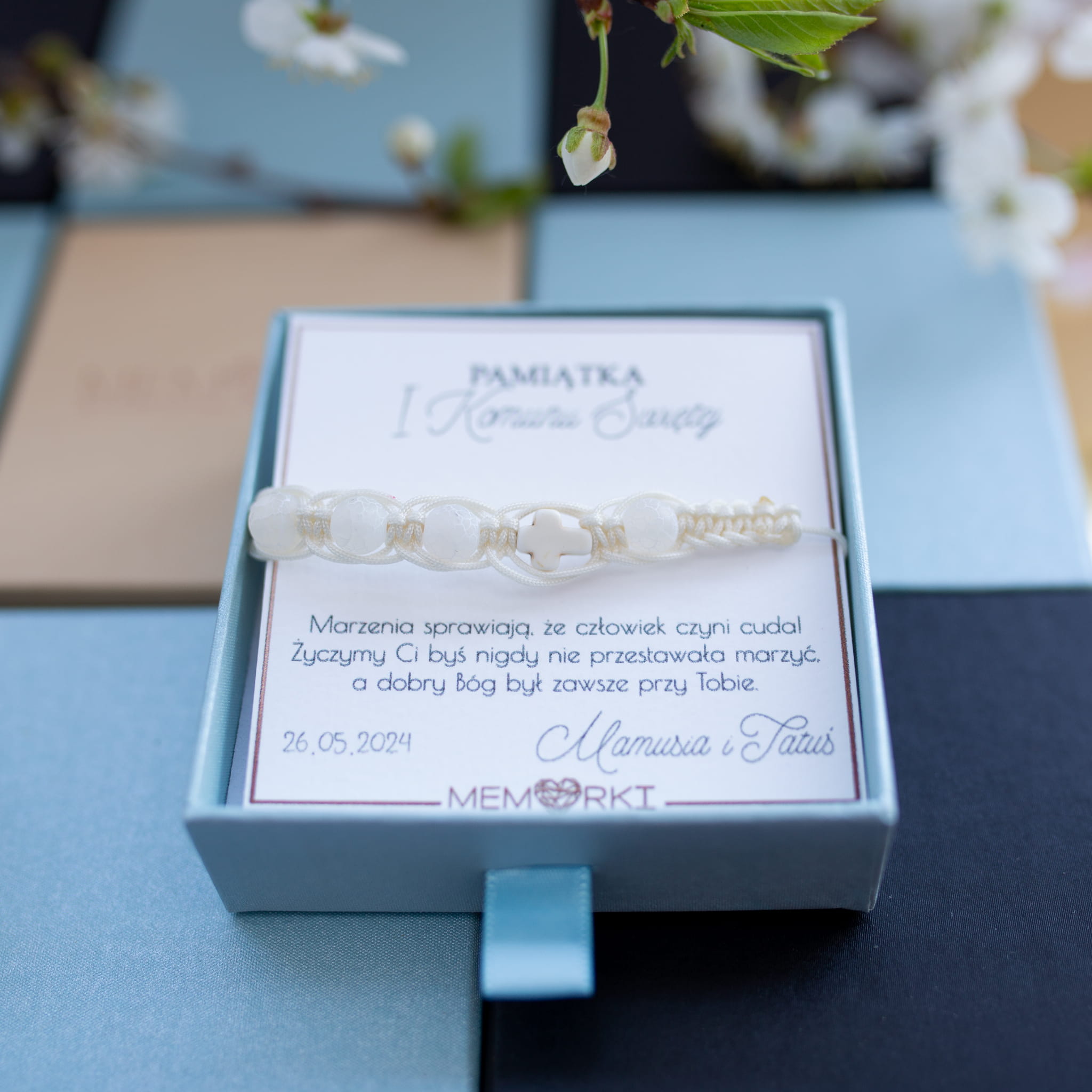 Misternie nanizane na bardzo wytrzymały sznureczek jubilerski kamienie naturalne w połączeniu z delikatnym krzyżykiem sprawdzą się doskonale jako drobiazgowa pamiątka z okazji Chrztu, I Komunii Świętej czy Bierzmowania.