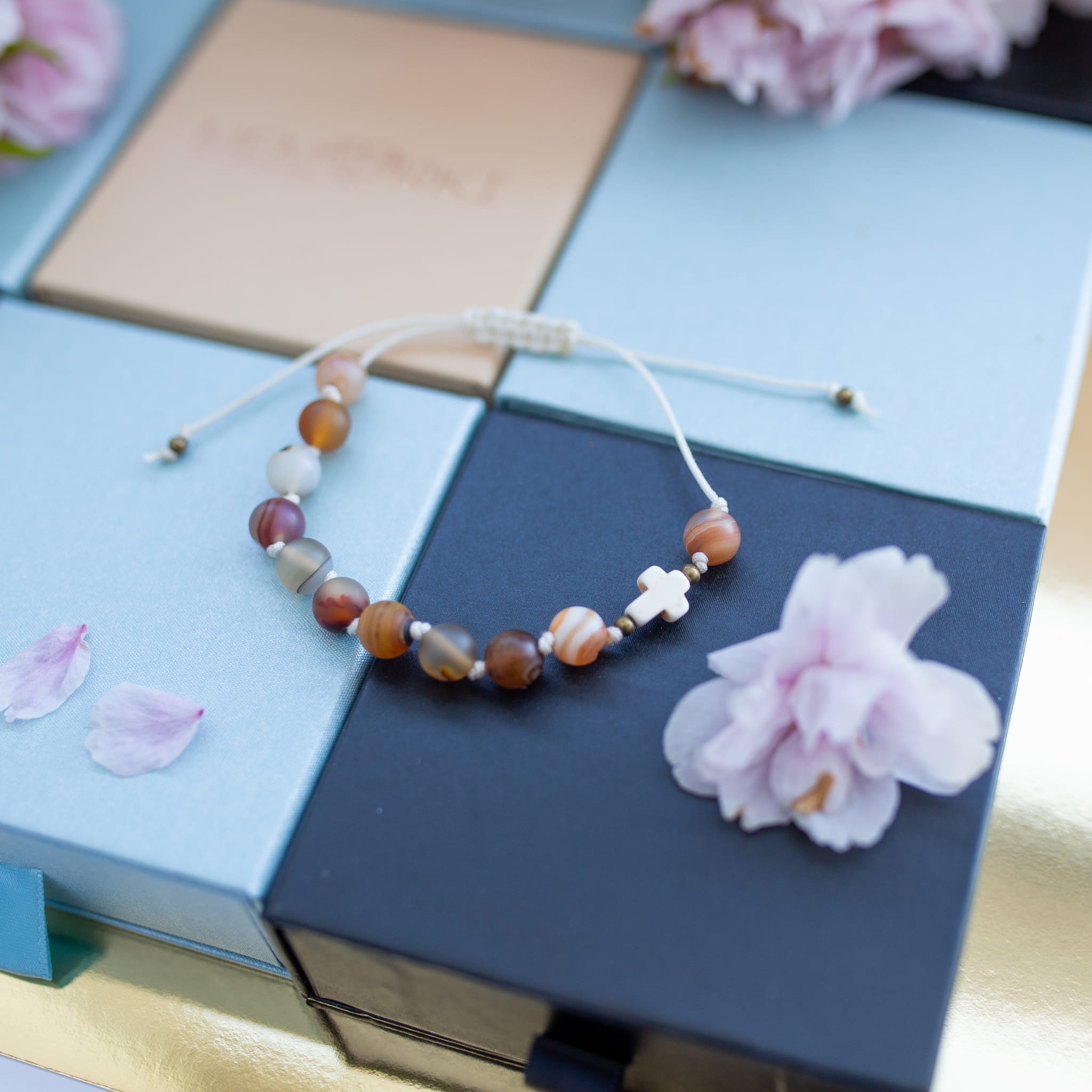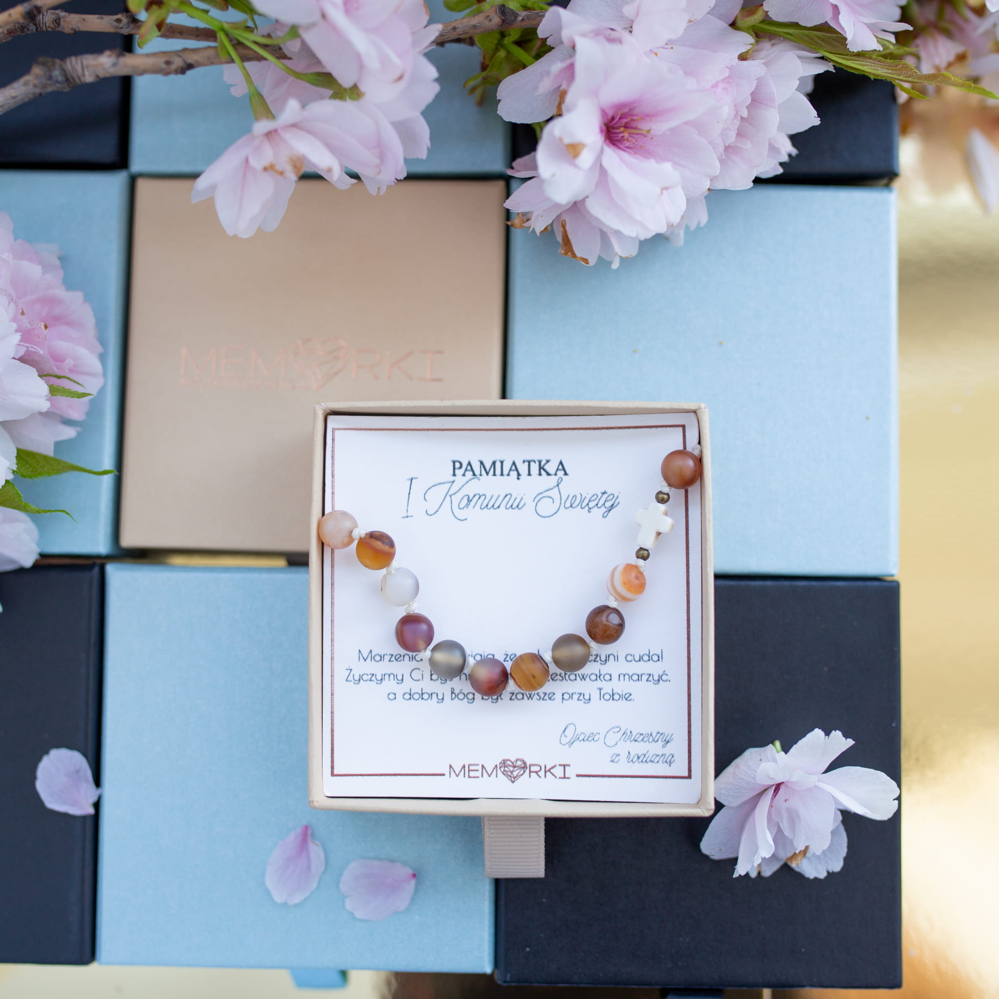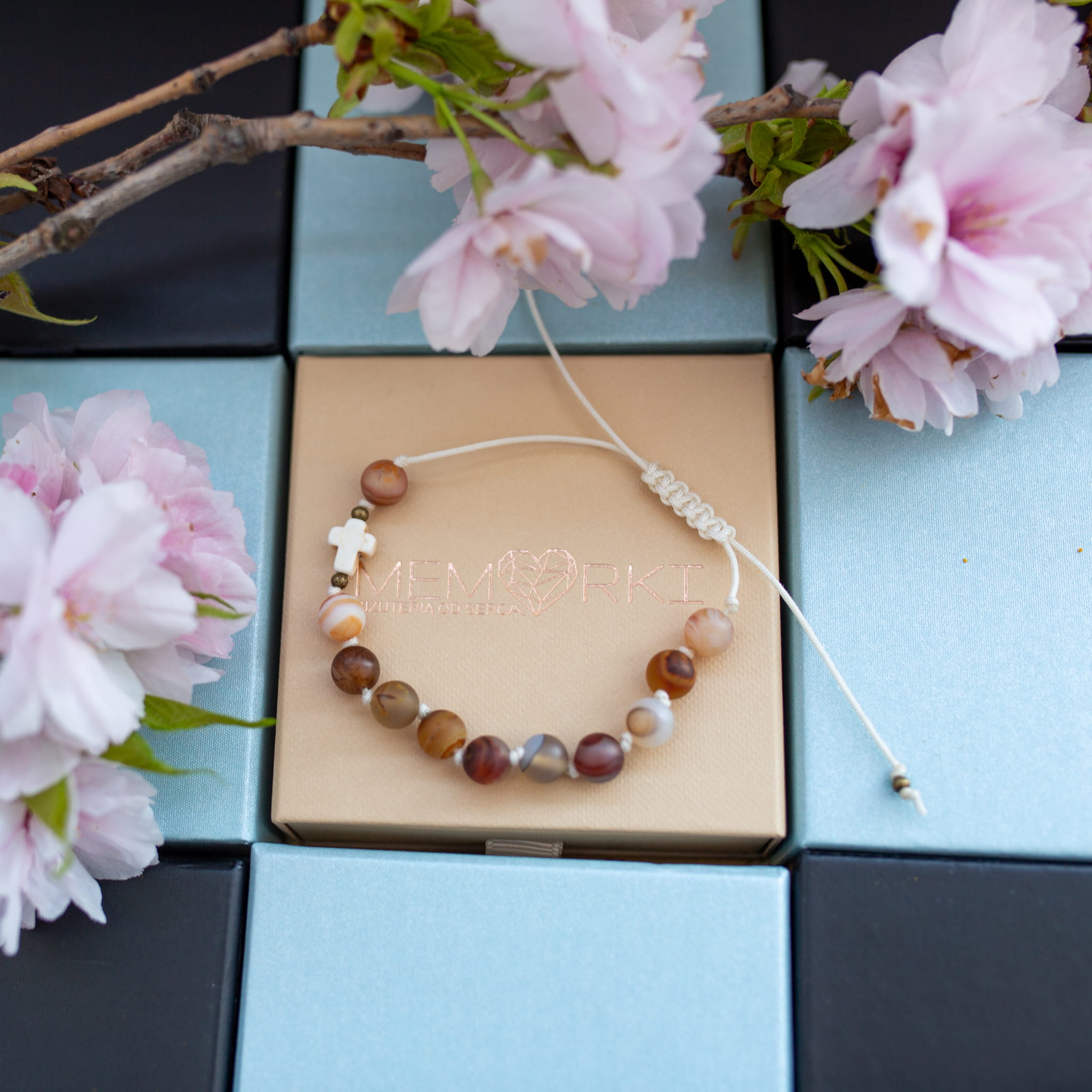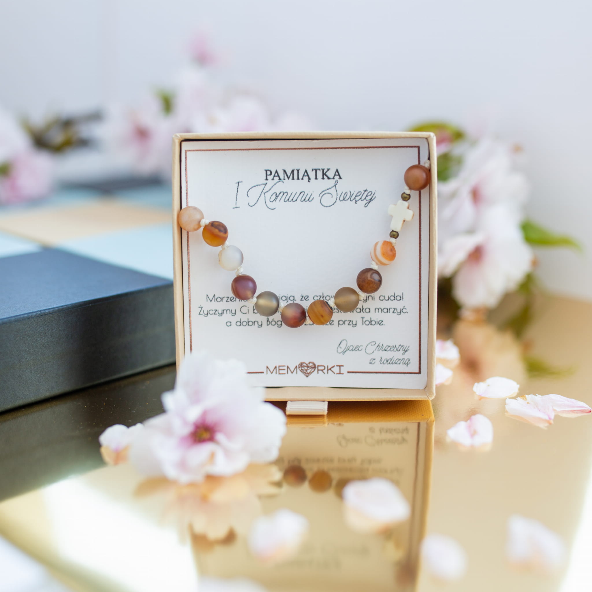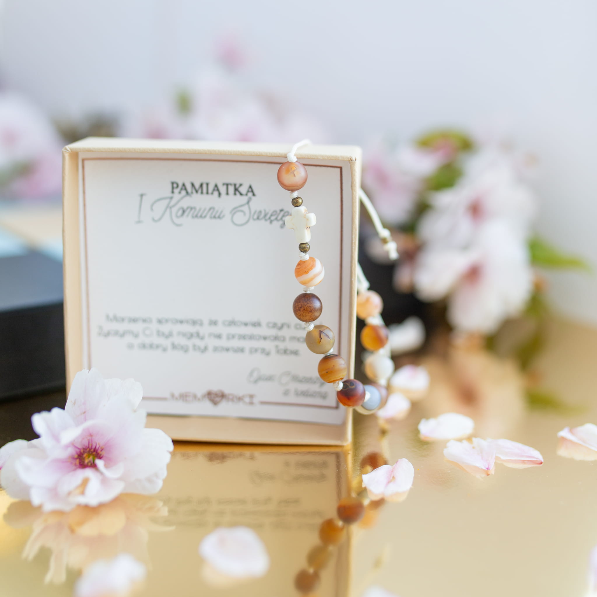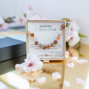 Misternie nanizane na bardzo wytrzymały sznurek jubilerski kamienie naturalne w połączeniu z delikatnym krzyżykiem i stalą chirurgiczną sprawdzą się doskonale jako drobiazgowa pamiątka z okazji Chrztu, I Komunii Świętej czy Bierzmowania.