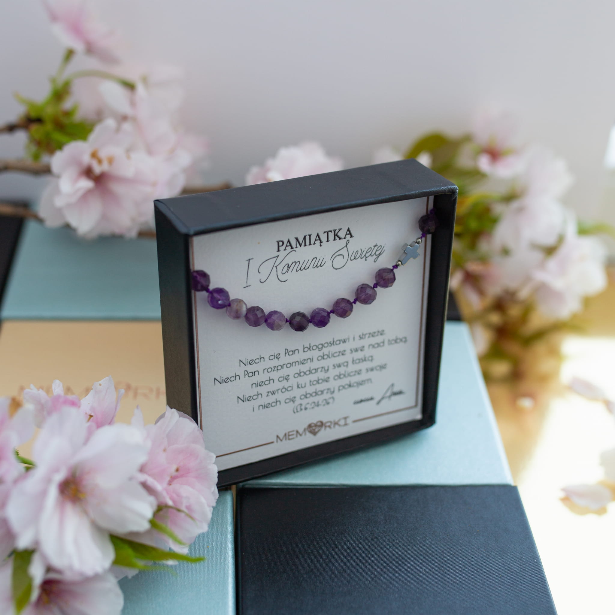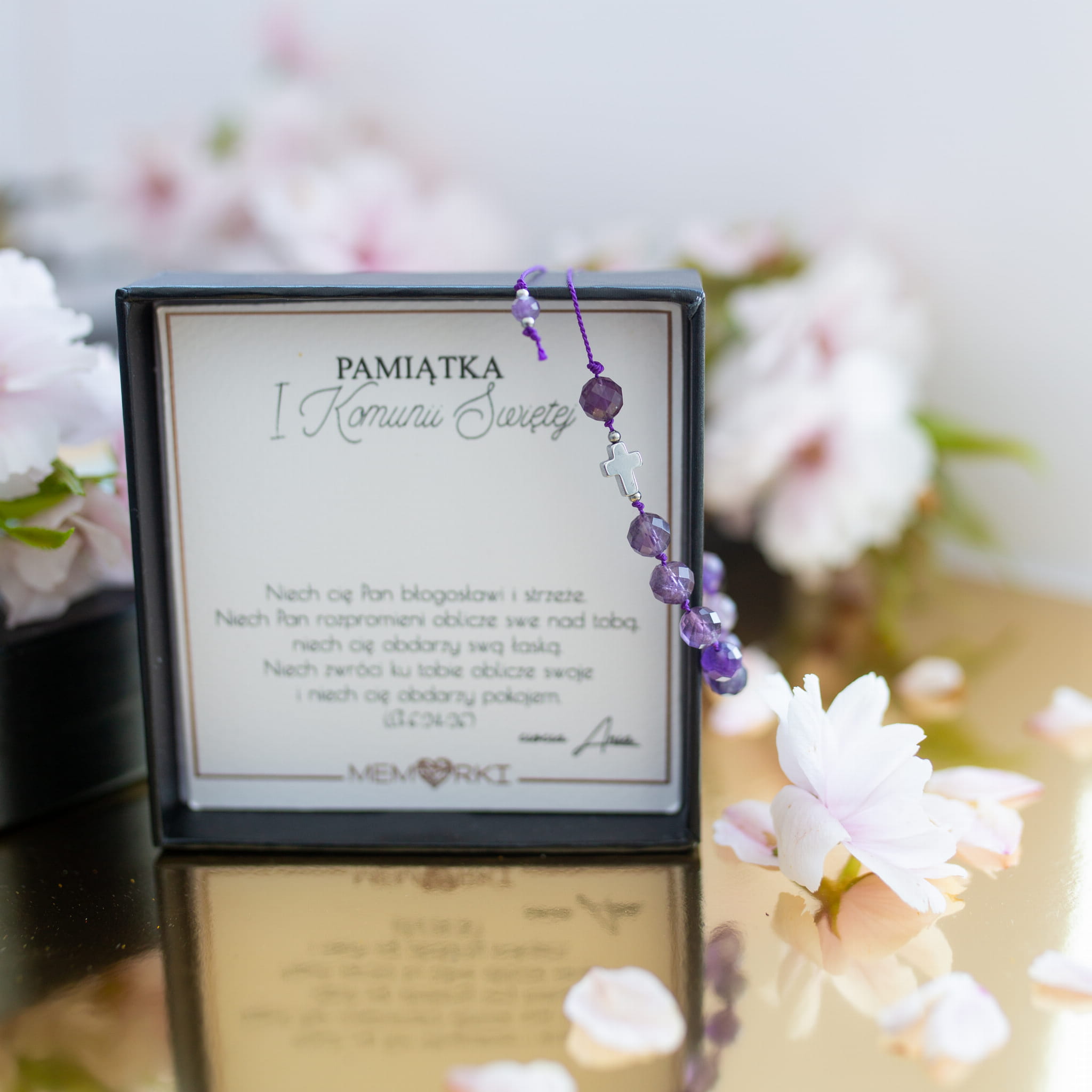 Misternie nanizane na bardzo wytrzymały jedwabny sznureczek jubilerski, kamienie naturalne w połączeniu z delikatnym krzyżykiem i stalą chirurgiczną sprawdzą się doskonale jako drobiazgowa pamiątka z okazji Chrztu, I Komunii Świętej czy Bierzmowania.
