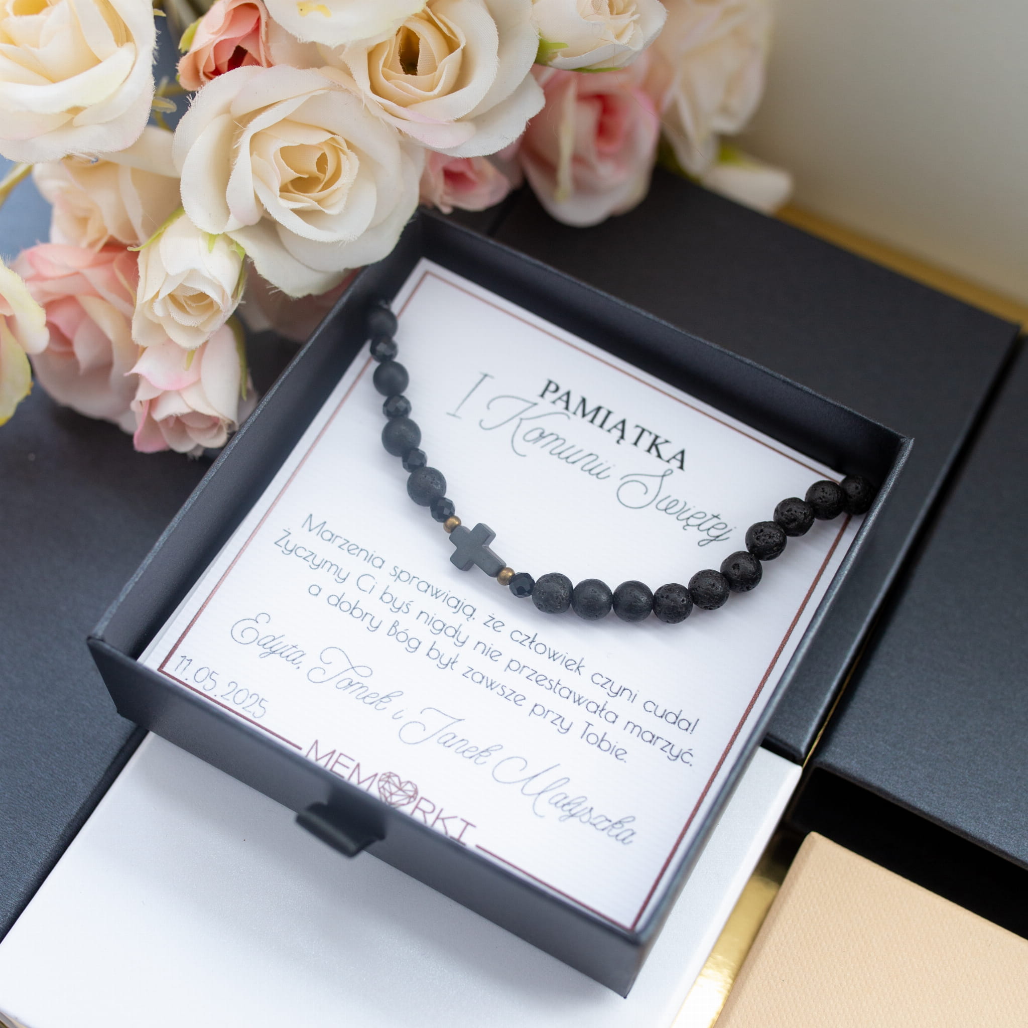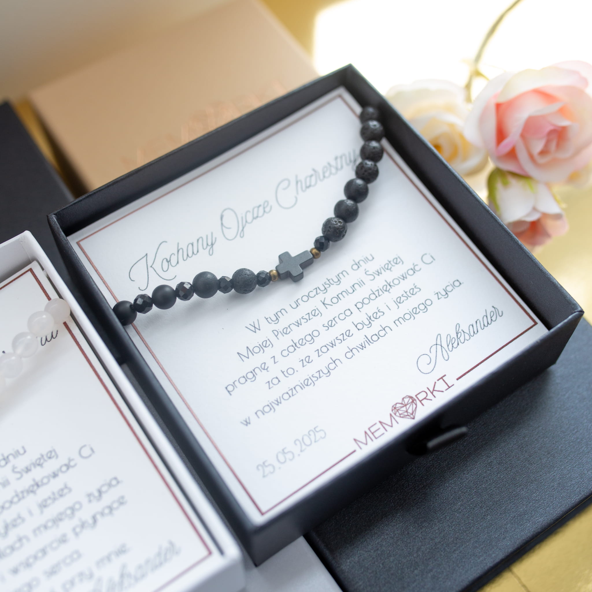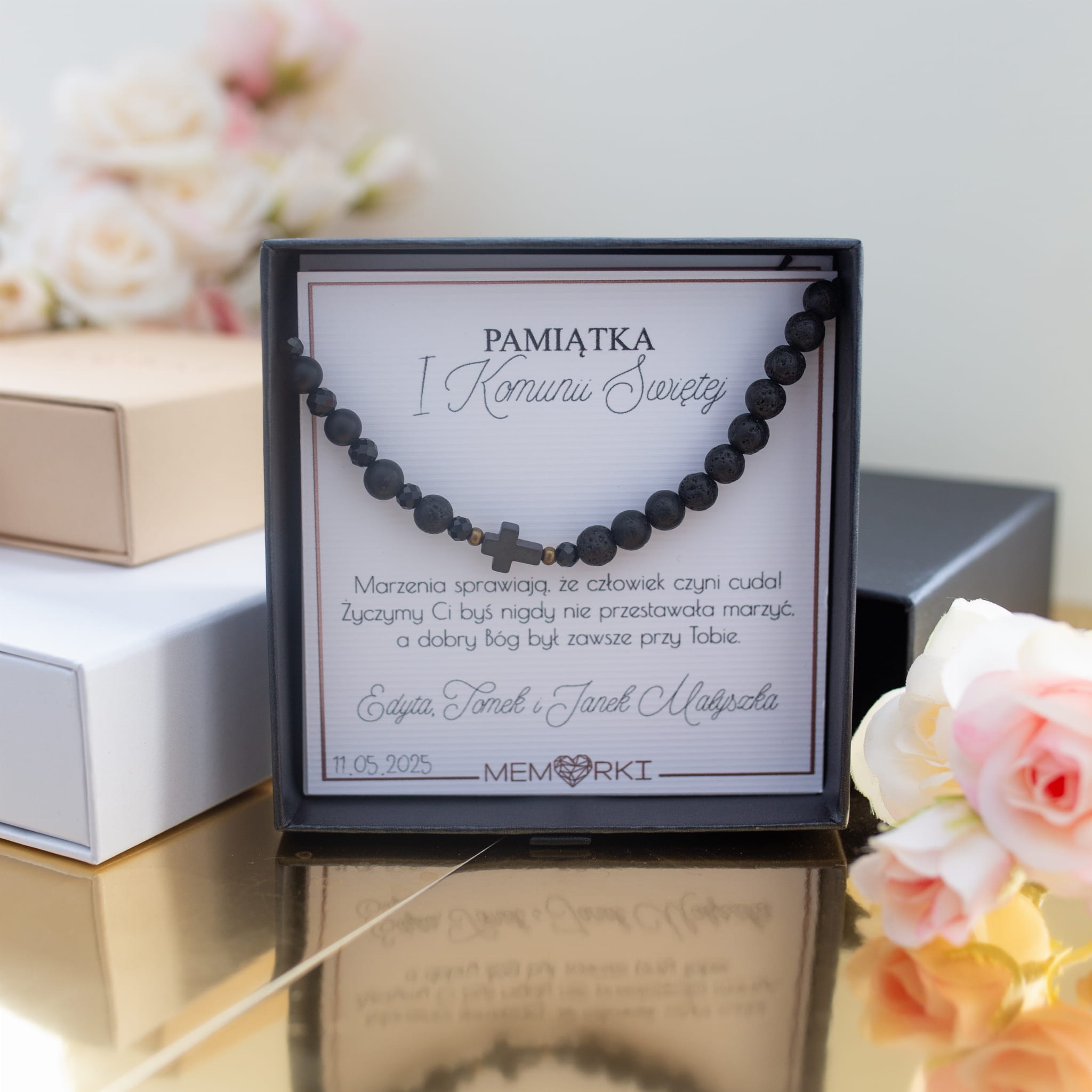Misternie nanizane na bardzo wytrzymały sznureczek jubilerski kamienie naturalne w połączeniu z delikatnym krzyżykiem z hematytu sprawdzą się doskonale jako drobiazgowa pamiątka z okazji Chrztu, I Komunii Świętej czy Bierzmowania.
