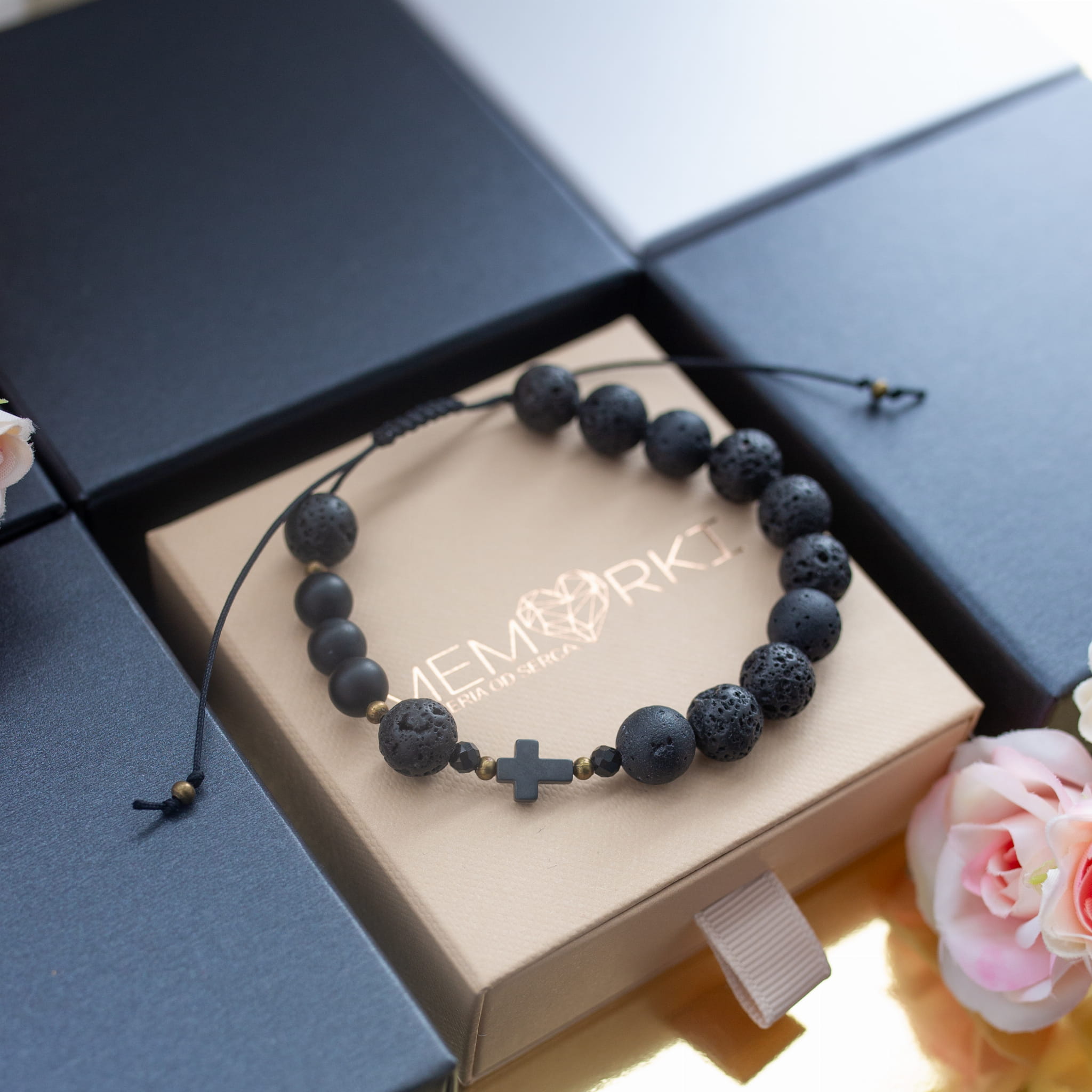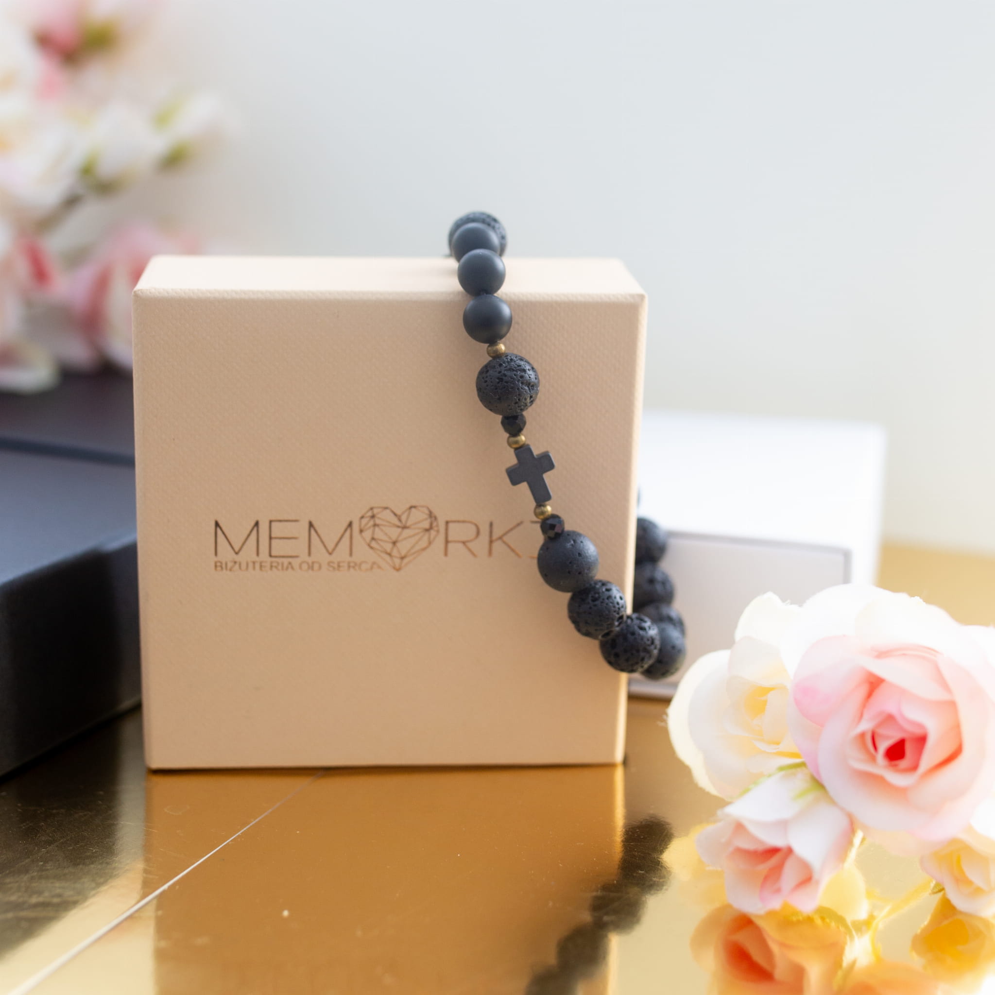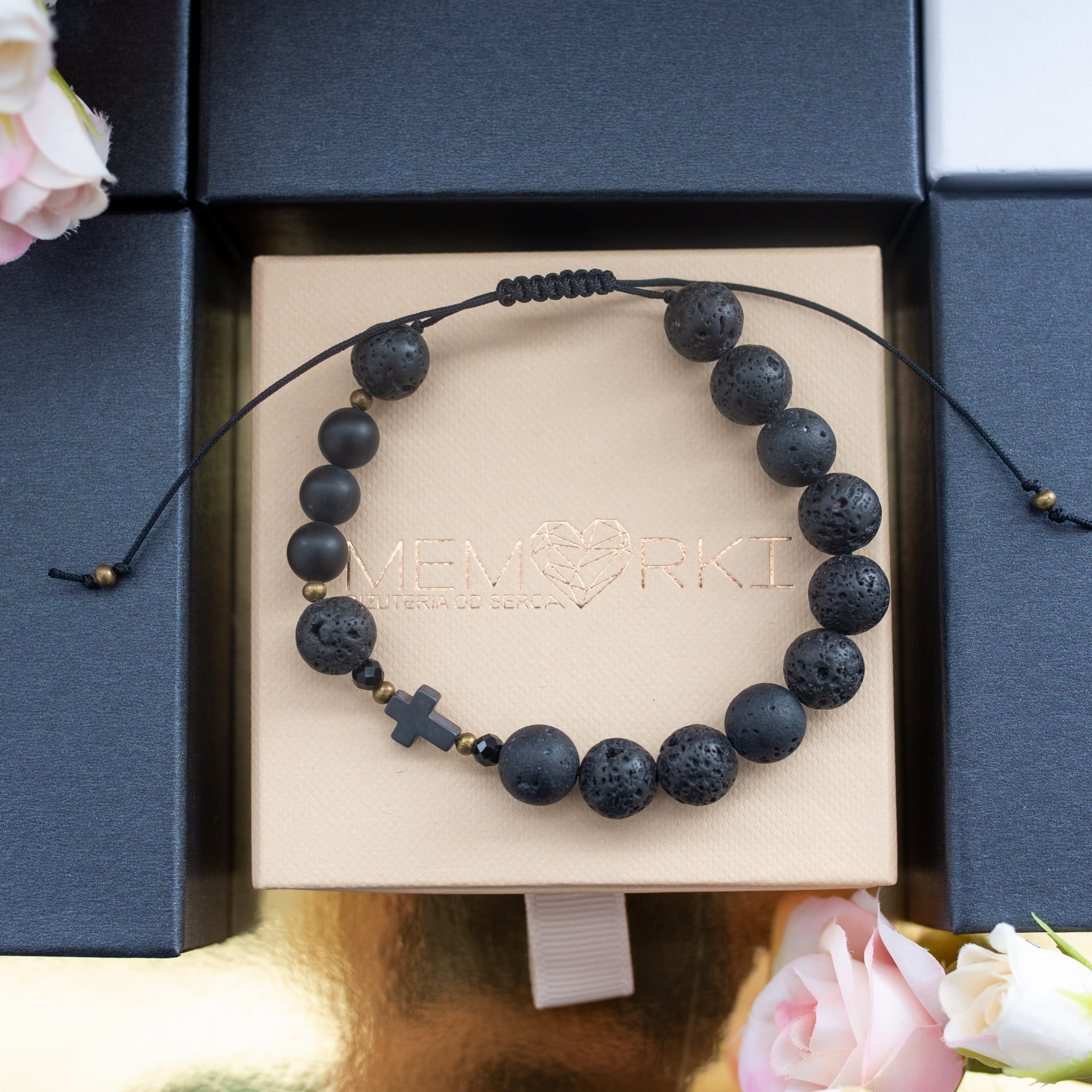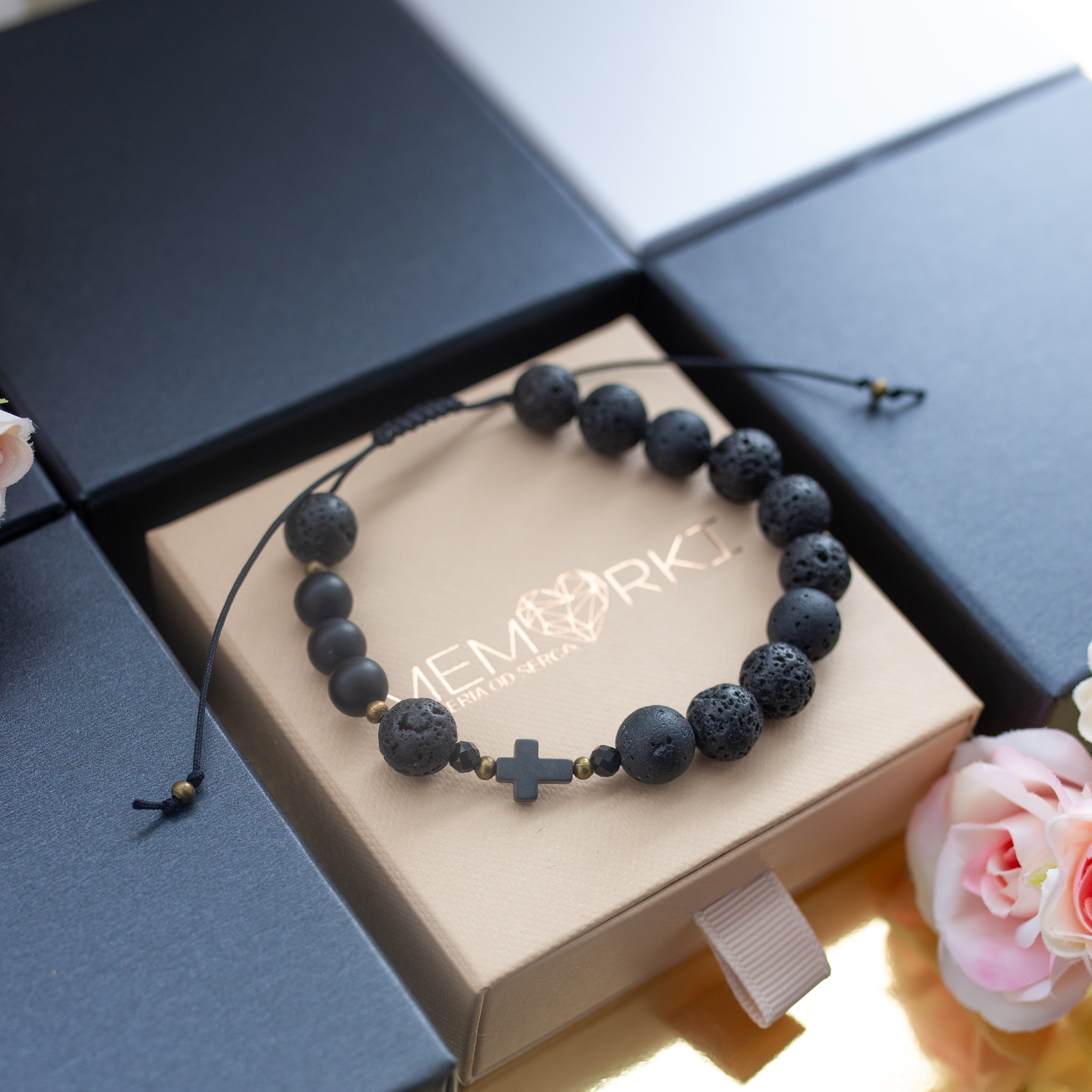 Misternie nanizane na bardzo wytrzymały sznureczek jubilerski kamienie naturalne w połączeniu z delikatnym krzyżykiem z hematytu sprawdzą się doskonale jako drobiazgowa pamiątka z okazji Chrztu, I Komunii Świętej czy Bierzmowania.