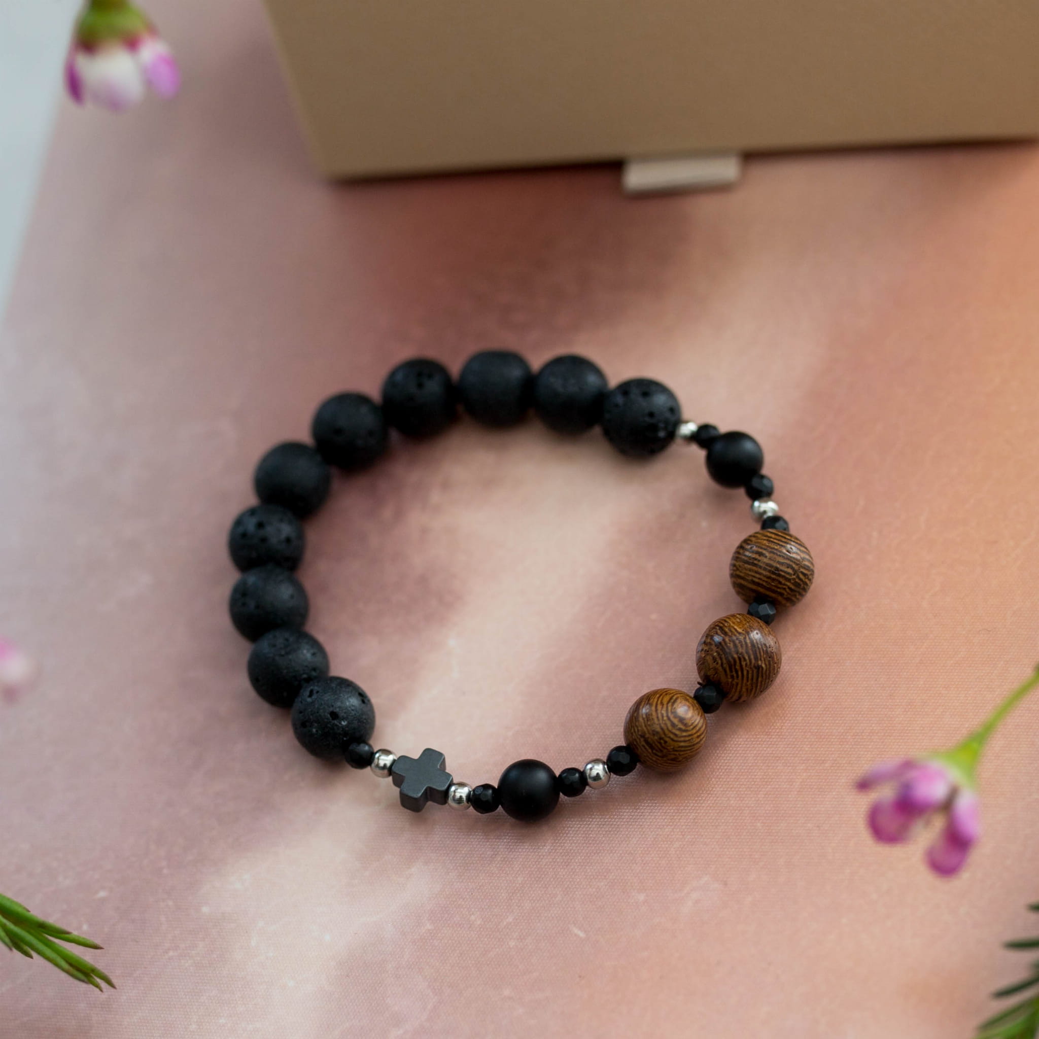 Piękny różaniec wykonany z kamieni naturalnych i drewna.