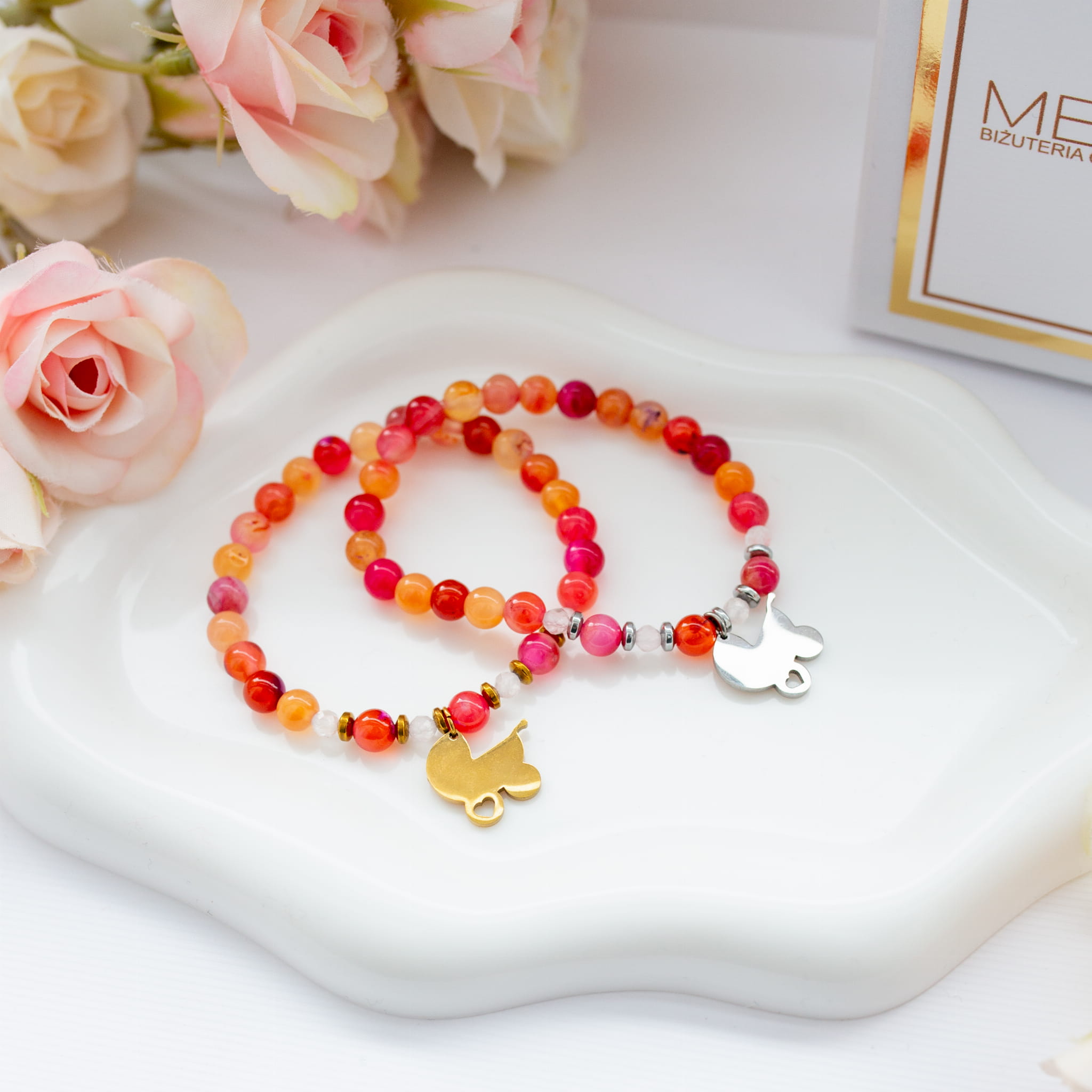 Misternie nanizane na gumkę jubilerską kamienie naturalne w połączeniu z symbolicznym wózeczkiem ze stali chirurgicznej sprawdzą się doskonale niemal w każdej kobiecej stylizacji dodając wdzięku i delikatności.