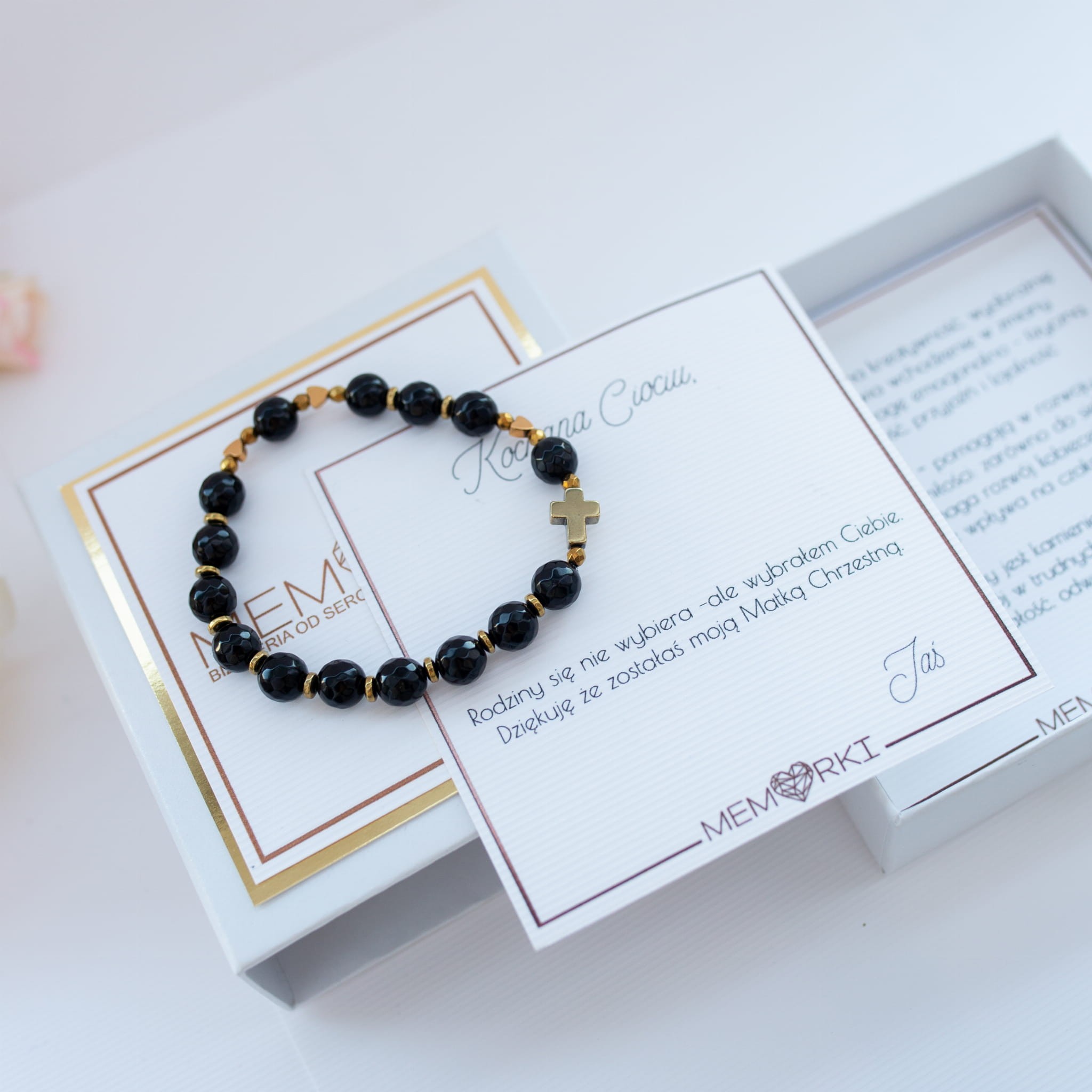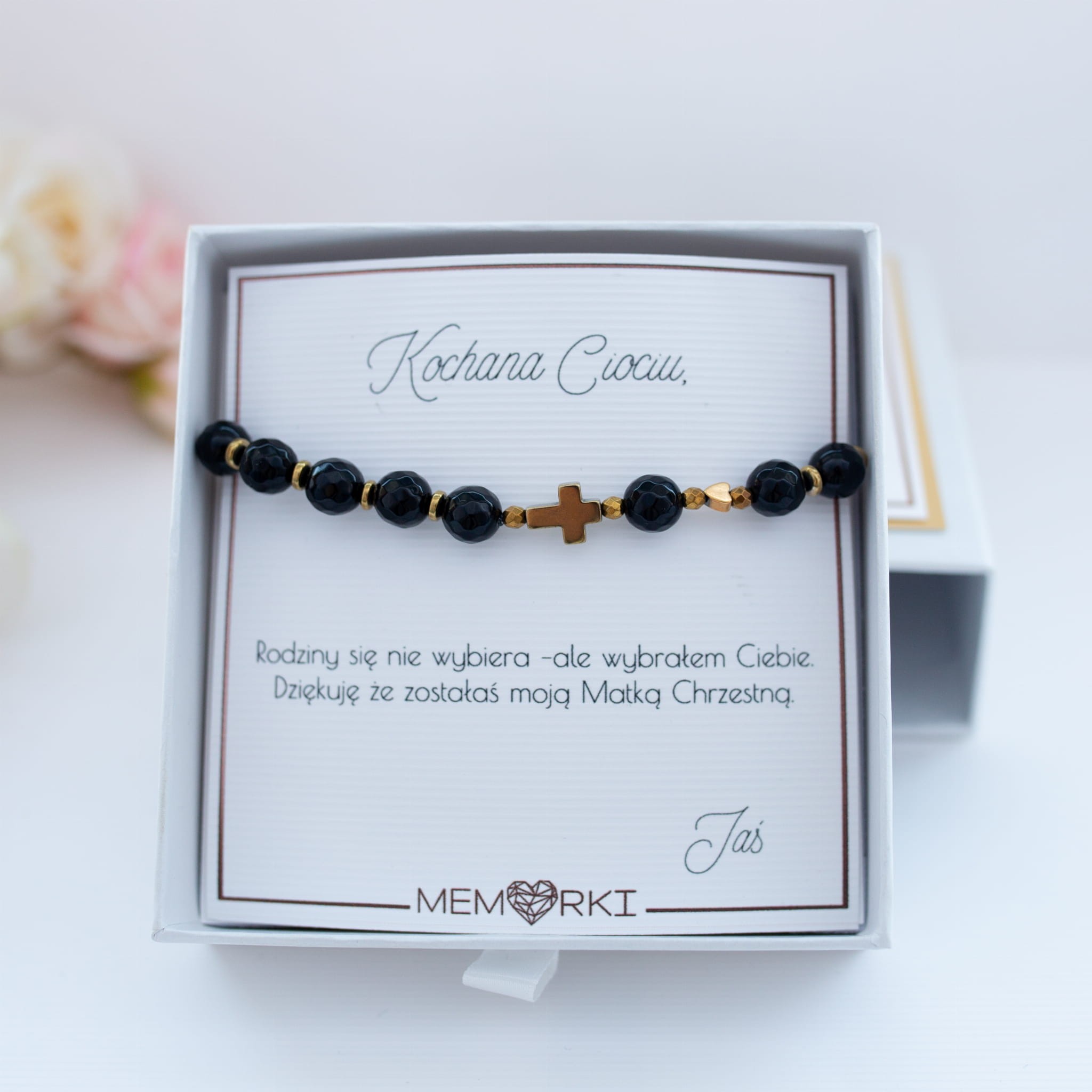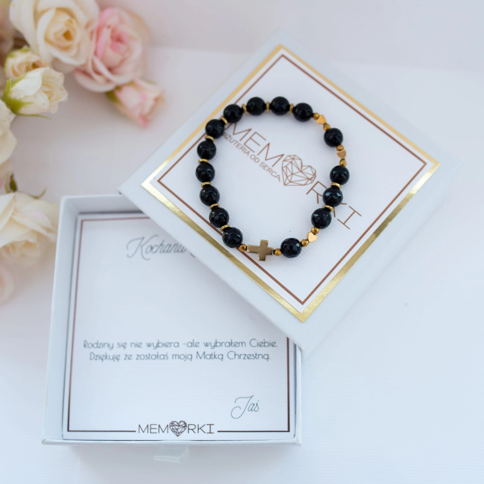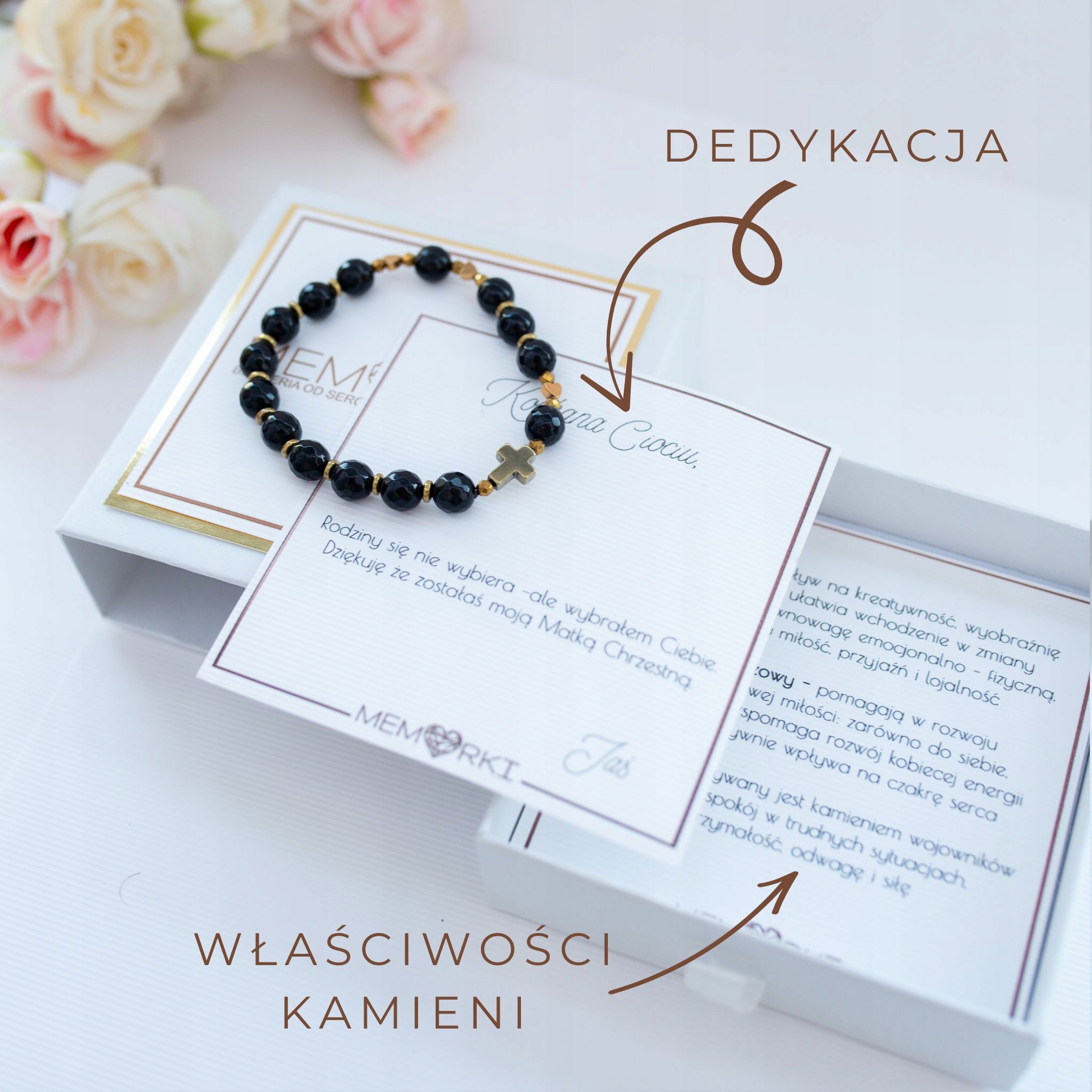Bransoletki z DEDYKACJĄ dla na podziękowanie dla Matki Chrzestnej z onyksu i złotego hematytu.
