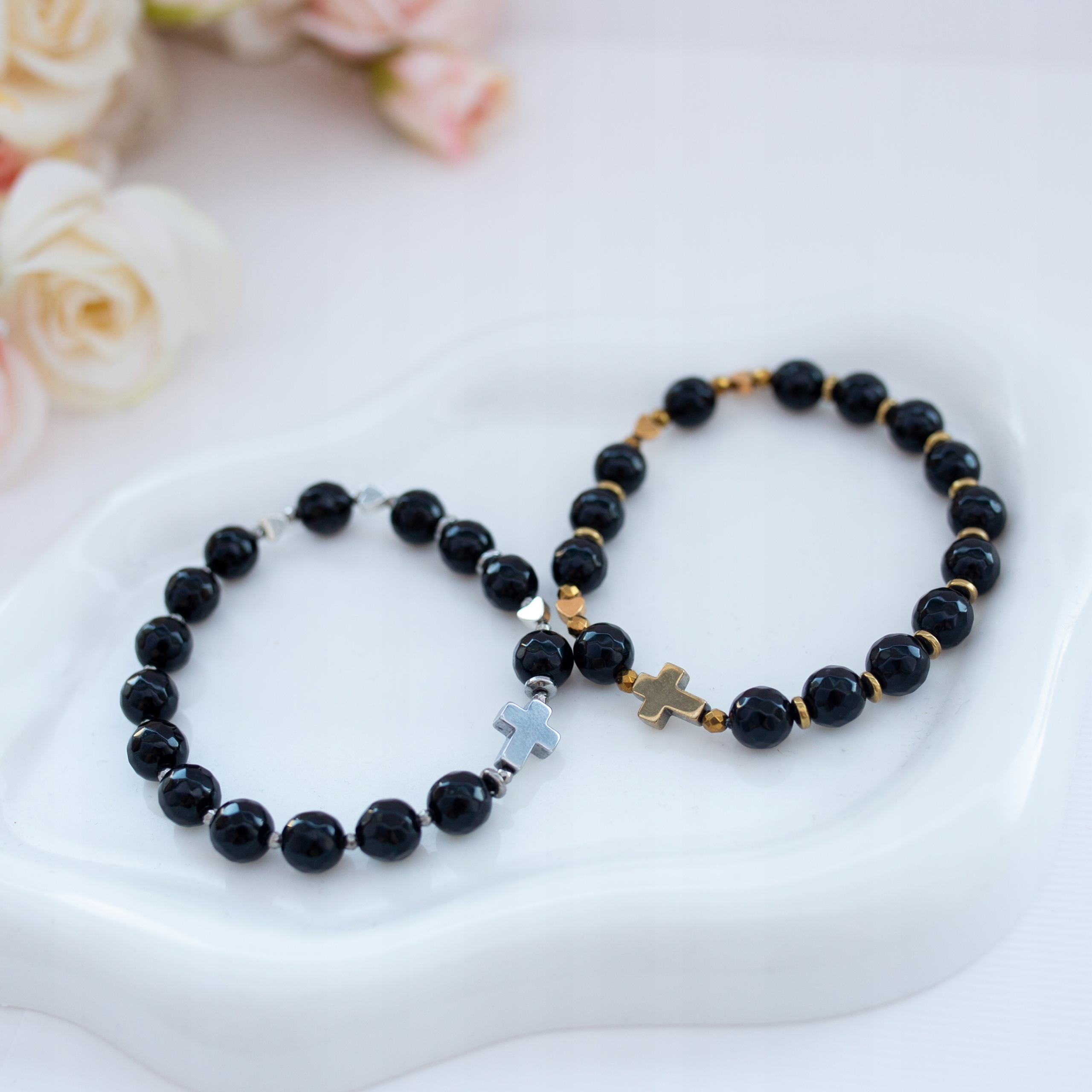 Bransoletka dla chrzestnej- PODZIĘKOWANIE- różaniec na chrzest z onyksu i hematytu