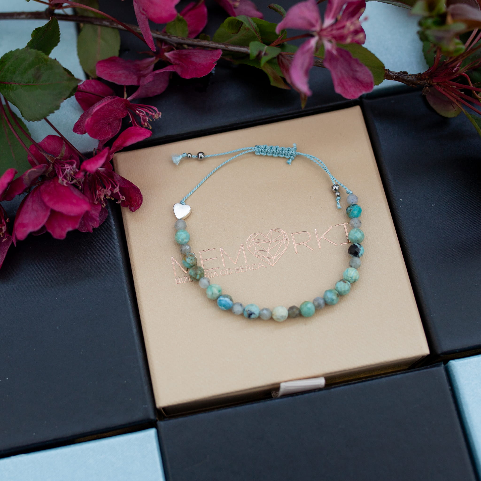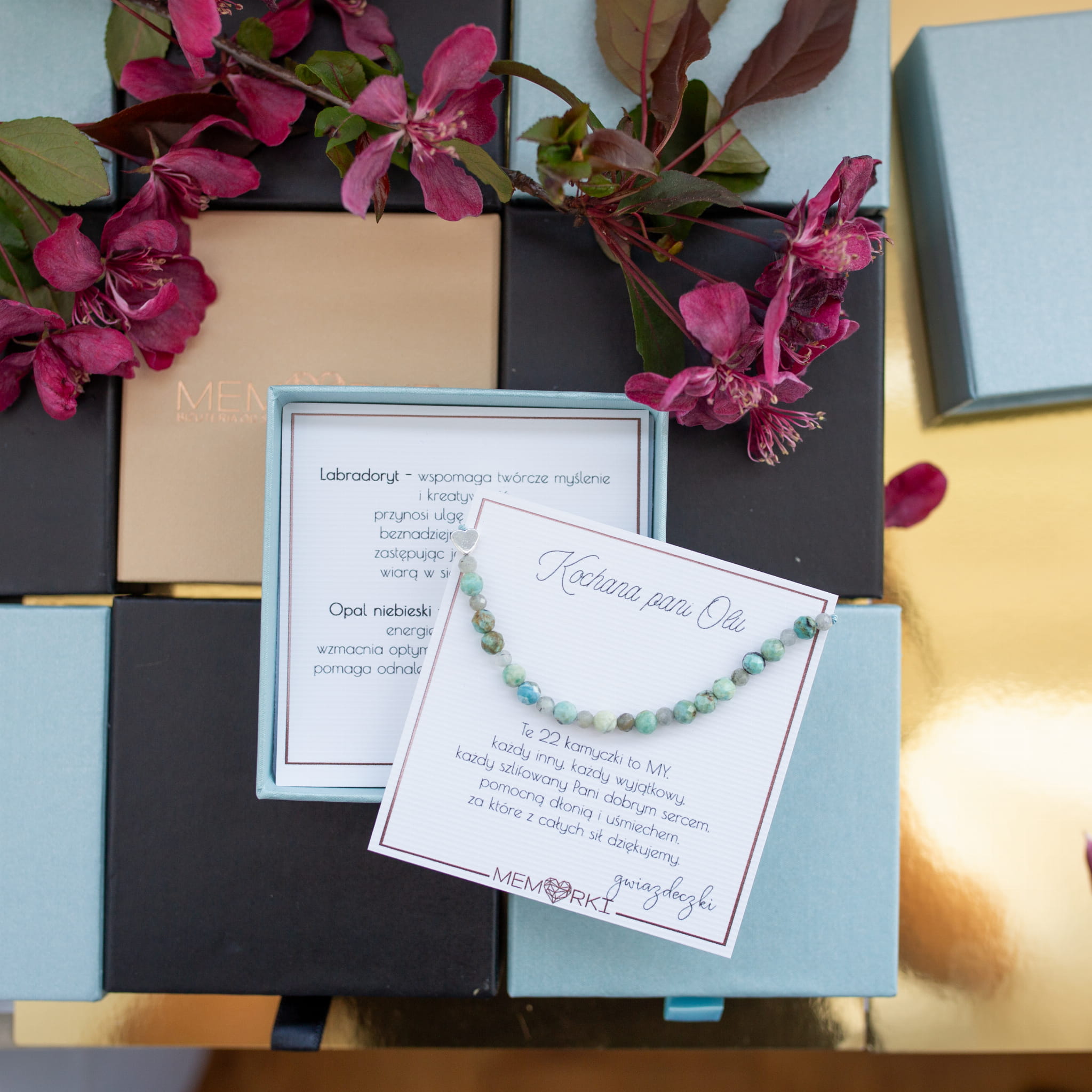 Misternie nanizane na bardzo wytrzymały jedwabny sznureczek jubilerski, kamienie naturalne w połączeniu ze stalą chirurgiczną sprawdzą się doskonale jako drobiazgowa pamiątka z okazji końca roku szkolnego w przedszkolu i szkole, dnia nauczyciela, matur itd.
