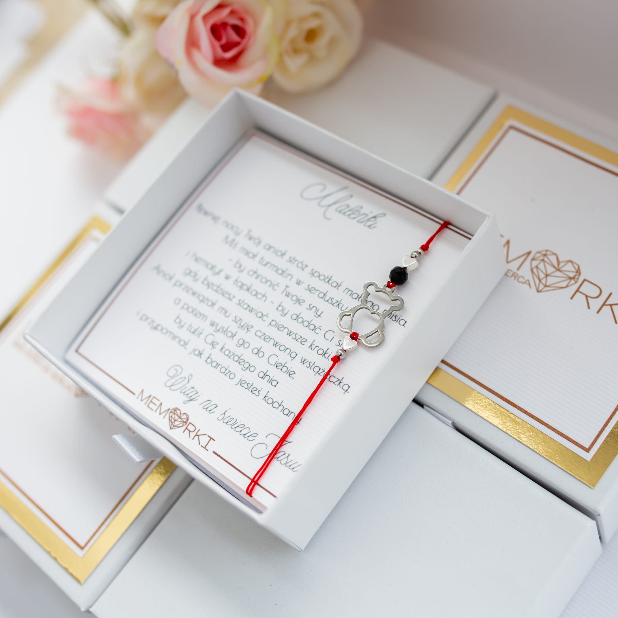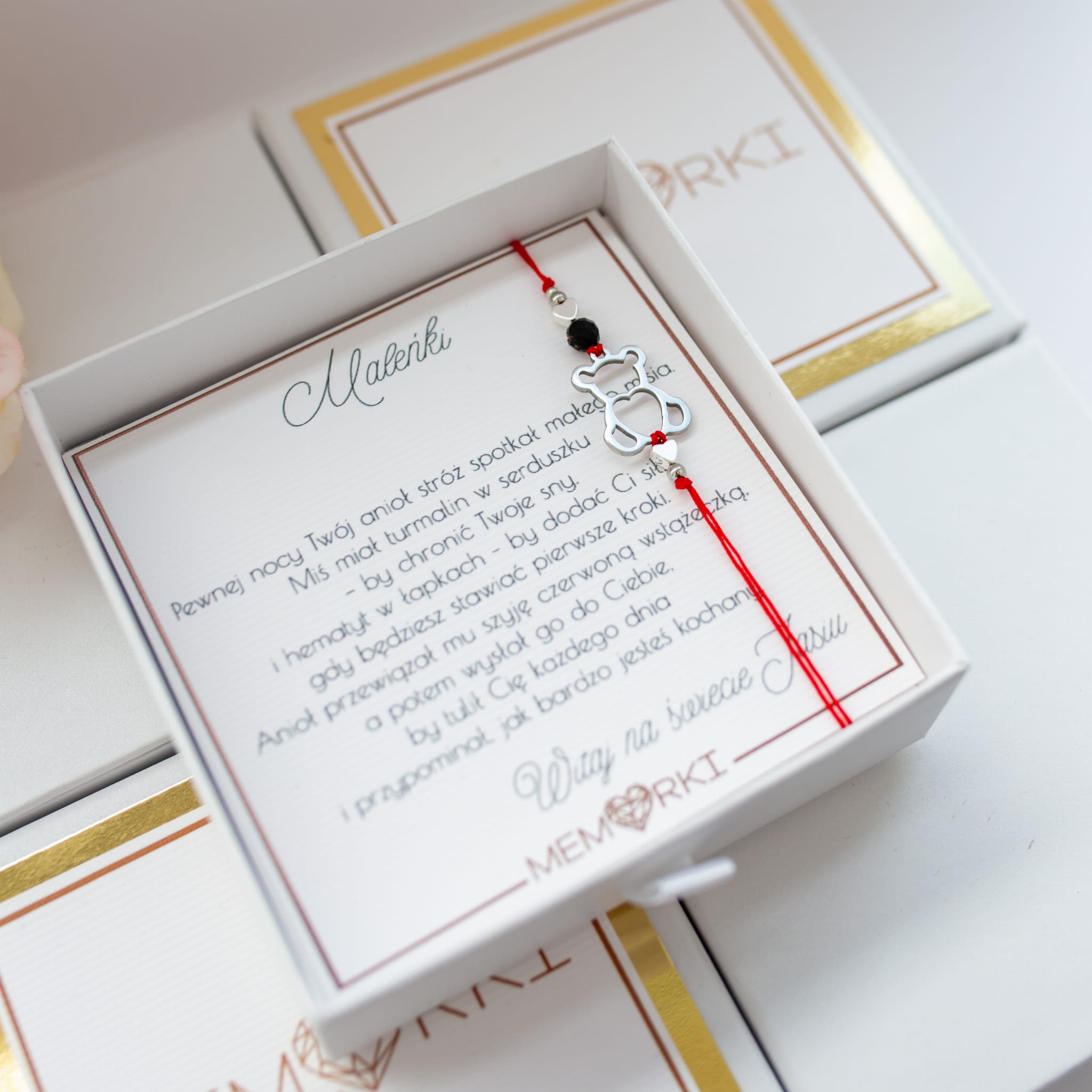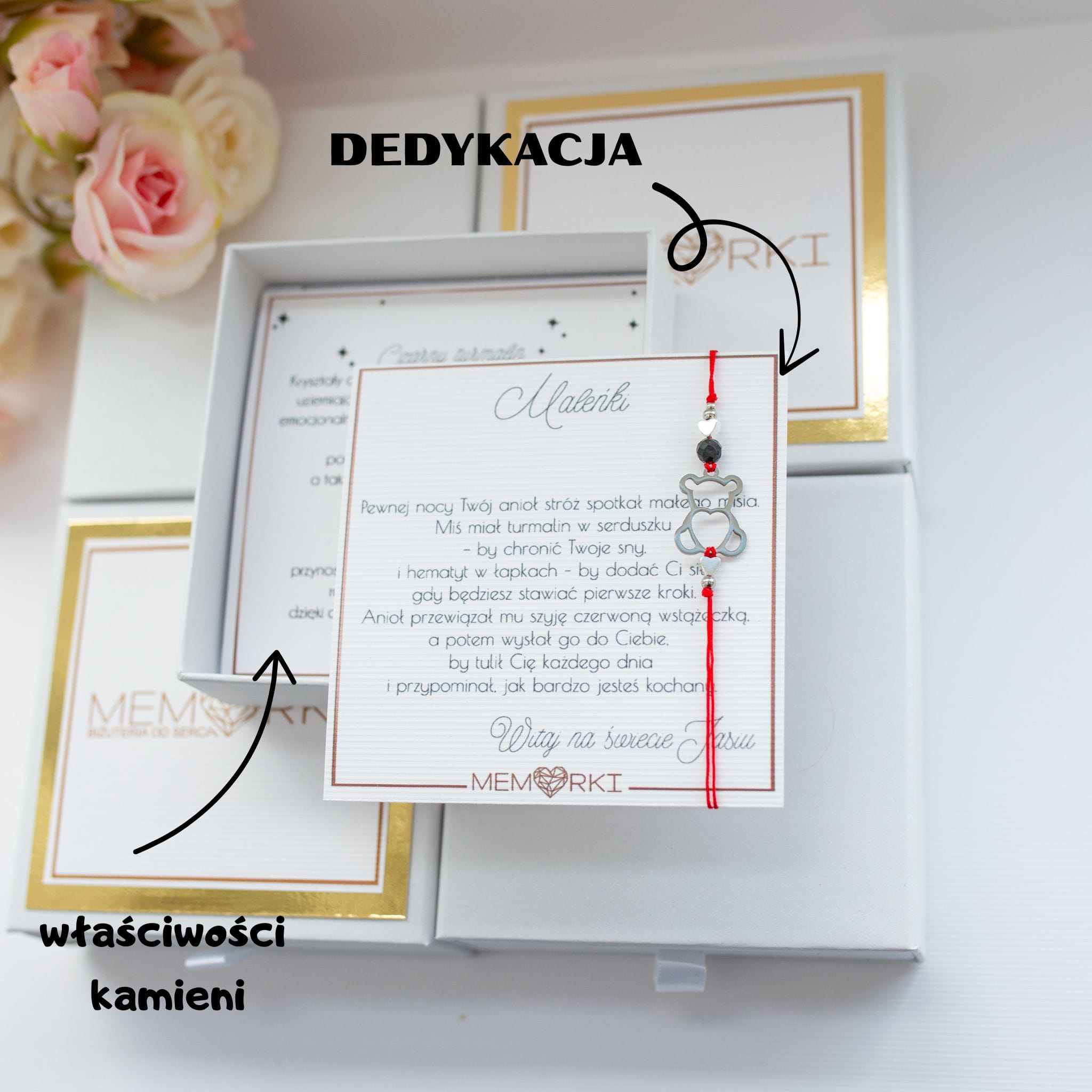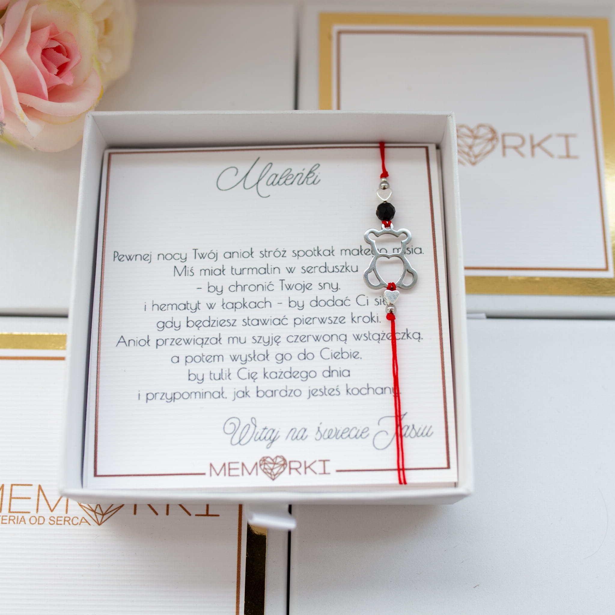 Bransoletka ochronna NARODZINY DZIECKA - turmalin, czerwony sznureczek i MIŚ
