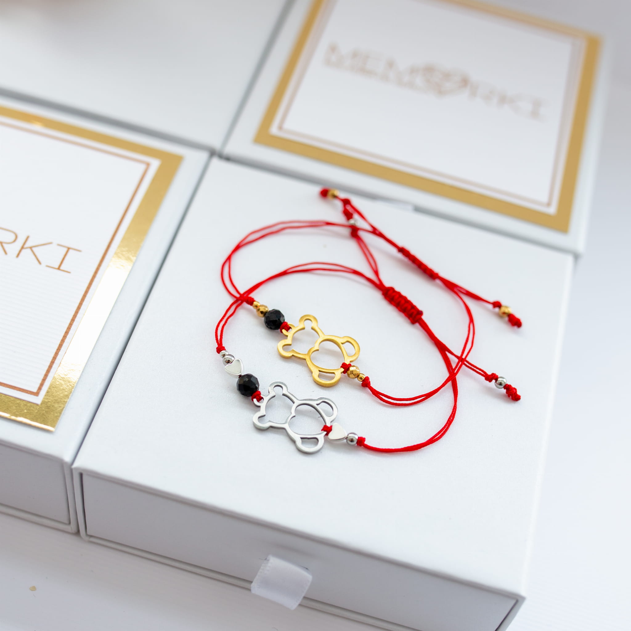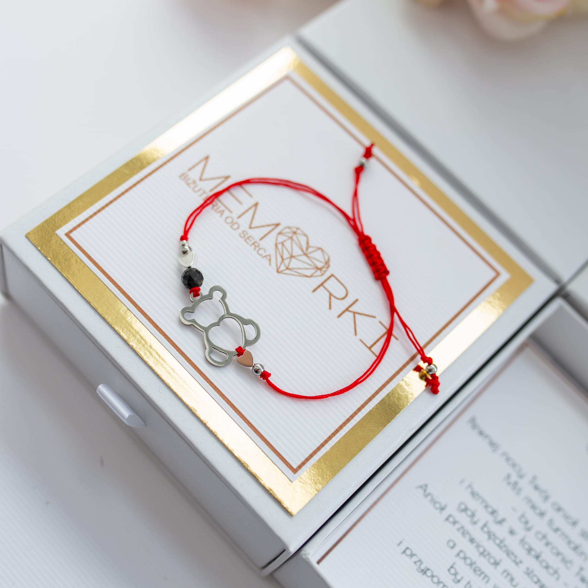 Misternie nanizane na czerwony sznurek jubilerski kamienie naturalne w połączeniu z ażurowym misiem ze stali chirurgicznej sprawdzą się doskonale niemal w każdej stylizacji dodając wdzięku i delikatności.