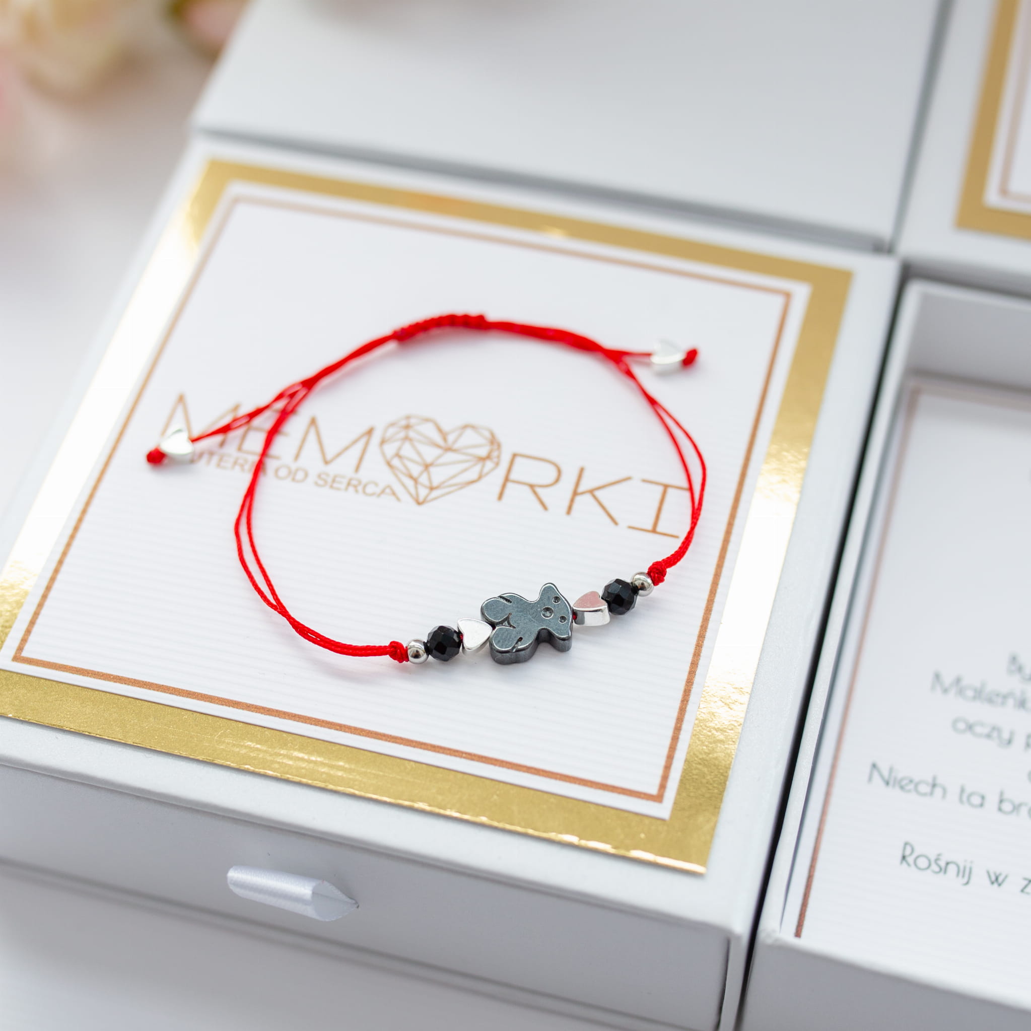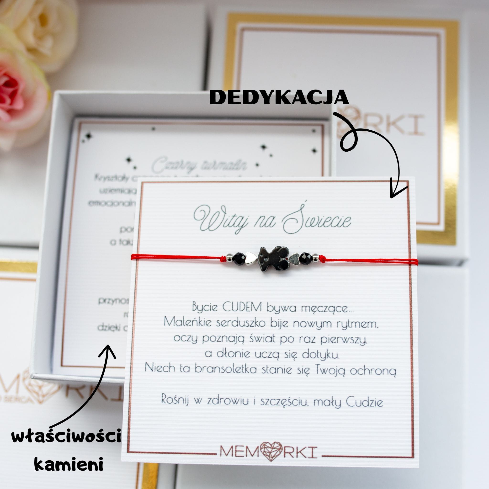 Misternie nanizane na czerwony sznurek jubilerski kamienie naturalne w połączeniu z misiem z hematytu sprawdzą się doskonale niemal w każdej stylizacji dodając wdzięku i delikatności, a czerwony sznureczek nawiązując do tradycji chronić będzie maleństwo przed złymi urokami.