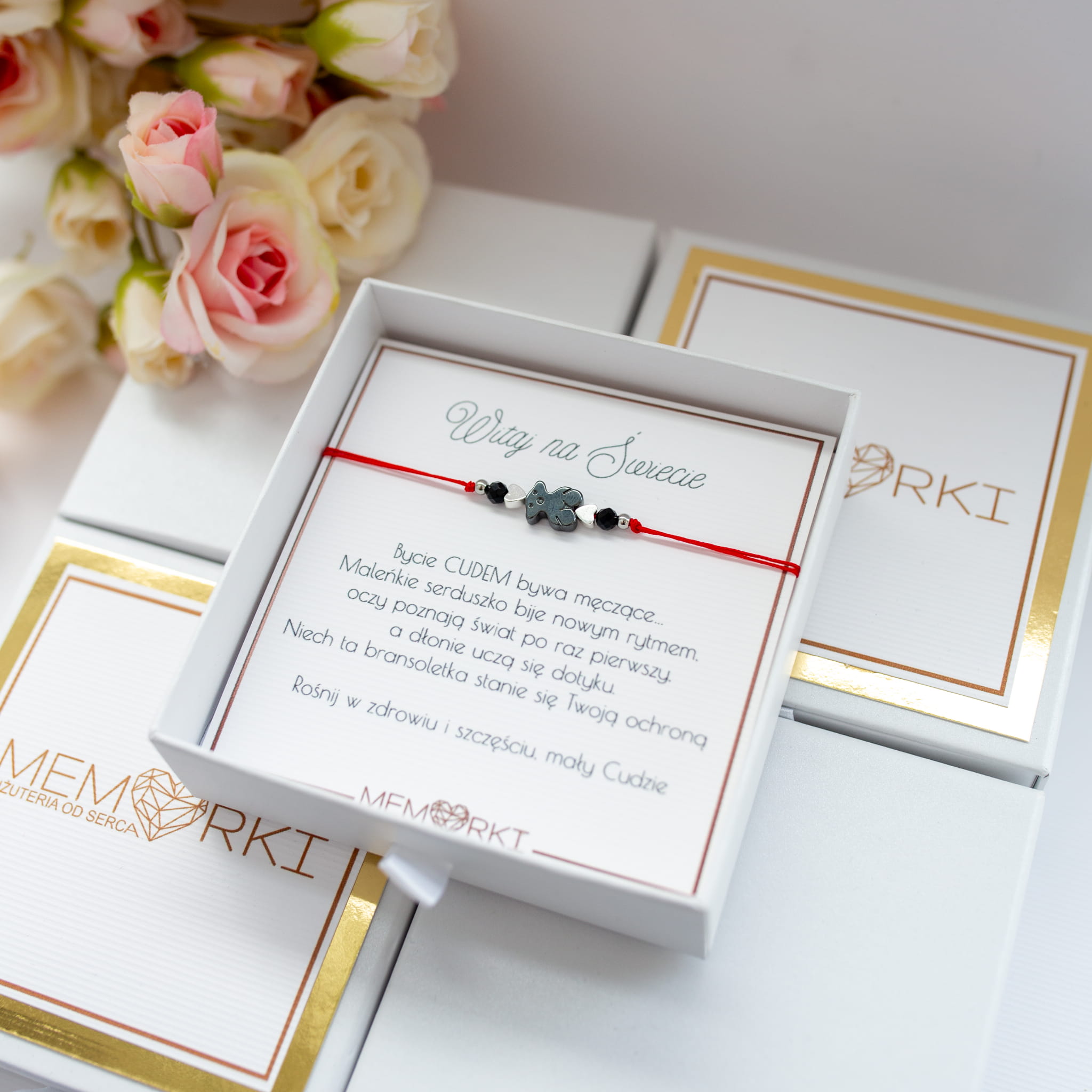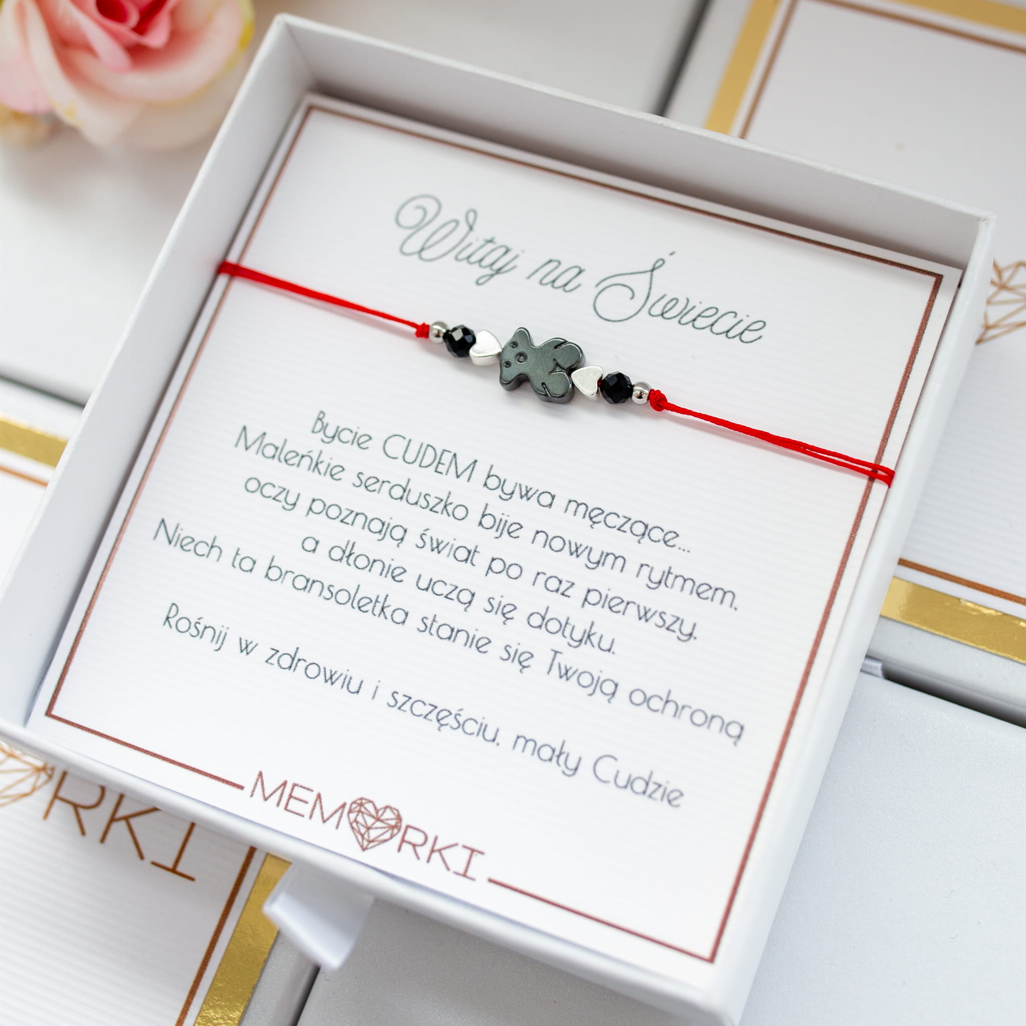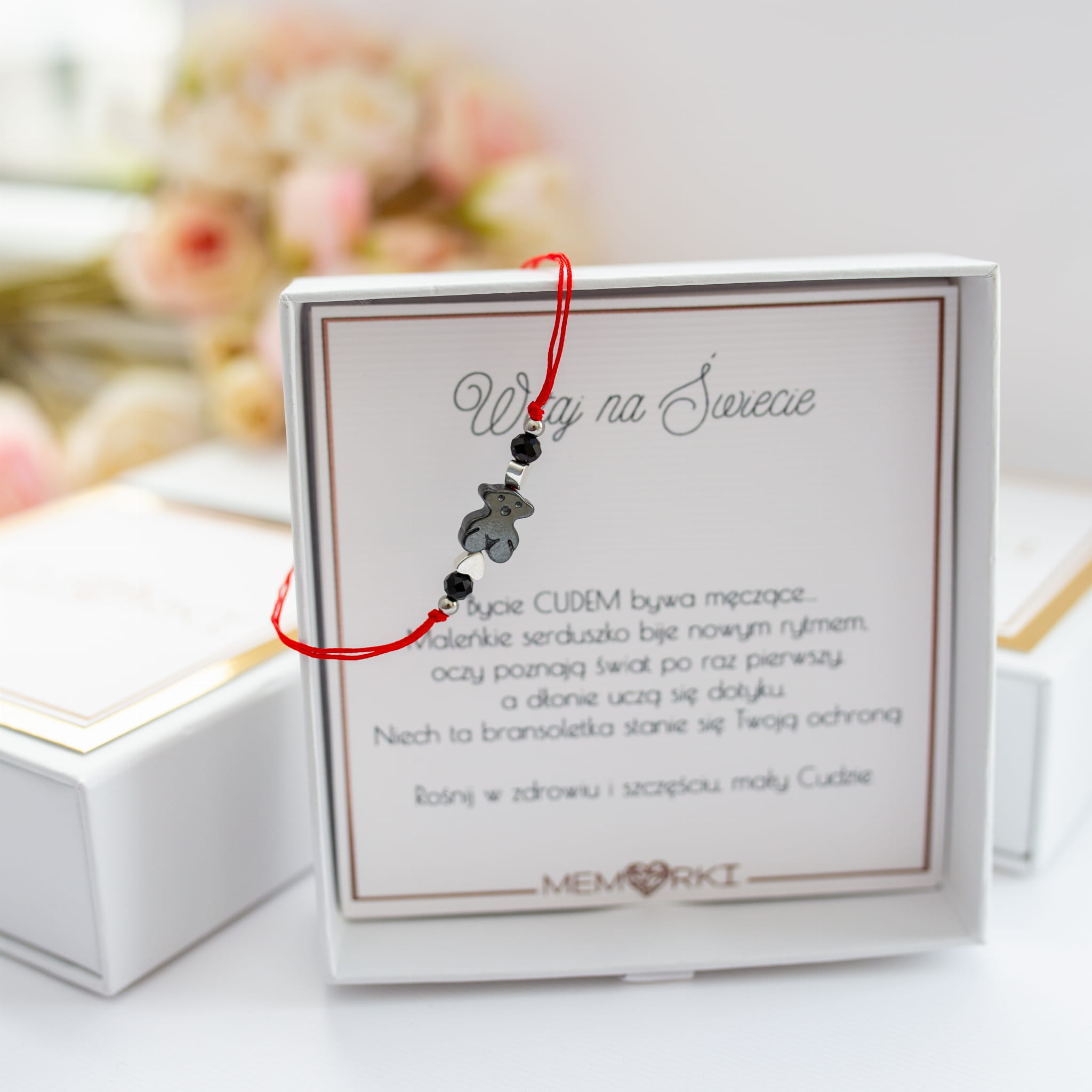 Bransoletka ochronna NARODZINY DZIECKA - turmalin, czerwony sznureczek i MIŚ