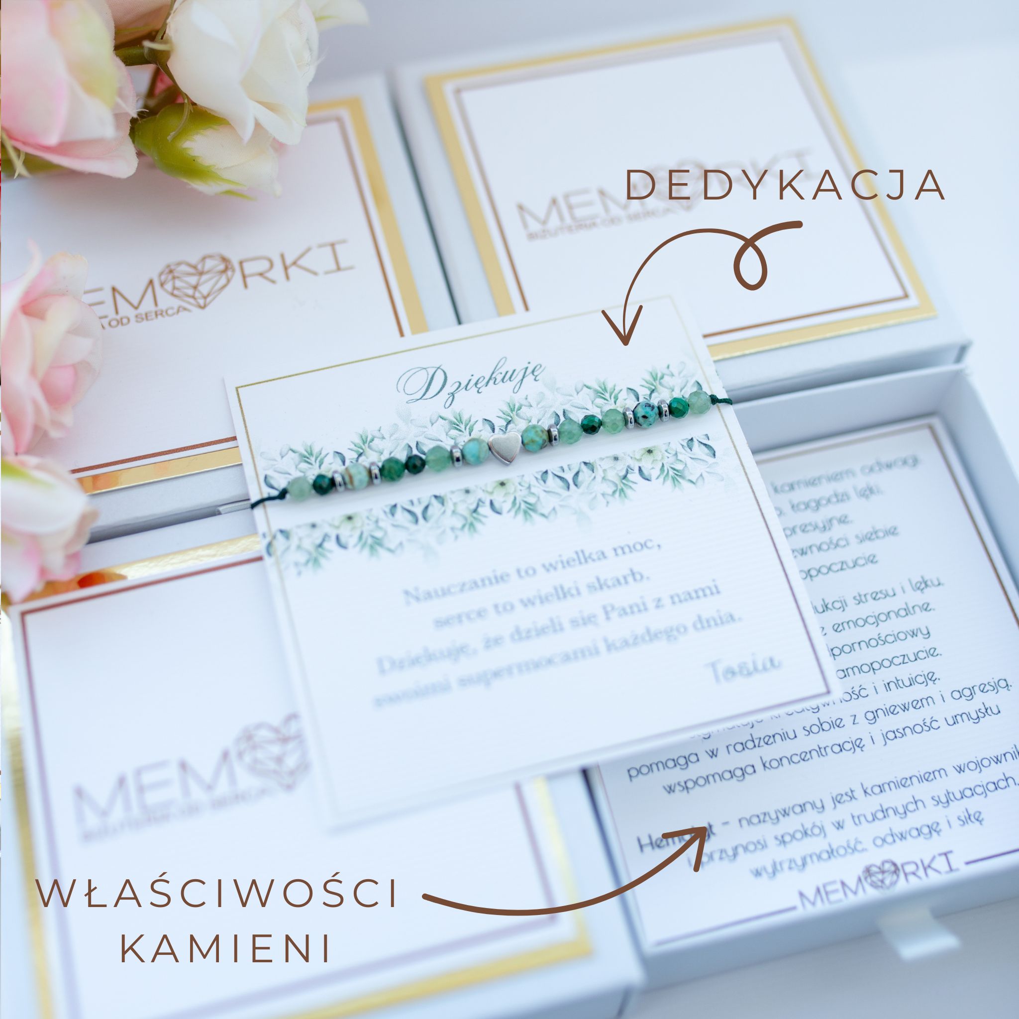 Misternie nanizane na bardzo wytrzymały jedwabny sznureczek jubilerski, kamienie naturalne w połączeniu ze stalą chirurgiczną sprawdzą się doskonale jako drobiazgowa pamiątka z okazji końca roku szkolnego w przedszkolu i szkole, dnia nauczyciela, matur itd.