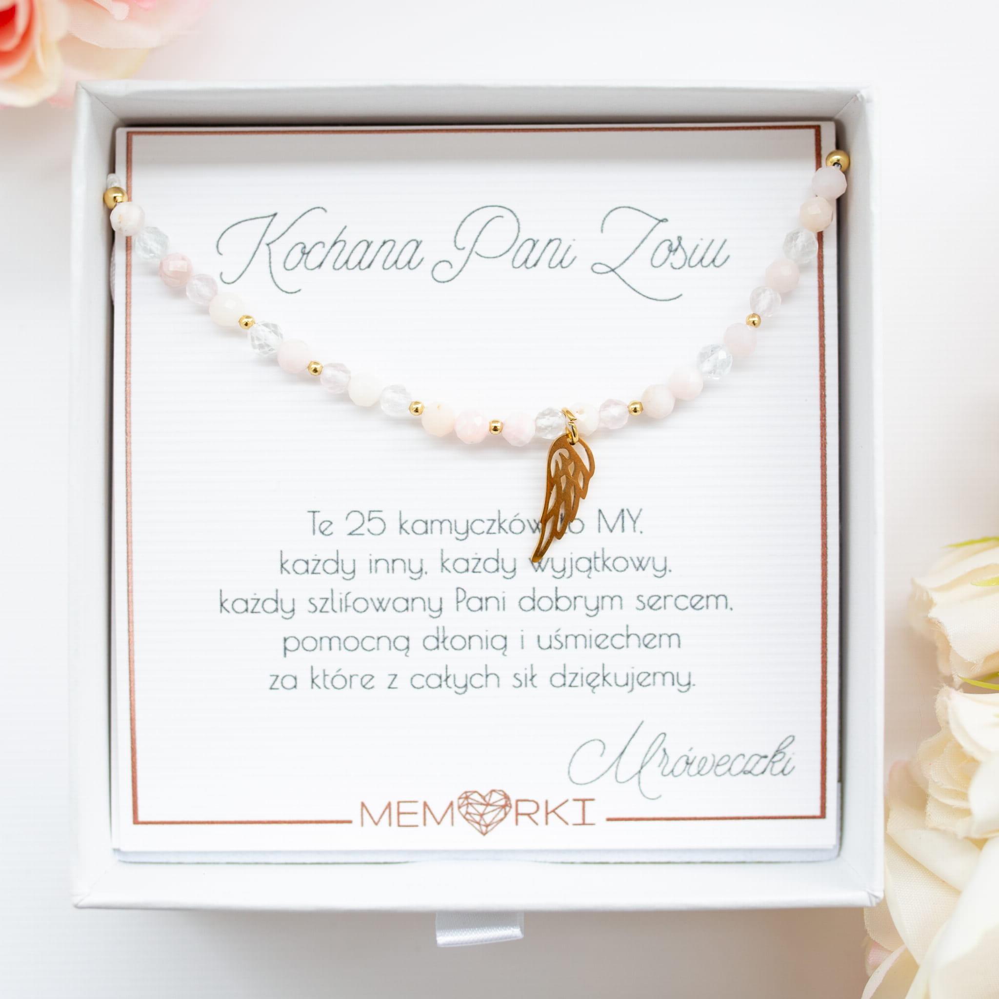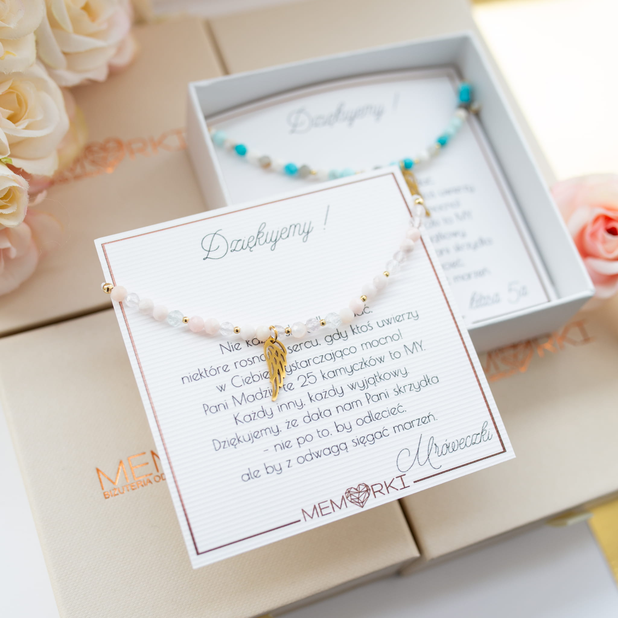Misternie nanizane na bardzo wytrzymały jedwabny sznureczek jubilerski, kamienie naturalne w połączeniu ze stalą chirurgiczną sprawdzą się doskonale jako drobiazgowa pamiątka z okazji końca roku szkolnego w przedszkolu i szkole, dnia nauczyciela, matur itd.