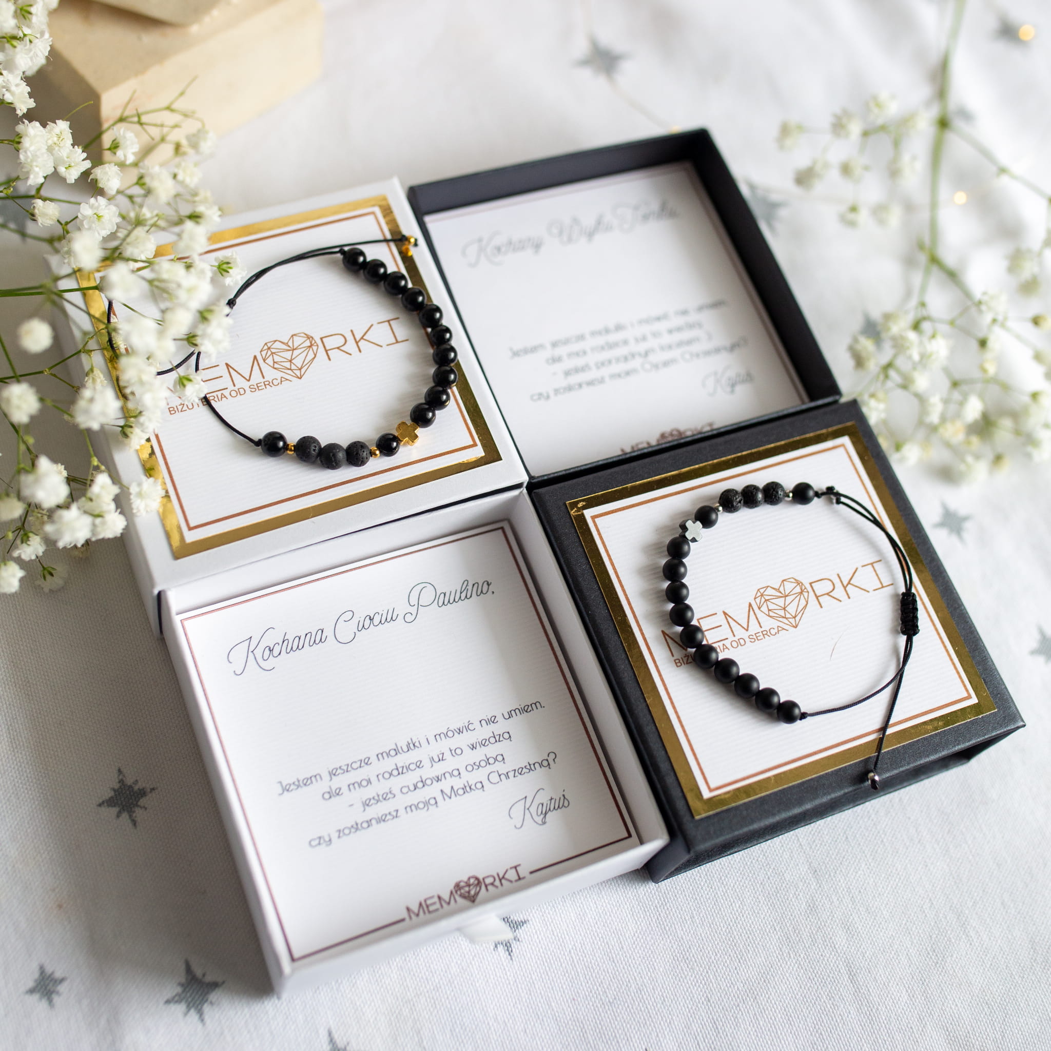Każda bransoletka zapakowana jest w eleganckie ekologiczne pudełeczko do wyboru w kolorze CZARNYM lub BIAŁYM.
