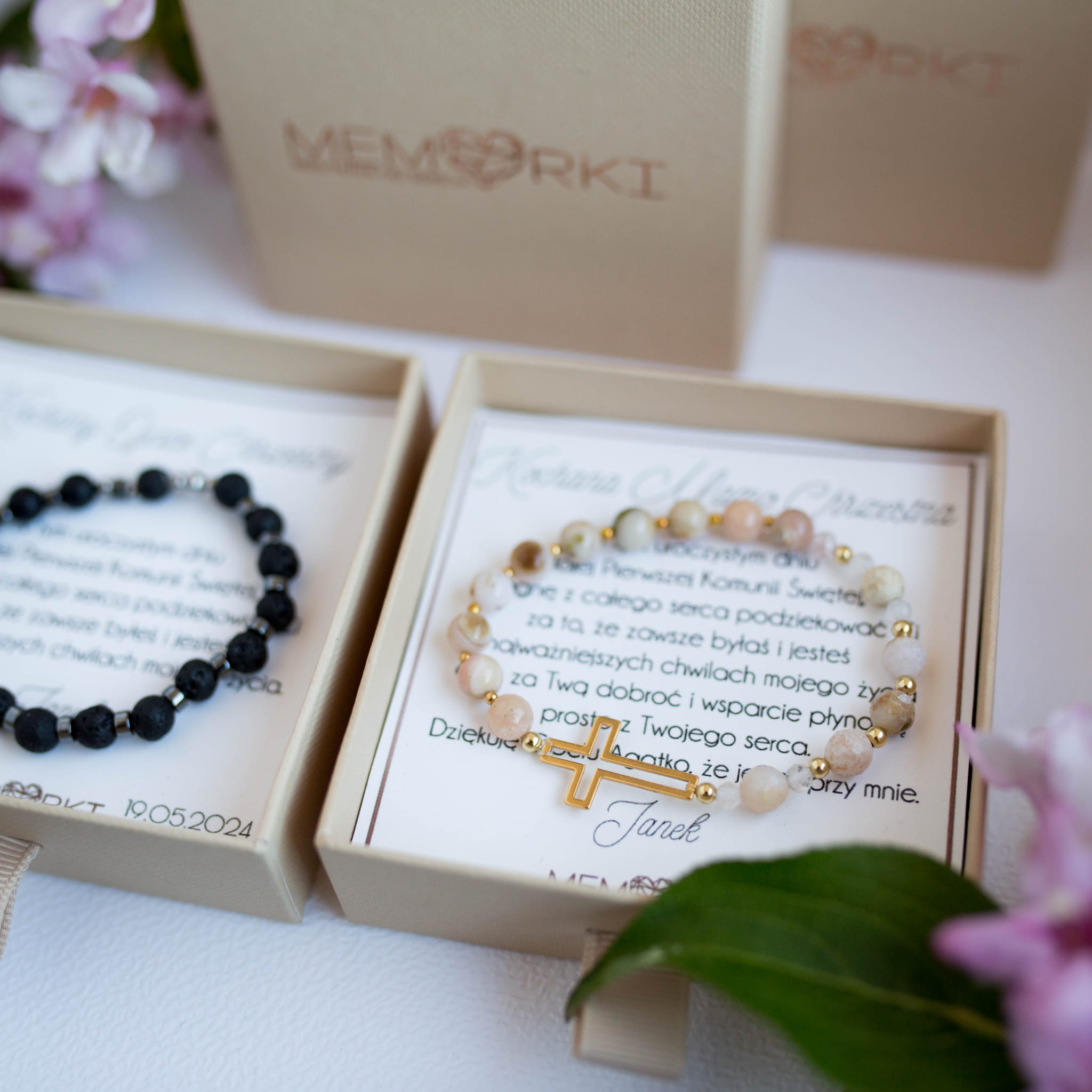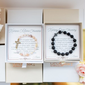 Misternie nanizane na bardzo wytrzymałą gumeczkę jubilerską, kamienie naturalne w połączeniu ze stalą chirurgiczną sprawdzą się doskonale jako drobiazgowa pamiątka z okazji Chrztu, Komunii Świętej, Bierzmowania, Ślubu itd
