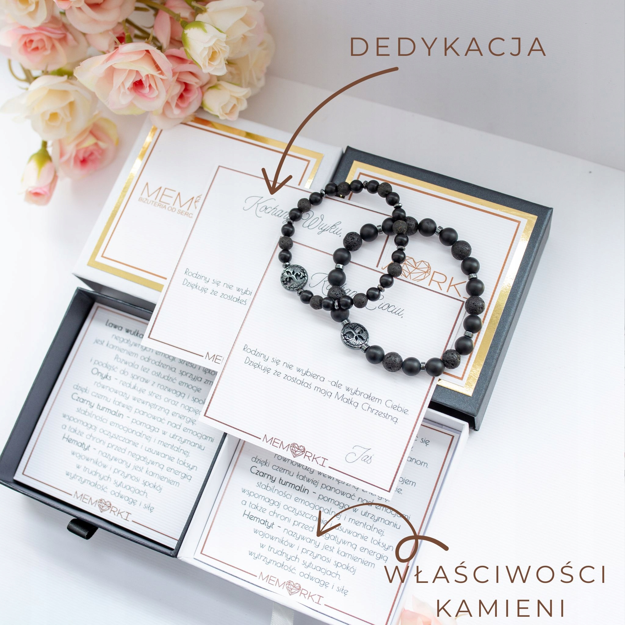 Szukasz wyjątkowego sposobu, by wyrazić wdzięczność rodzicom chrzestnym? Ręcznie robione bransoletki na podziękowanie dla chrzestnych od Memorki.com.pl to idealny upominek na chrzest, komunię czy ślub. Każdy zestaw zawiera dwie bransoletki na elastycznej gumce jubilerskiej, wykonane z kamieni naturalnych o głębokiej symbolice – lawa wulkaniczna, onyks i hematyt.