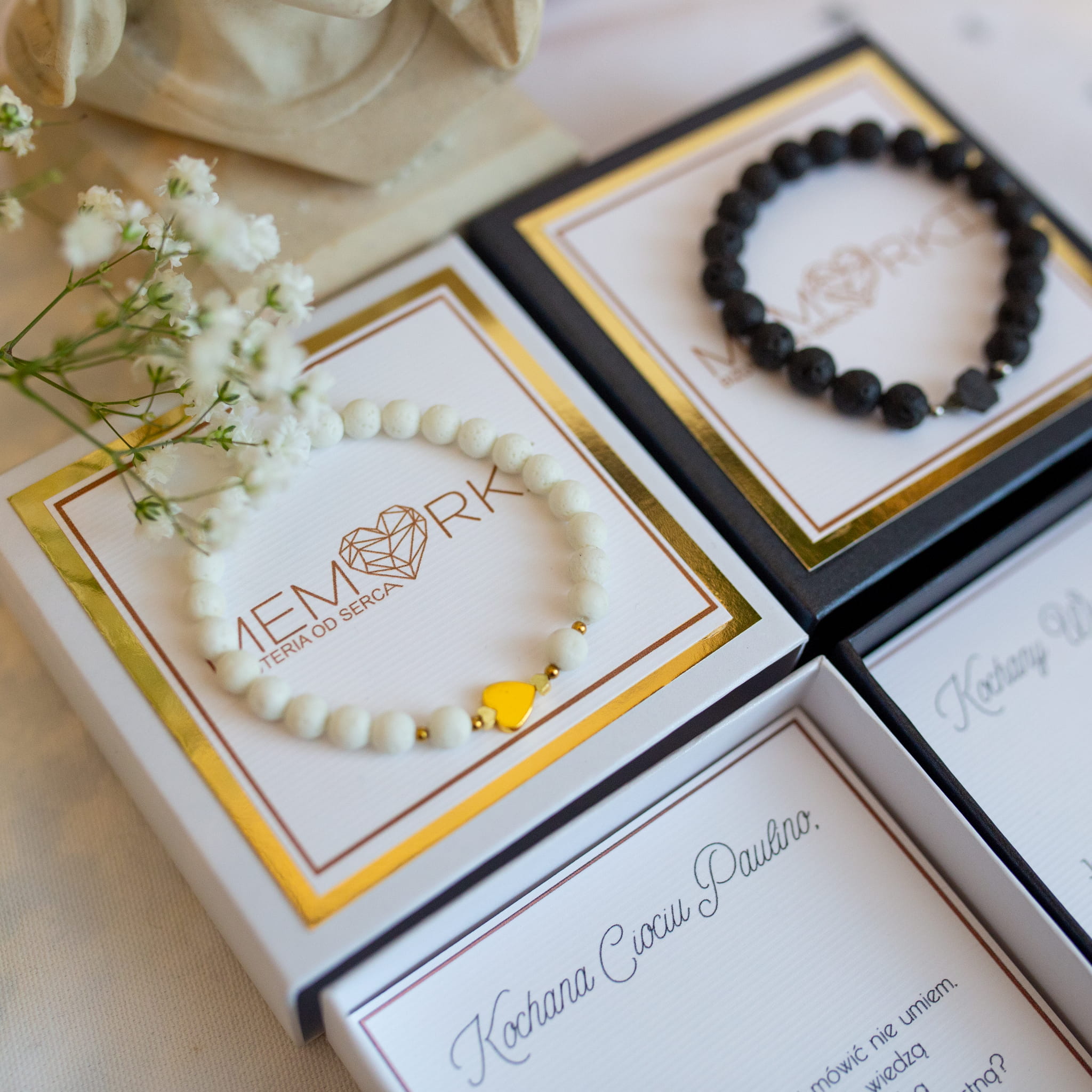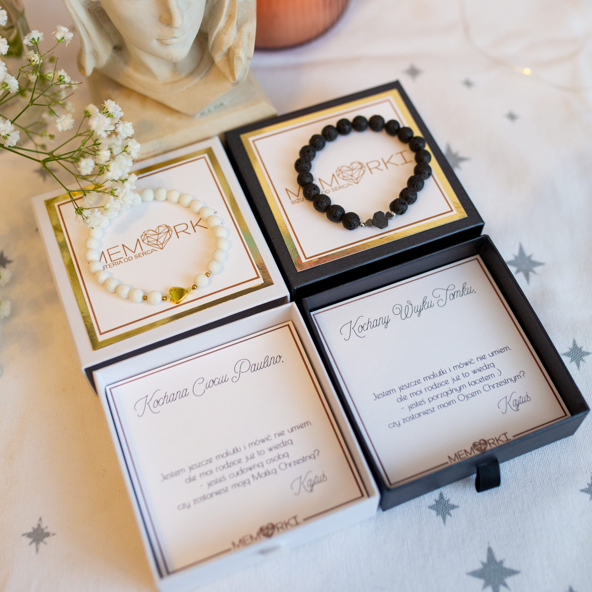 Każda bransoletka zapakowana jest w eleganckie ekologiczne pudełeczko do wyboru w kolorze CZARNYM lub BIAŁYM.