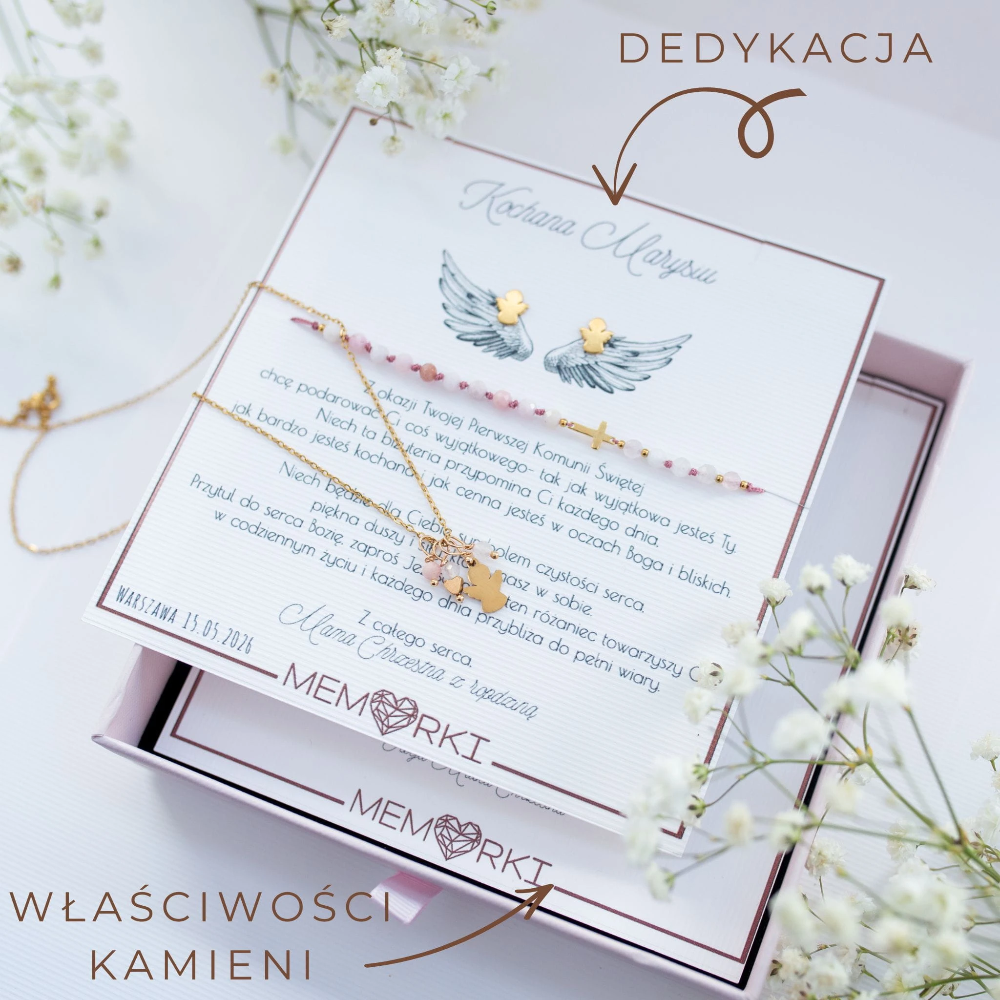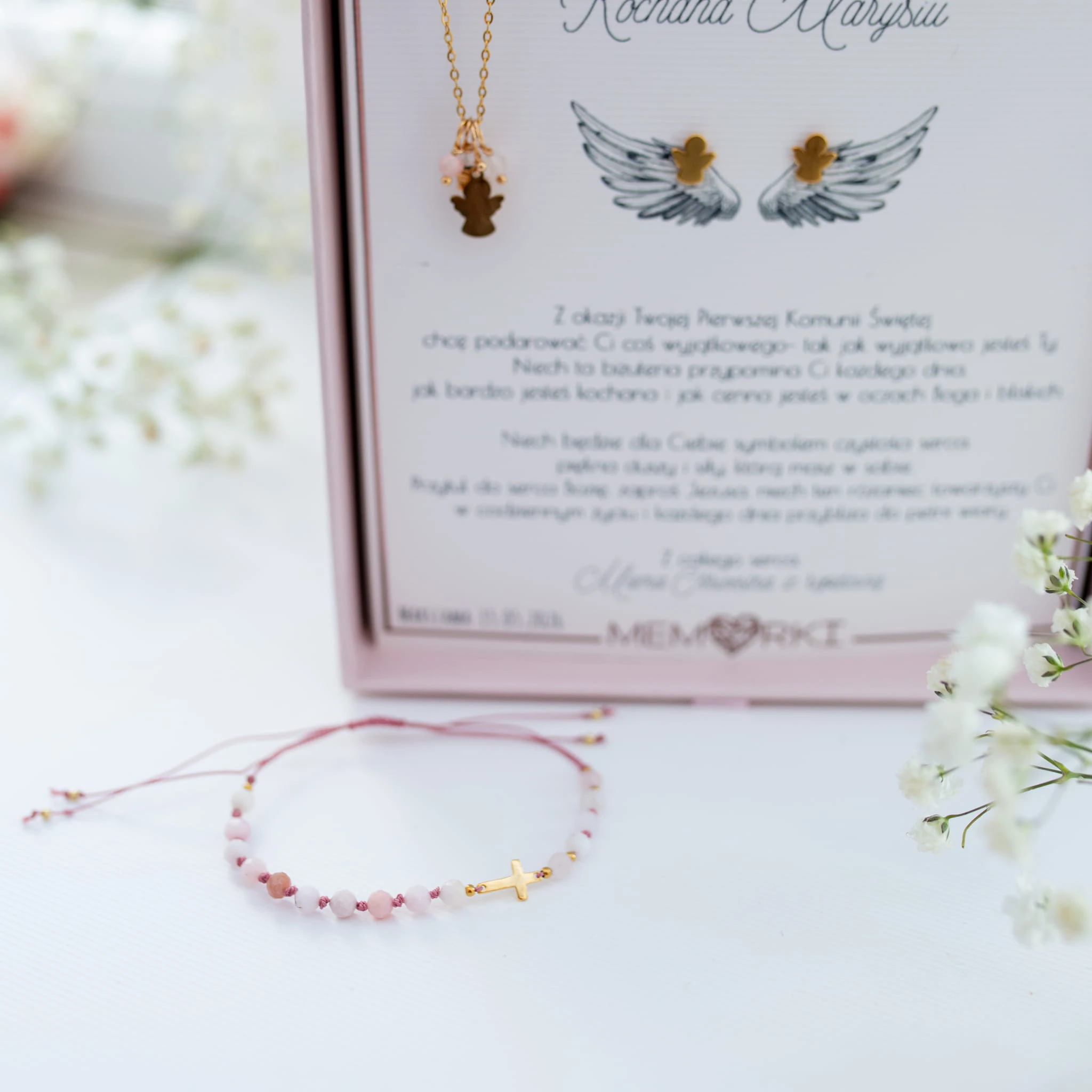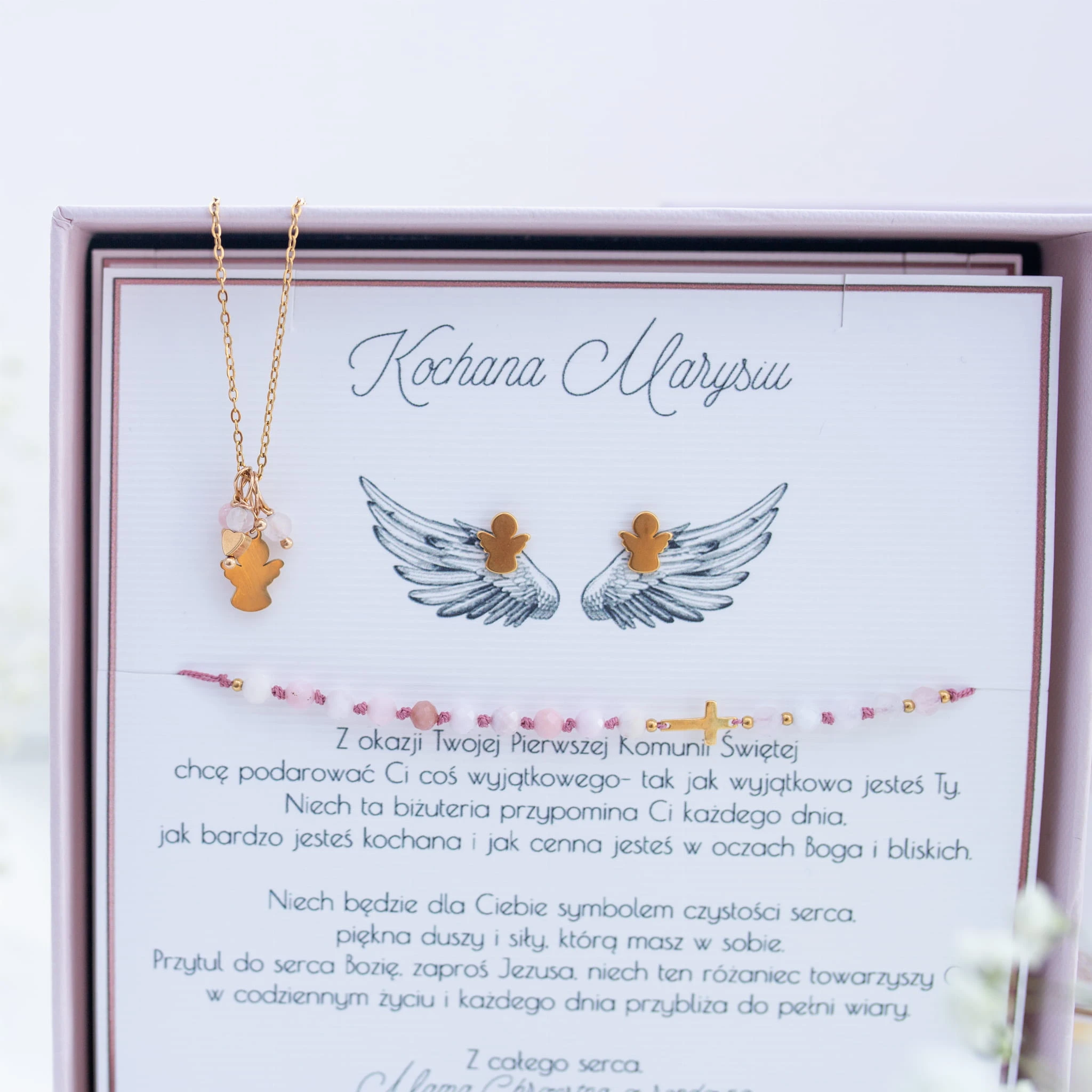 Podaruj wyjątkową pamiątkę na Pierwszą Komunię Świętą – delikatny i symboliczny komplet biżuterii z motywem aniołka. To piękny upominek, który będzie towarzyszył dziecku przez lata, przypominając o tym ważnym dniu i otaczającej je miłości.