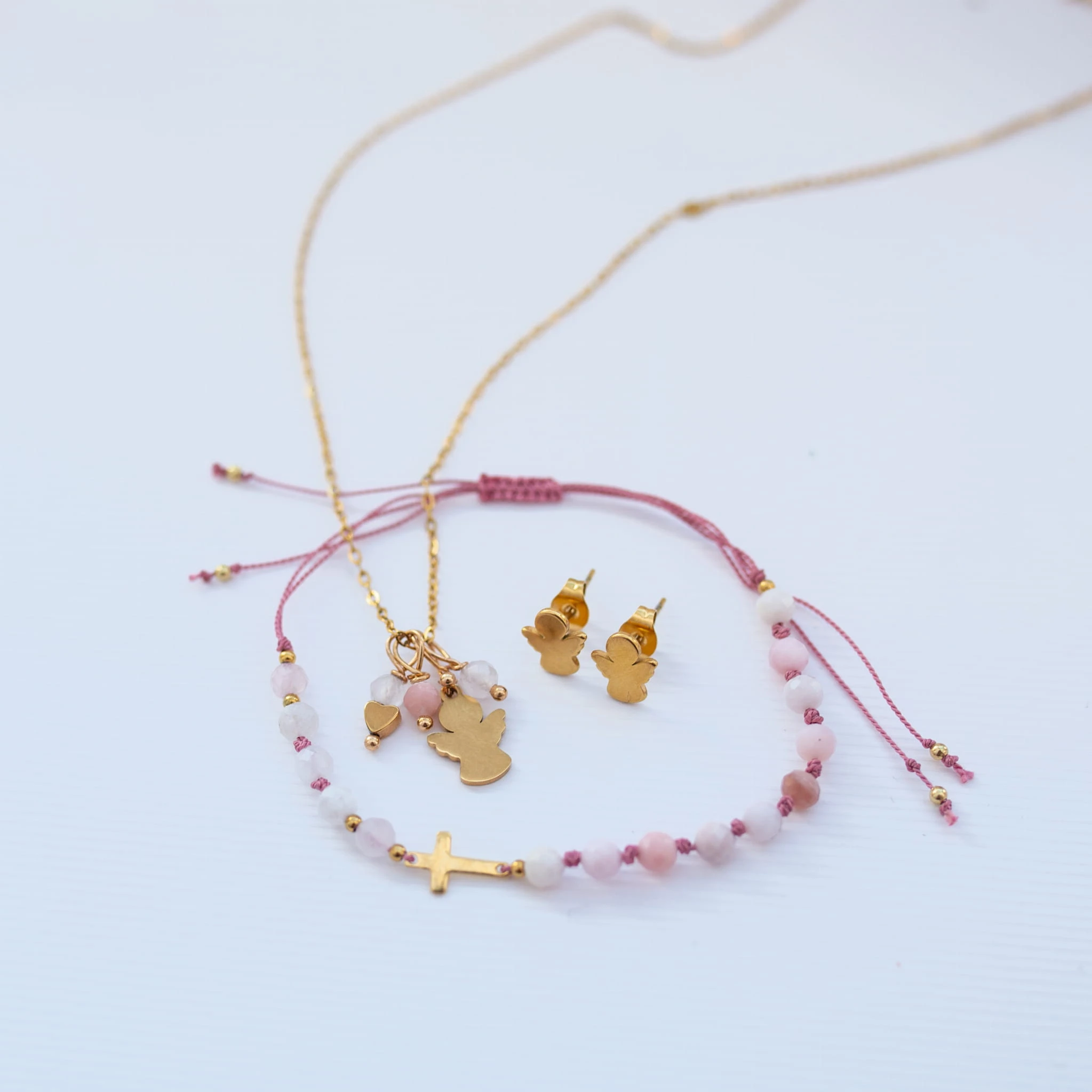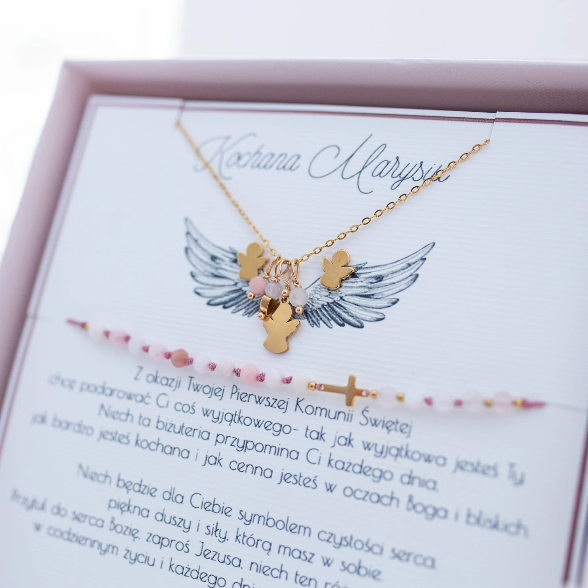 Pamiątka Komunijna – komplet ze stali szlachetnej i kamieni naturalnych z aniołkiem.