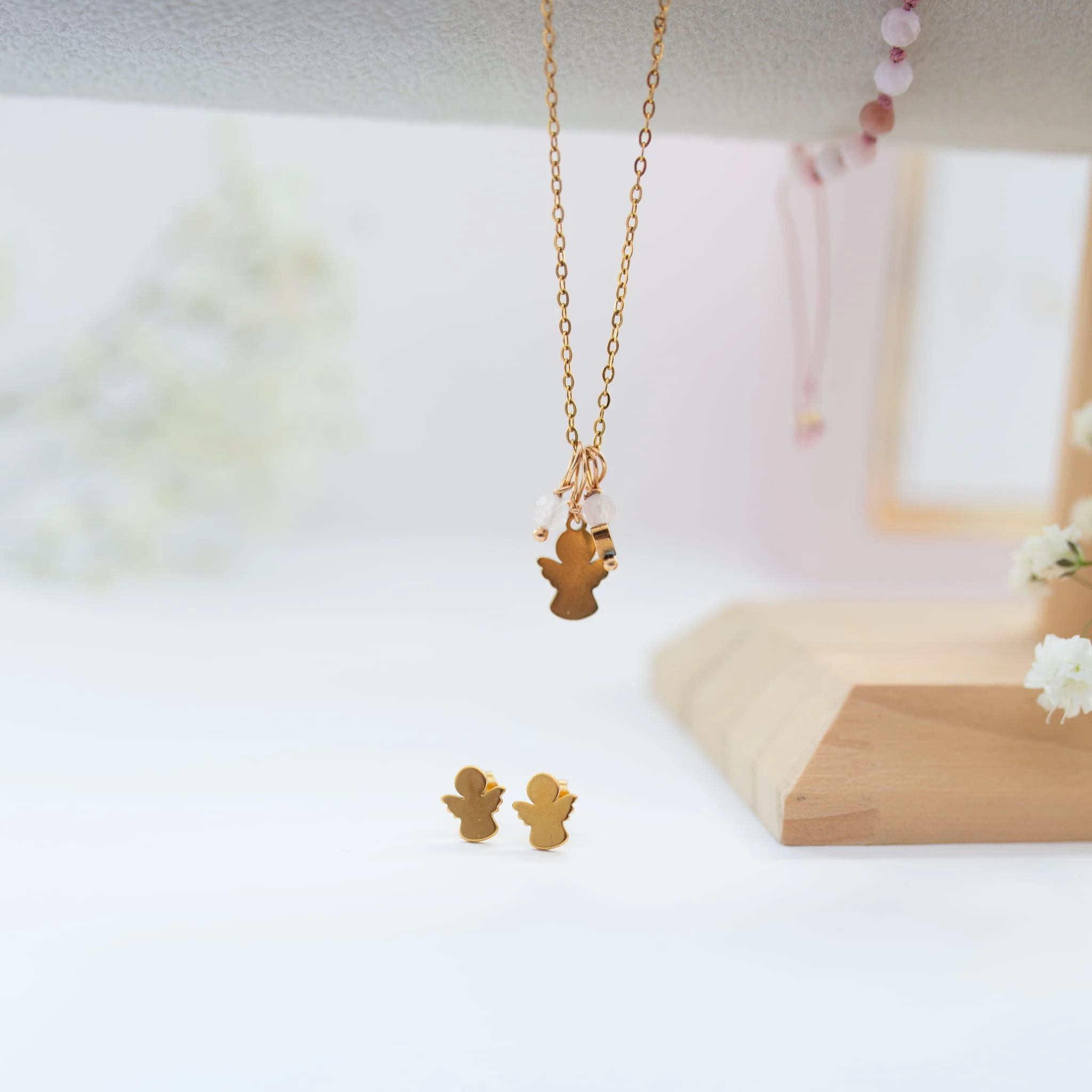 Pamiątka komunijna- łańcuszek+ kolczyki+ różaniec- aniołki ze stali