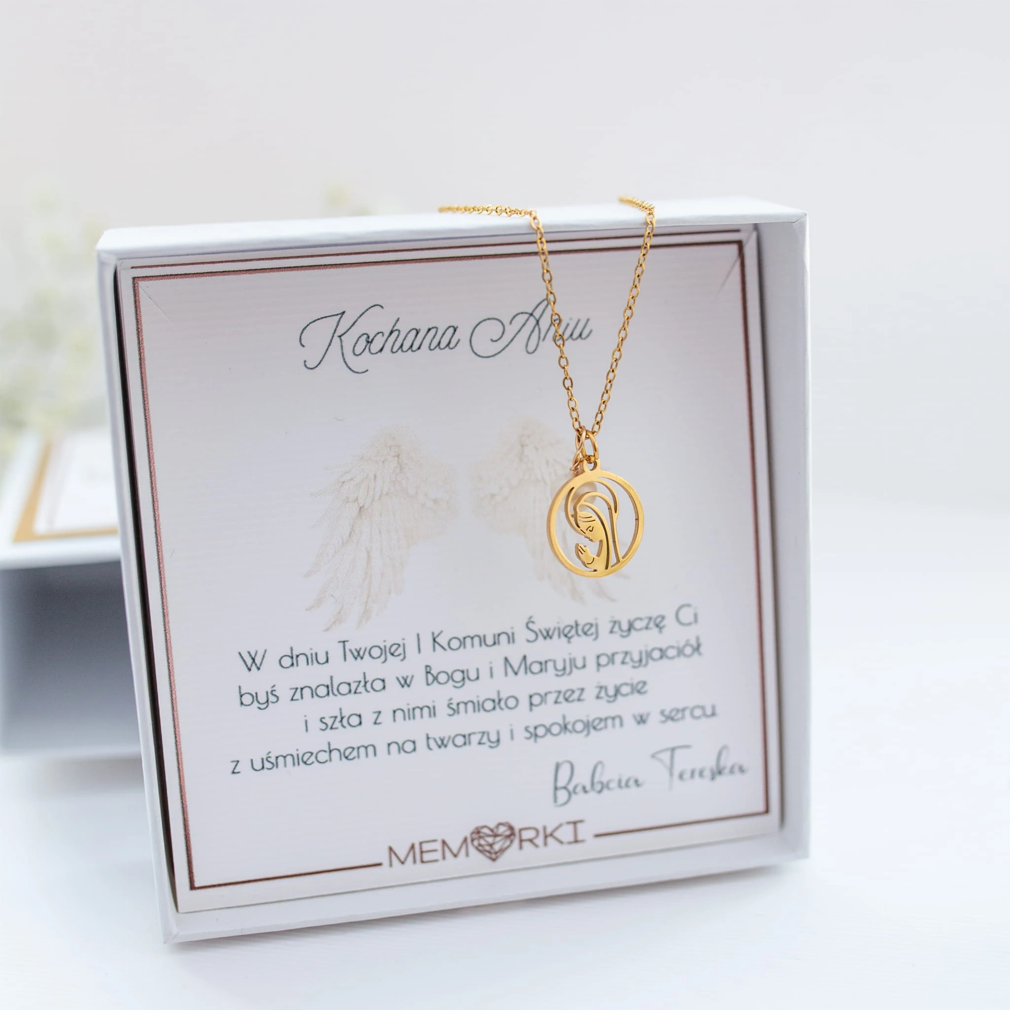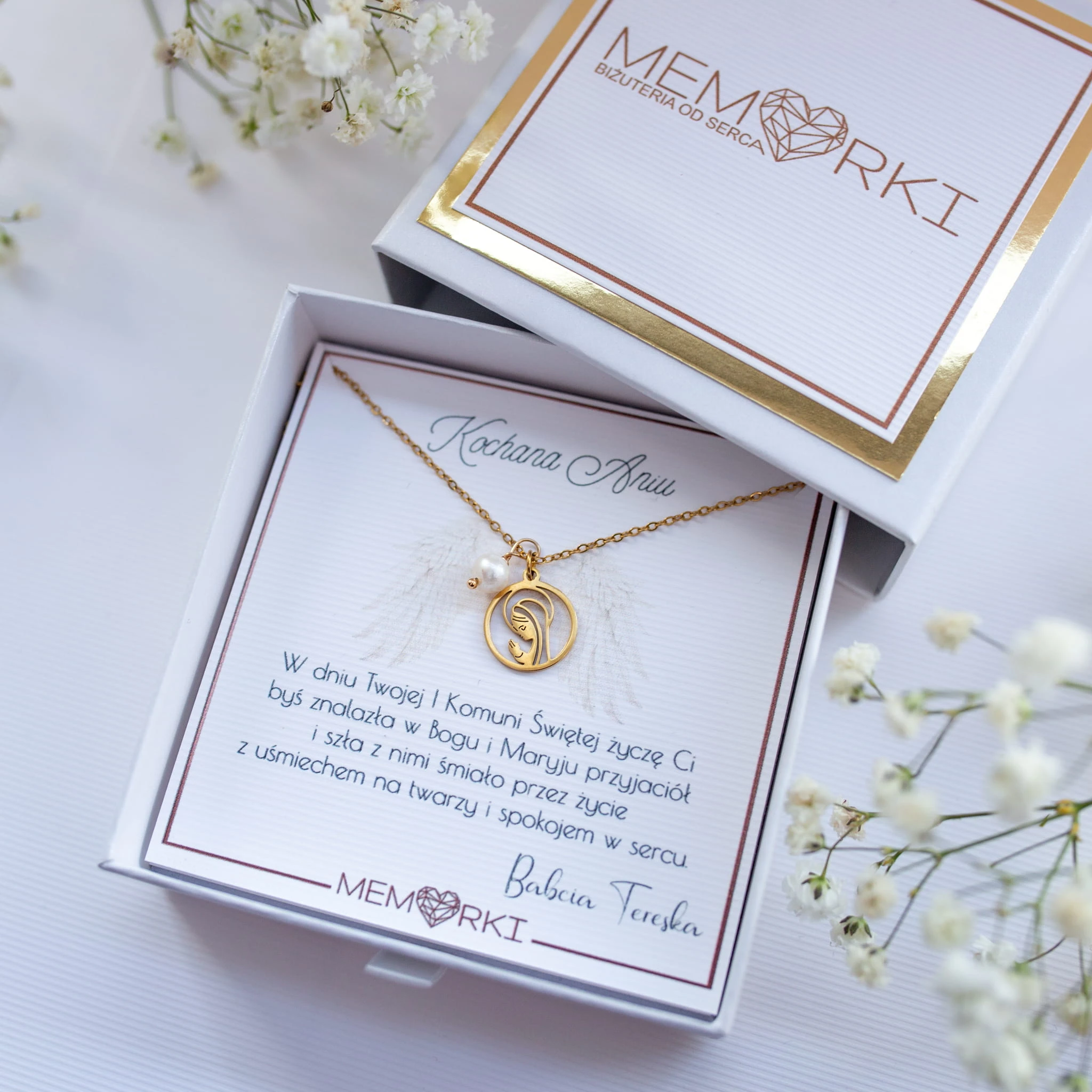 Podaruj wyjątkową pamiątkę na Pierwszą Komunię Świętą – delikatny i symboliczny komplet biżuterii z medalikiem Matki Boskiej i białą perłą. To piękny upominek, który będzie towarzyszył dziecku przez lata, przypominając o tym ważnym dniu i otaczającej je miłości.