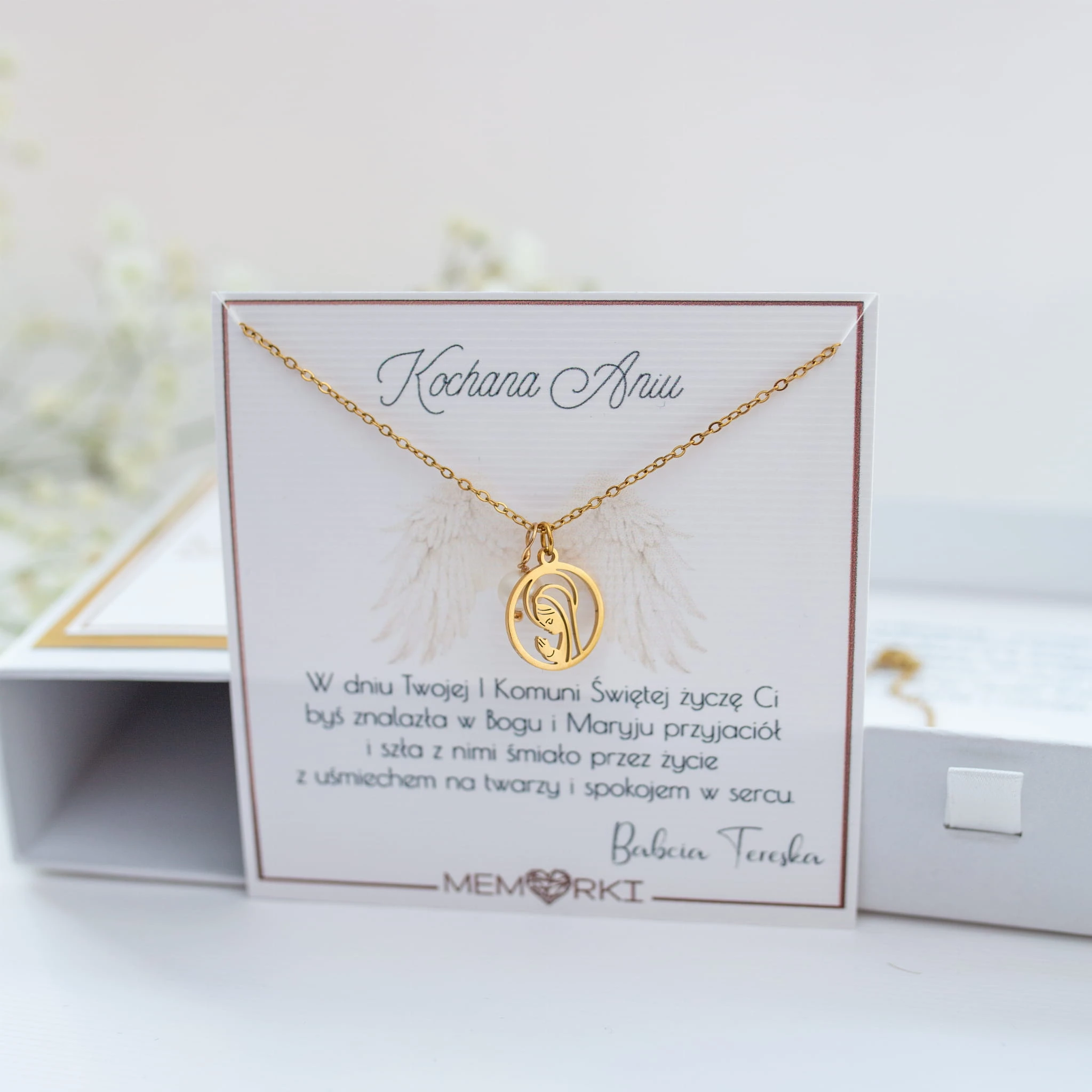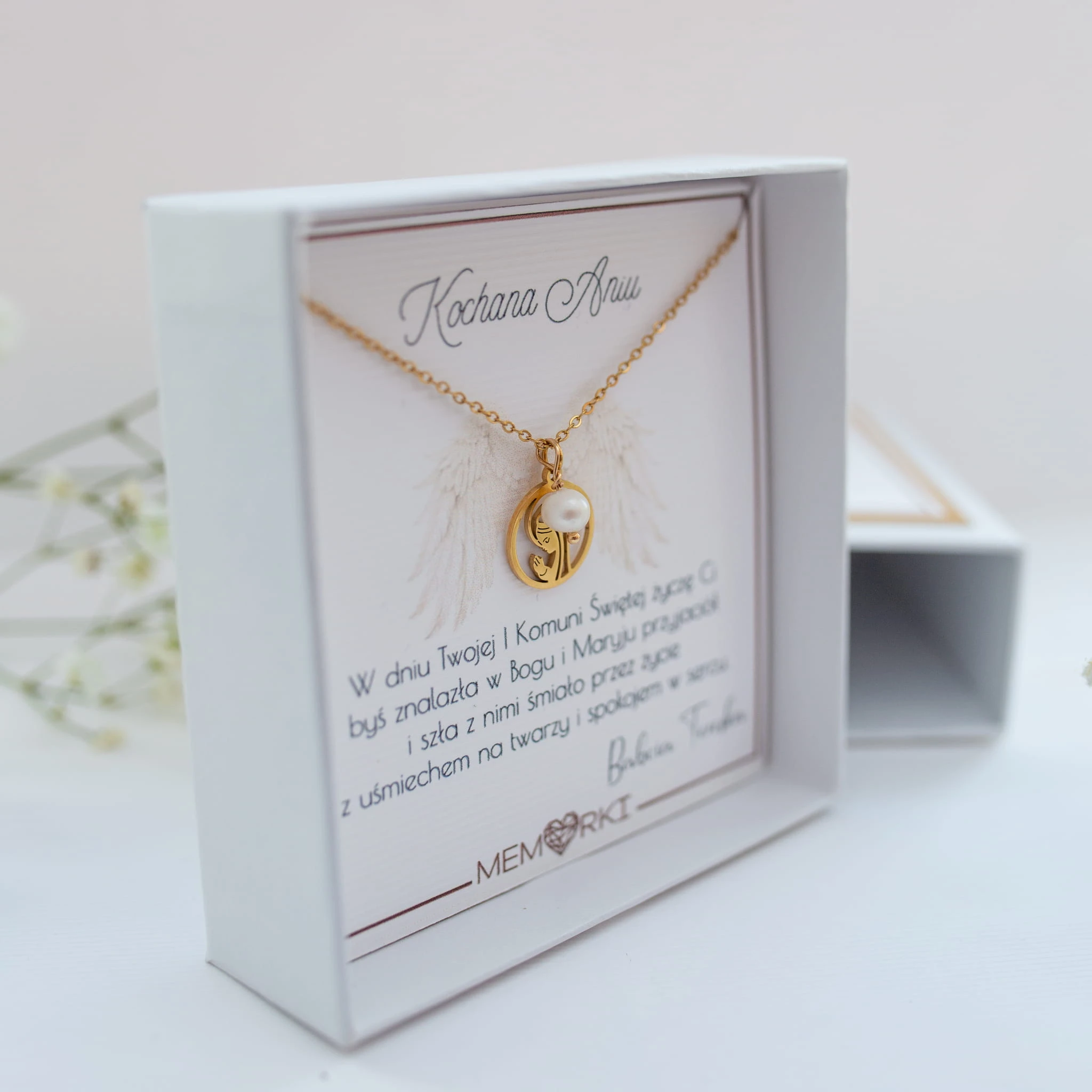 Pamiątka komunijna- łańcuszek z matką boską i perłą- stal nierdzewna