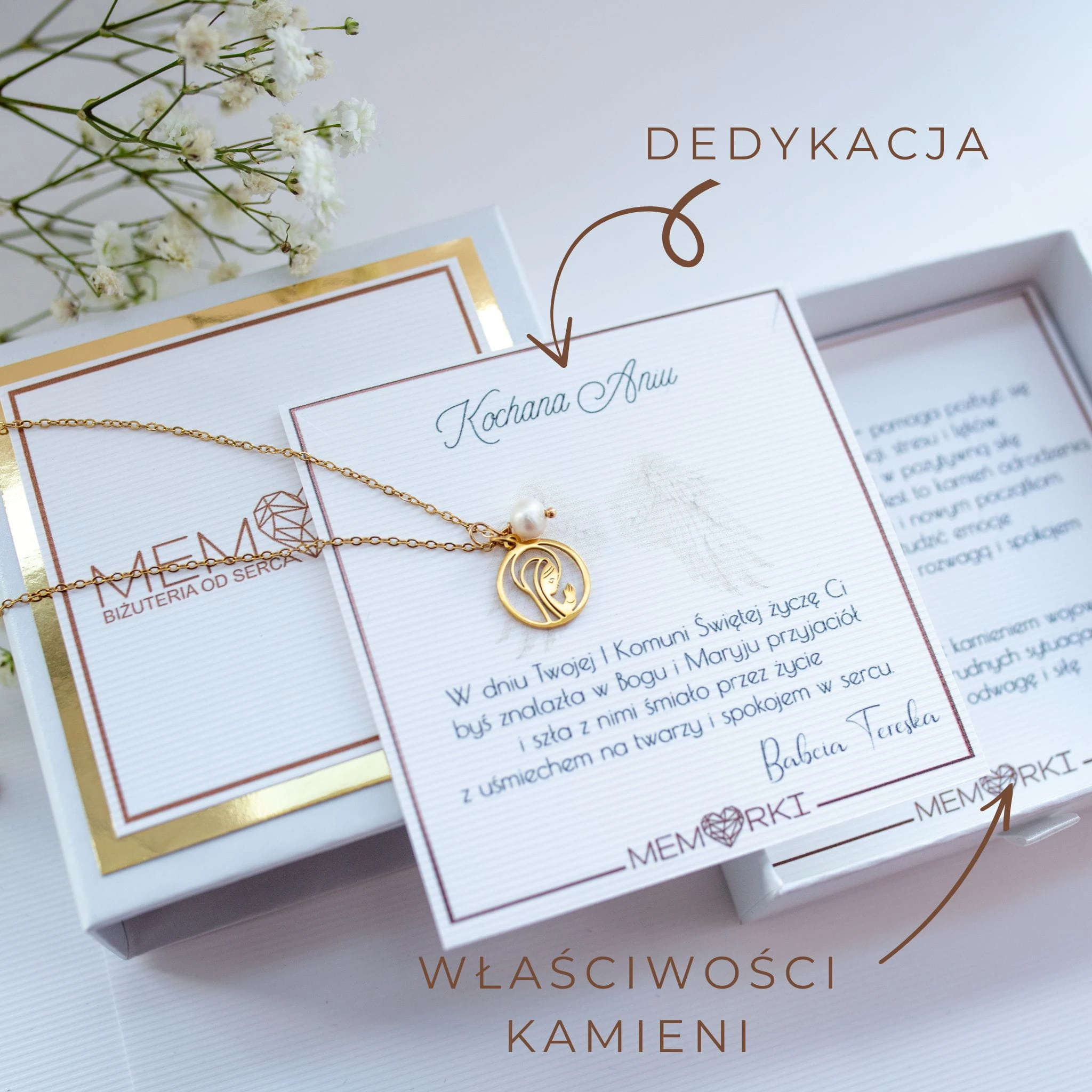 Pamiątka Komunijna ze stali szlachetnej i kamieni naturalnych – biżuteria z Matką Boską i perłą.