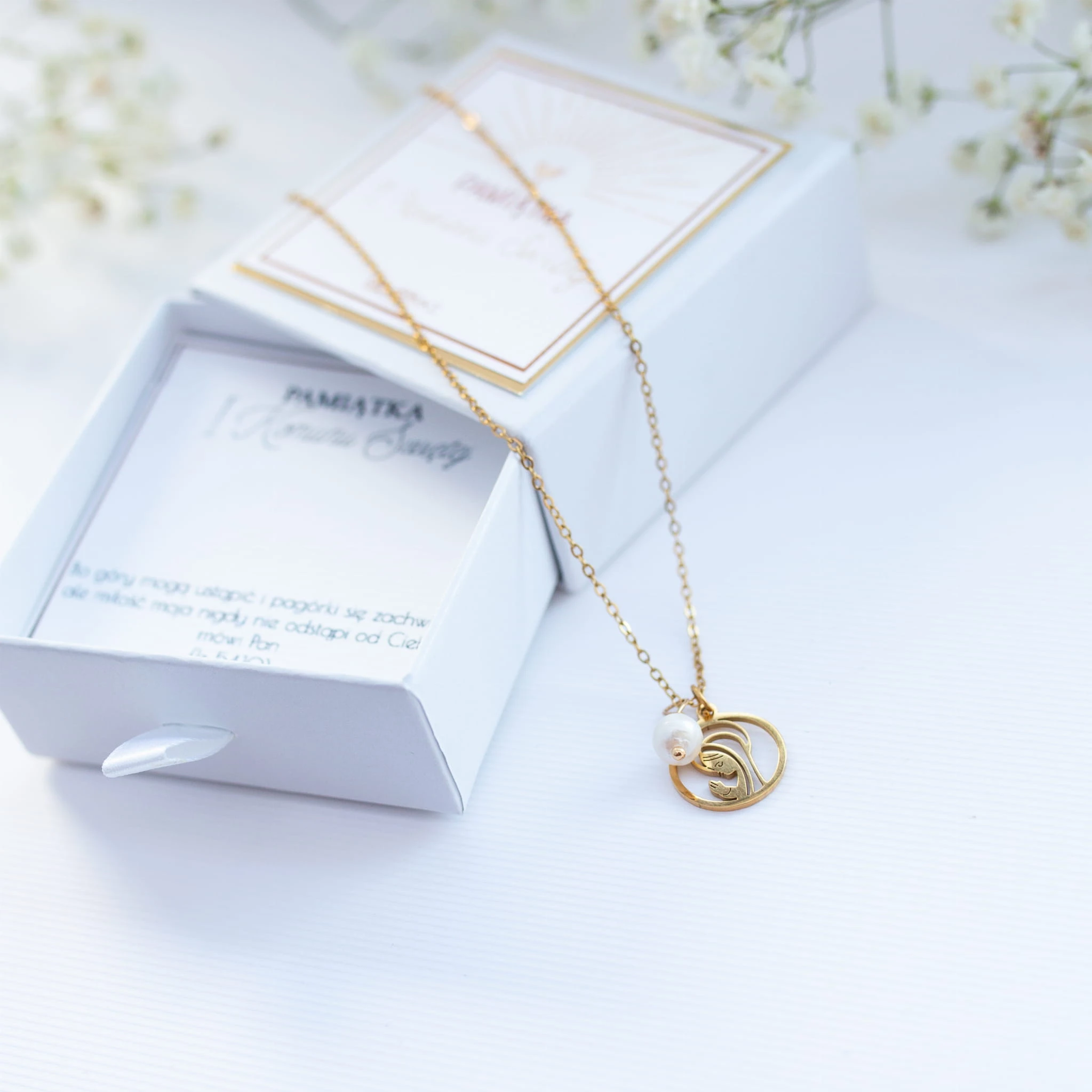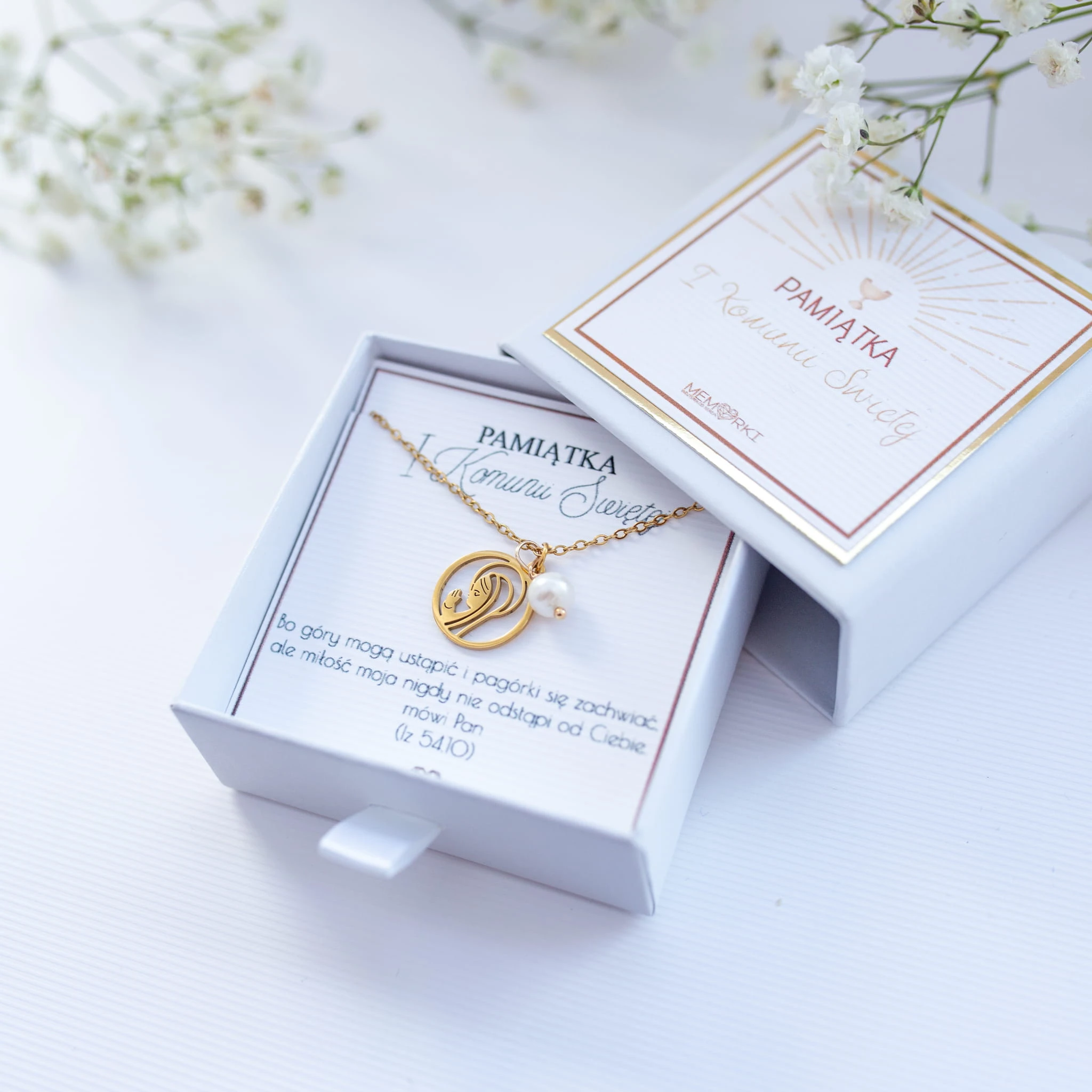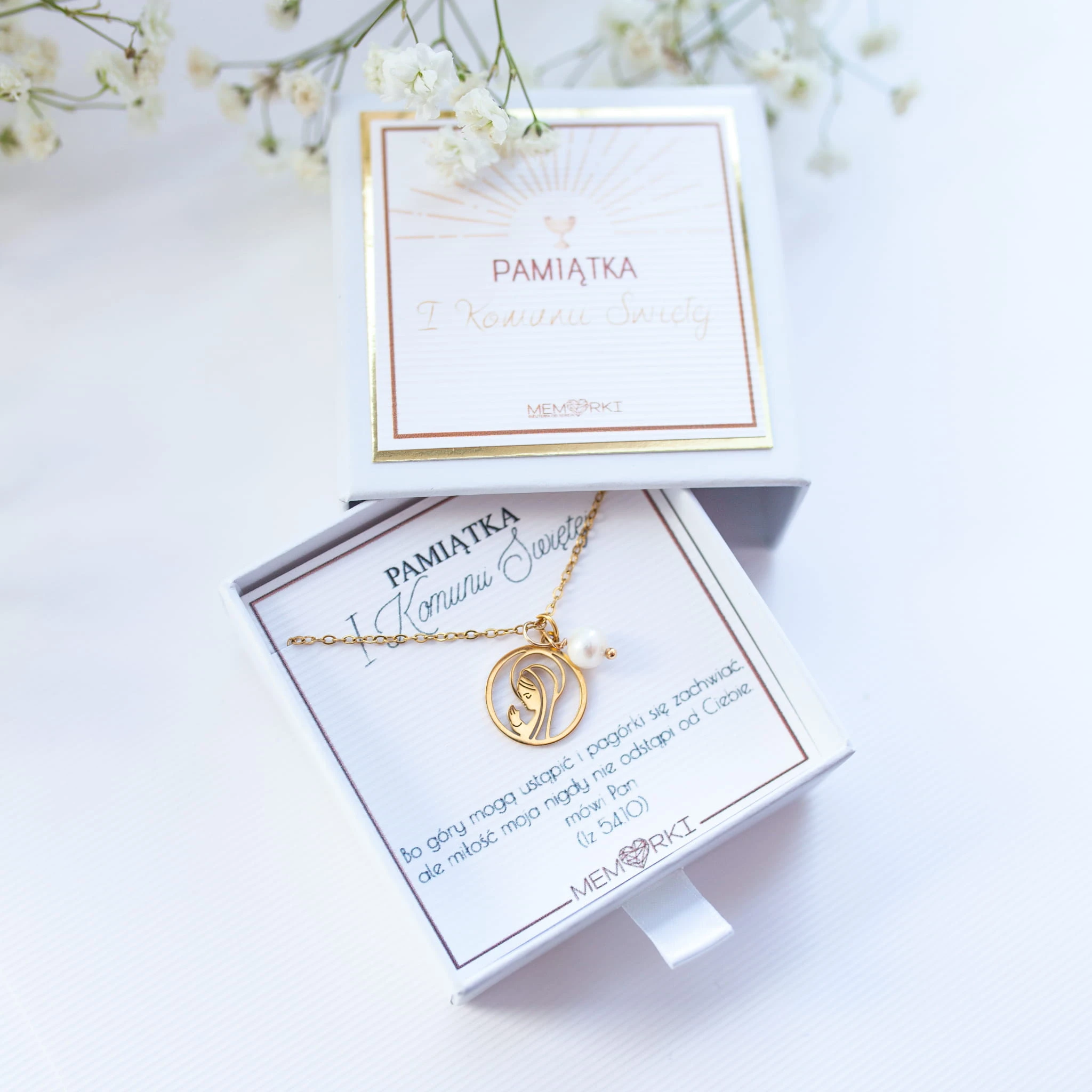Podaruj wyjątkową pamiątkę na Pierwszą Komunię Świętą – delikatny i symboliczny komplet biżuterii z medalikiem i perłą. To piękny upominek, który będzie towarzyszył dziecku przez lata, przypominając o tym ważnym dniu i otaczającej je miłości.