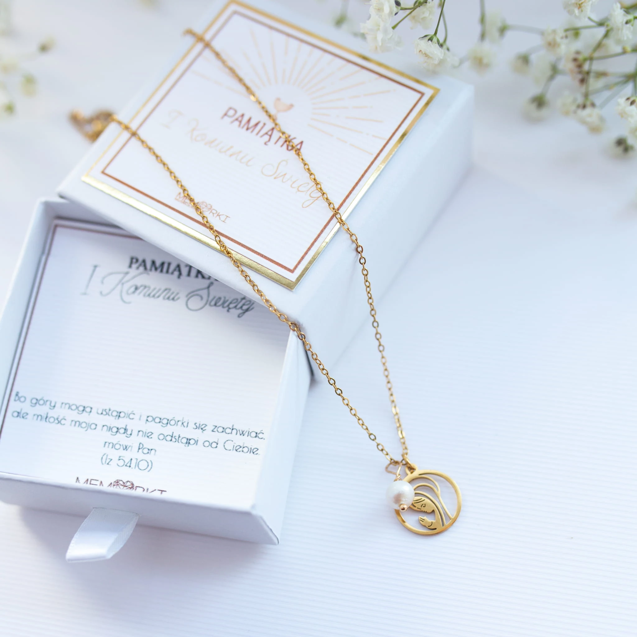 Pamiątka Komunijna ze stali szlachetnej i kamieni naturalnych – biżuteria z medalikiem Matki Boskiej i perłą naturalną.