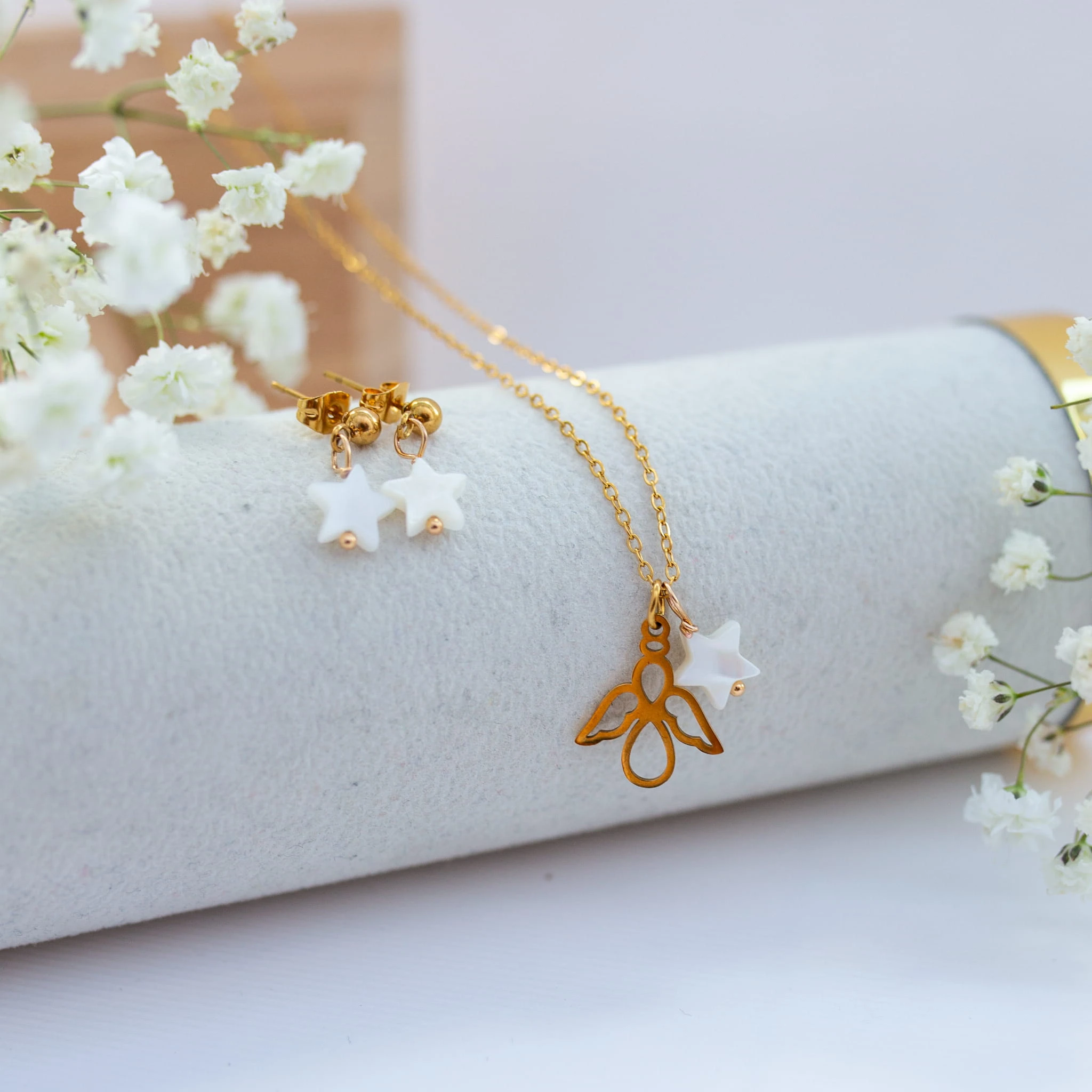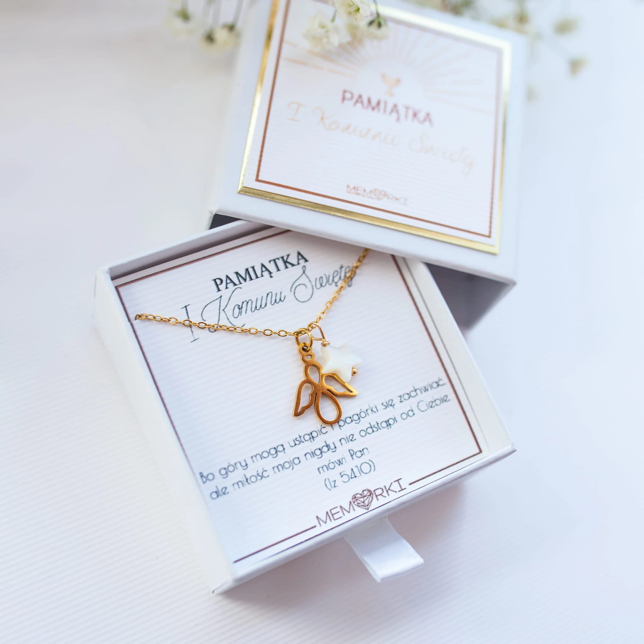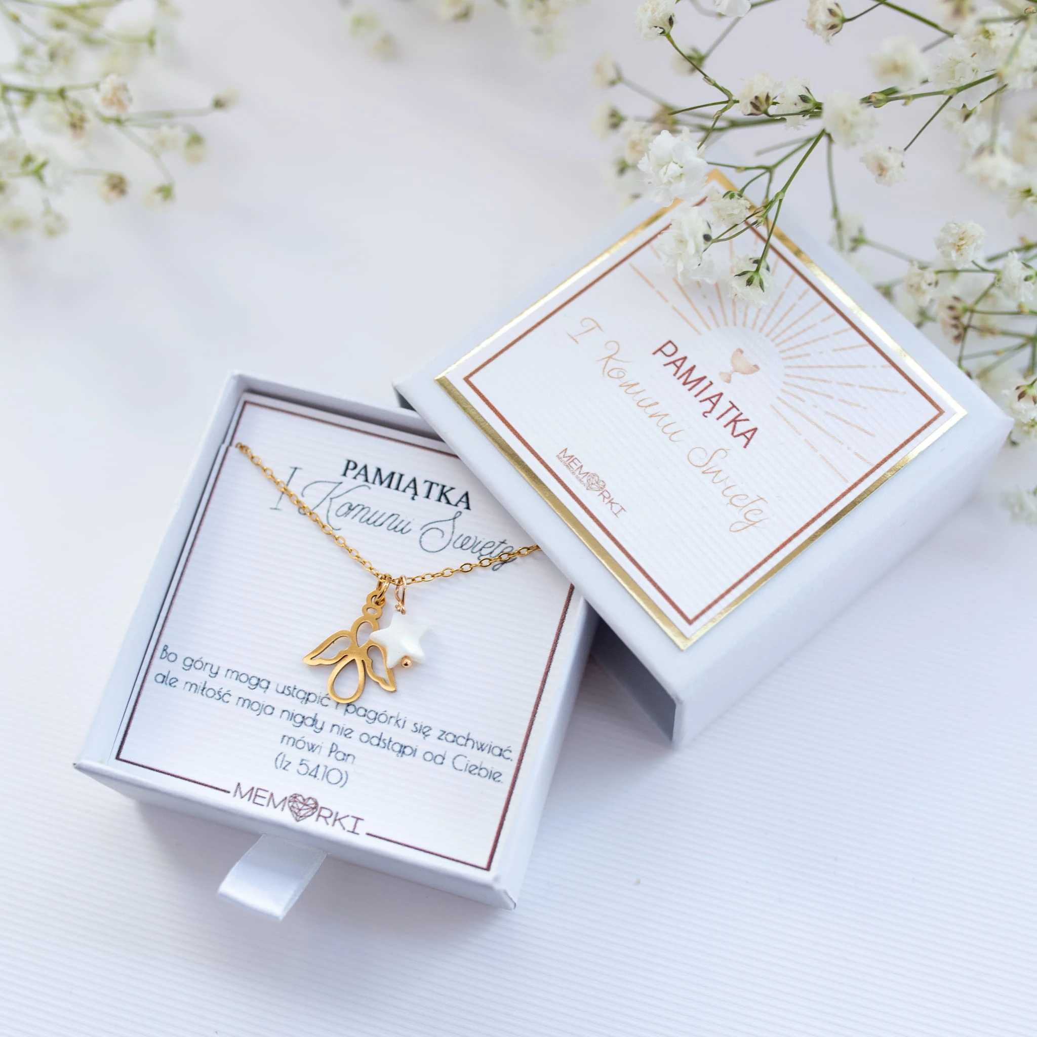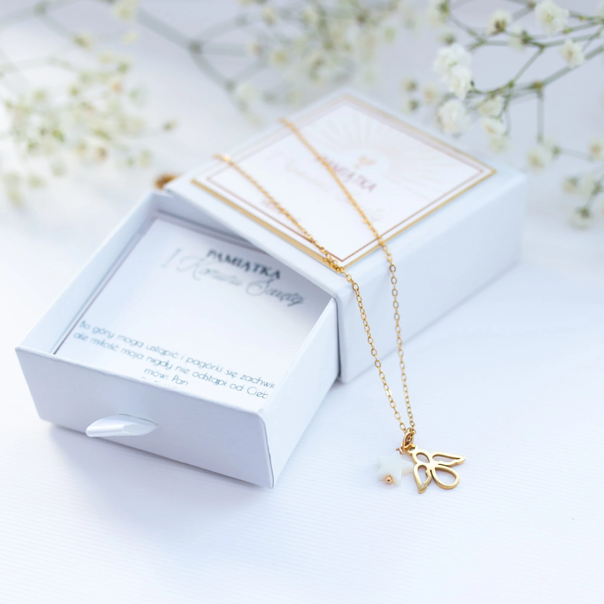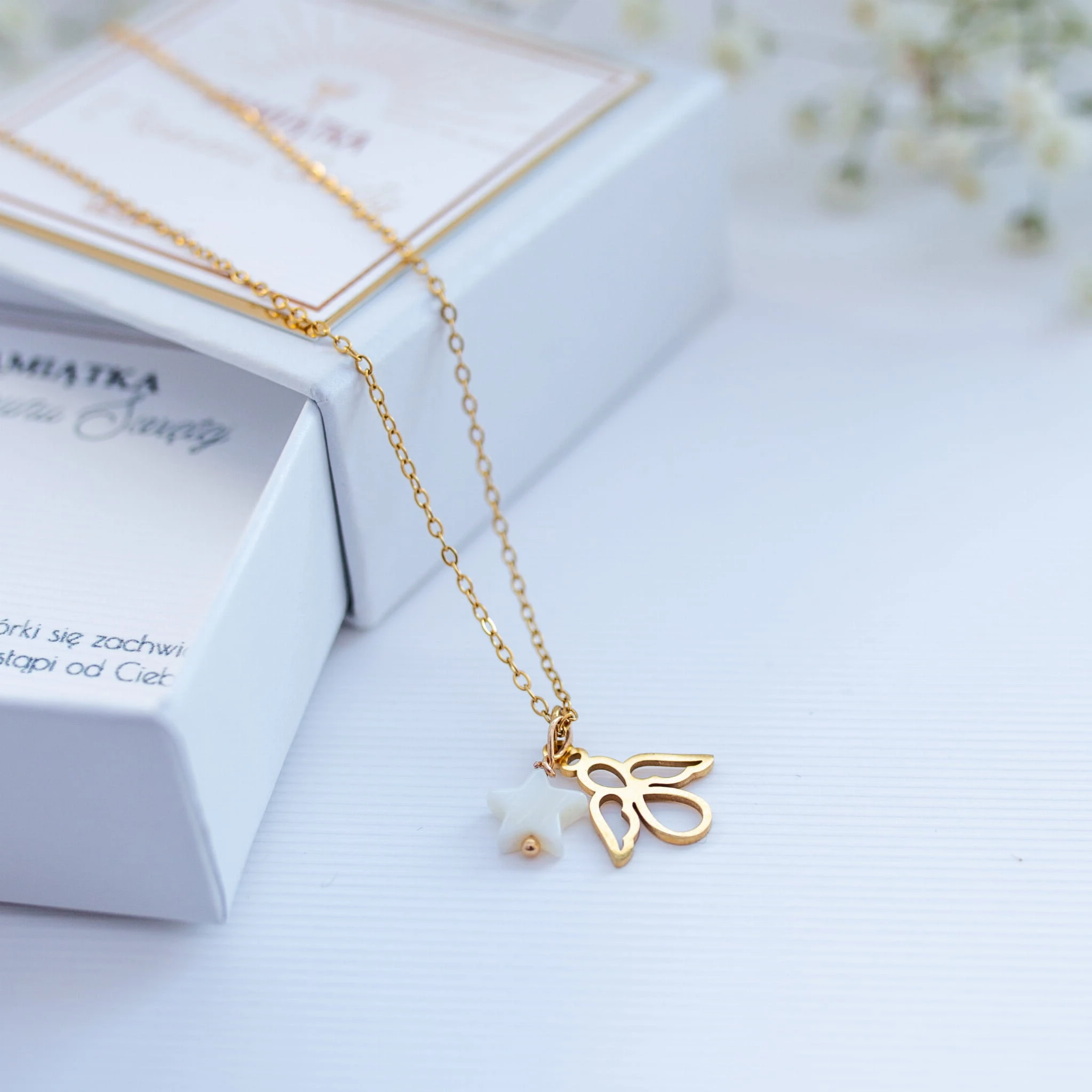 Pamiątka Komunijna ze stali szlachetnej i kamieni naturalnych – biżuteria z Krzyżykiem z masy perłowej i skrzydełkiem.