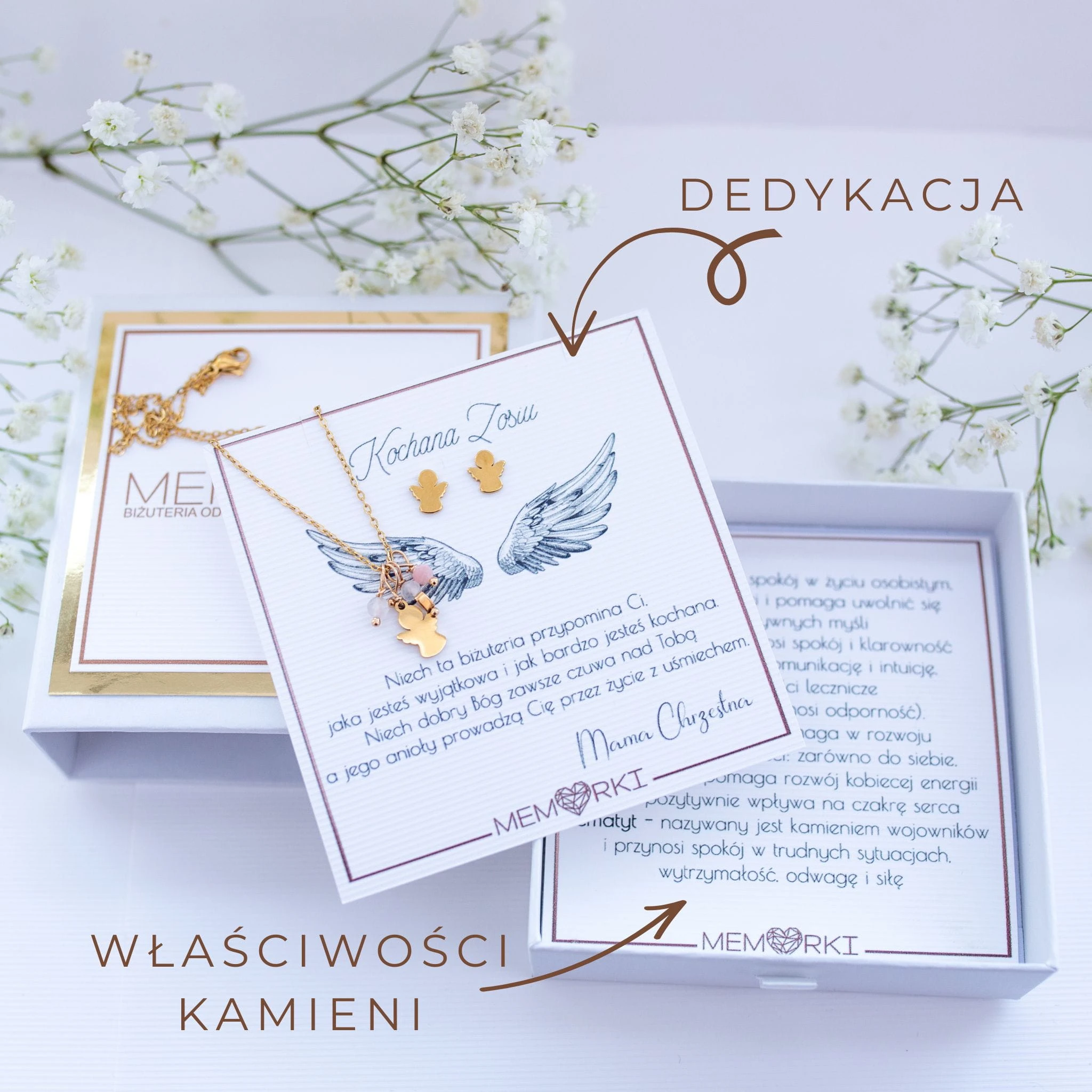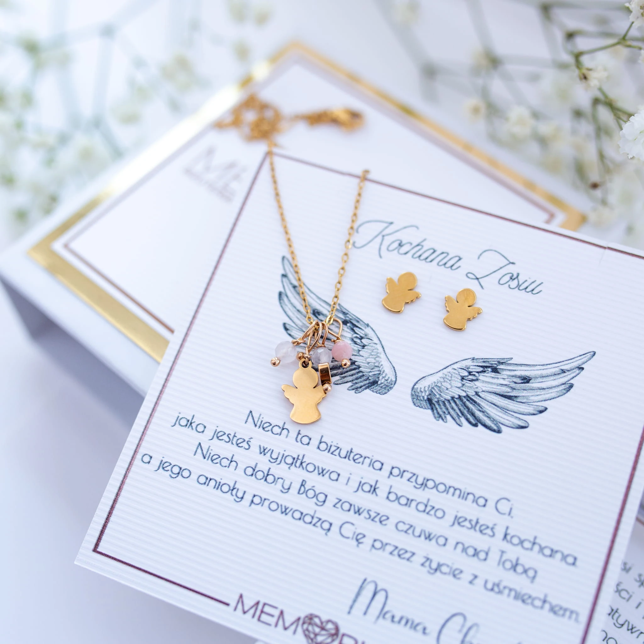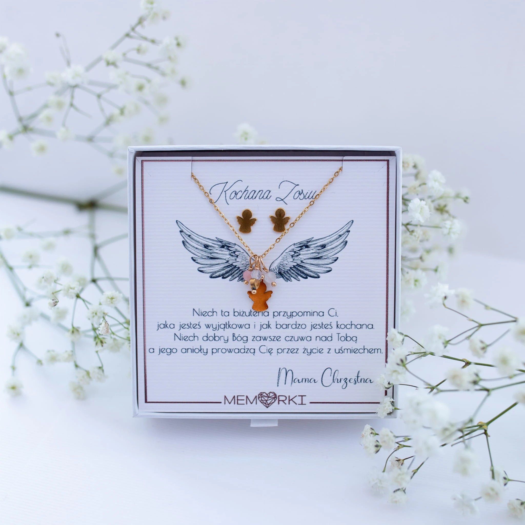 Pamiątka Komunijna ze stali szlachetnej i kamieni naturalnych – komplet ze stali szlachetnej i kamieni naturalnych z aniołkiem.