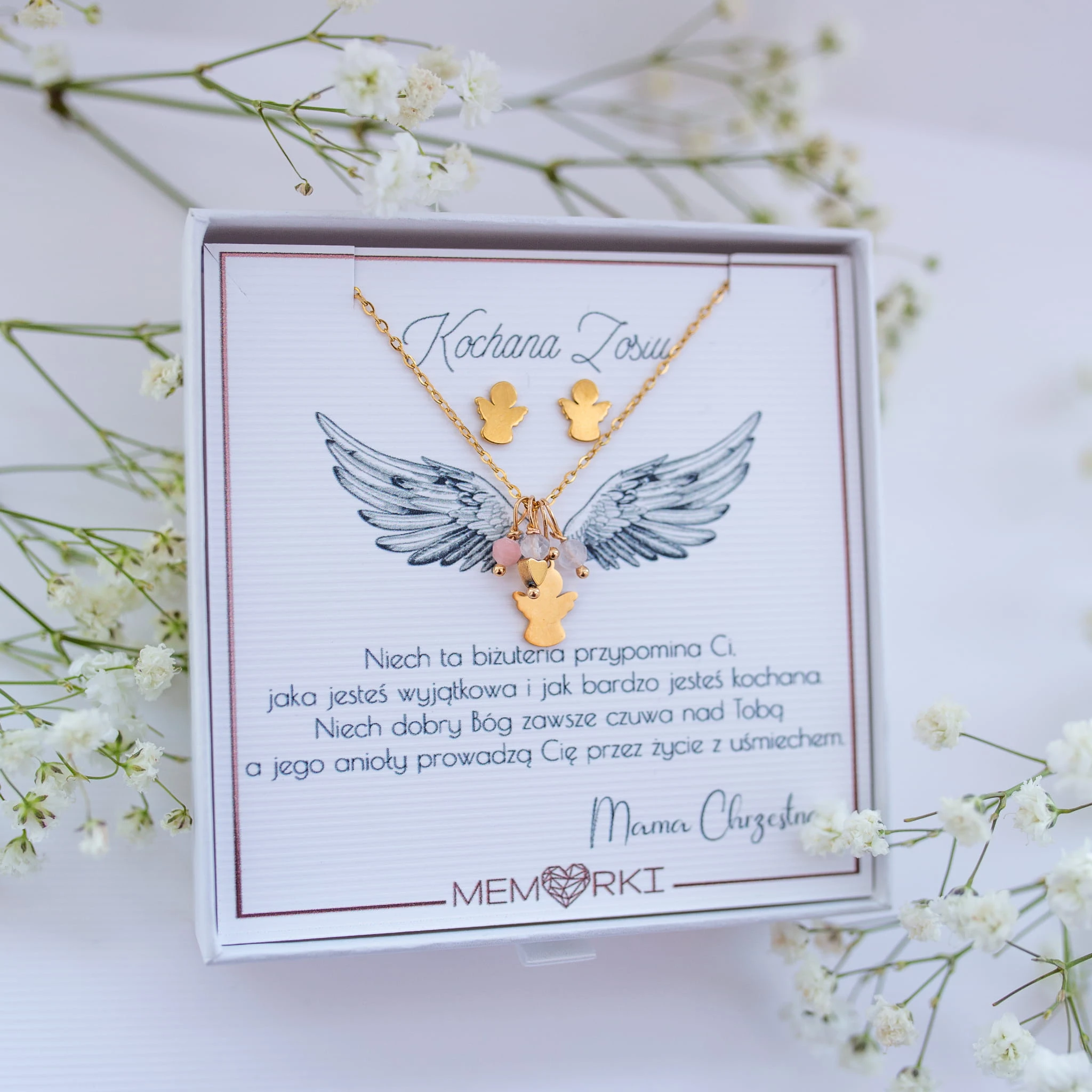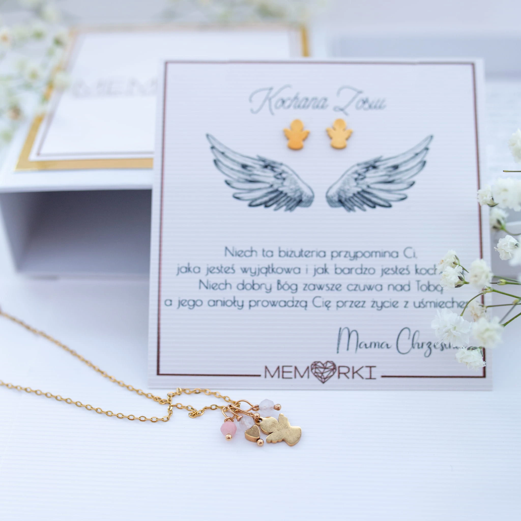 Pamiątka komunijna- łańcuszek z zawieszką i kolczyki aniołki ze stali